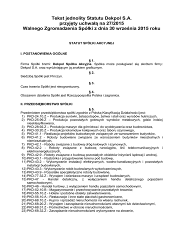 Tekst jednolity Statutu Dekpol S.A. przyjęty uchwałą na 27/2015 Walnego Zgromadzenia Spółki z dnia 30 września 2015 roku STATUT SPÓŁKI AKCYJNEJ I. POSTANOWIENIA OGÓLNE § 1. Firma Spółki brzmi: Dekpol Spółka Akcyjna. Spółka może posługiwać się skrótem firmy: Dekpol S.A. oraz wyróżniającym ją znakiem graficznym. § 2. Siedzibą Spółki jest Pinczyn. § 3. Czas trwania Spółki jest nieograniczony. § 4. Obszarem działania Spółki jest Rzeczypospolita Polska i zagranica. II. PRZEDSIĘBIORSTWO SPÓŁKI § 5. Przedmiotem przedsiębiorstwa spółki zgodnie z Polską Klasyfikacją Działalności jest: 1) PKD-24.10.Z – Produkcja surówki, żelazostopów, żeliwa i stali oraz wyrobów hutniczych, 2) PKD-25.99.Z – Produkcja pozostałych gotowych wyrobów metalowych, gdzie indziej niesklasyfikowana, 3) PKD-28.92.Z – Produkcja maszyn dla górnictwa i do wydobywania oraz budownictwa, 4) PKD-30.20.Z – Produkcja lokomotyw kolejowych oraz taboru szynowego, 5) PKD-41.1 - Realizacja projektów budowlanych związanych ze wznoszeniem budynków, 6) PKD-41.2 - Roboty budowlane związane ze wznoszeniem budynków mieszkalnych i niemieszkalnych, 7) PKD-42.1 - Roboty związane z budową dróg kołowych i szynowych, 8) PKD-42.2 - Roboty związane z budową rurociągów, linii telekomunikacyjnych i elektroenergetycznych, 9) PKD-42.9 - Roboty związane z budową pozostałych obiektów inżynierii lądowej i wodnej, 10) PKD-43.1 - Rozbiórka i przygotowanie terenu pod budowę, 11) PKD-43.2 - Wykonywanie instalacji elektrycznych, wodno-kanalizacyjnych i pozostałych instalacji budowlanych, 12) PKD-43.3 - Wykonywanie robót budowlanych wykończeniowych, 13) PKD-43.9 - Pozostałe specjalistyczne roboty budowlane, 14) PKD-77.32.Z - Wynajem i dzierżawa maszyn i urządzeń budowlanych, 15) PKD-47 - Handel detaliczny, z wyłączeniem handlu detalicznego pojazdami samochodowymi, 16) PKD-46 - Handel hurtowy, z wyłączeniem handlu pojazdami samochodowymi, 17) PKD-52.10.B - Magazynowanie i przechowywanie pozostałych towarów, 18) PKD-55.10.Z - Hotele i podobne obiekty zakwaterowania, 19) PKD-56.10.A - Restauracje i inne stałe placówki gastronomiczne, 20) PKD-68.10.Z - Kupno i sprzedaż nieruchomości na własny rachunek, 21) PKD-68.20.Z - Wynajem i zarządzanie nieruchomościami własnymi lub dzierżawionymi, 22) PKD-68.31.Z - Pośrednictwo w obrocie nieruchomościami, 23) PKD-68.32.Z - Zarządzanie nieruchomościami wykonywane na zlecenie, 24) PKD-77.12.Z - Wynajem i dzierżawa pozostałych pojazdów samochodowych, z wyłączeniem motocykli, 25) PKD -47.30.Z -Sprzedaż detaliczna paliw do pojazdów silnikowych na stacjach paliw, 26) PKD – 08.12.Z – Wydobywanie żwiru i piasku; wydobywanie gliny i kaolinu, 27) PKD – 09.90.Z – Działalność usługowa wspomagająca pozostałe górnictwo i wydobywanie, 28) PKD – 38.32.Z – Odzysk surowców z materiałów segregowanych, 29) PKD – 08.11.Z – Wydobywanie kamieni ozdobnych oraz kamienia dla potrzeb budownictwa, skał wapiennych, gipsu, kredy i łupków, 30) PKD – 23.61.Z – Produkcja wyrobów budowlanych z betonu, 31) PKD – 23.63.Z – Produkcja masy betonowej prefabrykowanej, 32) PKD – 23.64.Z – Produkcja zaprawy murarskiej, 33) PKD – 43.13.Z – Wykonywanie wykopów i wierceń geologiczno-inżynierskich, 34) PKD – 39.00.Z – Działalność związana z rekultywacją i pozostała działalność usługowa związana z gospodarką odpadami, 35) PKD – 66.19.Z – Pozostała działalność wspomagająca usługi finansowe, z wyłączeniem ubezpieczeń i funduszów emerytalnych, 36) PKD – 25.11.Z – Produkcja konstrukcji metalowych i ich części. § 6. Jeżeli podjęcie działalności w jakimkolwiek zakresie wymagać będzie koncesji lub innego zezwolenia, spółka jest zobowiązana uzyskać tę koncesję lub zezwolenie przed podjęciem tej działalności. § 7. Spółka może powoływać oddziały i przedstawicielstwa, jak również posiadać akcje, udziały oraz inne tytuły uczestnictwa w innych spółkach oraz innych organizacjach gospodarczych i społecznych na terenie kraju jak i za granicą. III. KAPITAŁY I FUNDUSZE SPÓŁKI § 8. 1. Kapitał zakładowy wynosi 8.362.549,00 zł (osiem milionów trzysta sześćdziesiąt dwa tysiące pięćset czterdzieści dziewięć złotych) i dzieli się na: a) 6.410.000 akcji zwykłych na okaziciela serii A o wartości nominalnej 1,00 zł (jeden złoty) każda, b) 1.952.549 akcji zwykłych na okaziciela serii B o wartości nominalnej 1,00 zł (jeden złoty) każda. 2. Akcje serii A i serii B dają równe prawo do dywidendy. 3. Akcje zostały w całości opłacone wkładami pieniężnymi, przy czym akcje serii A zostały objęte i pokryte w procesie przekształcenia spółki pod firmą: Dekpol Spółka z ograniczoną odpowiedzialnością z siedzibą w Pinczynie, zarejestrowanej pod numerem KRS 0000271884. 4. Akcje Spółki są akcjami wyłącznie na okaziciela. Zamiana akcji na akcje imienne jest niedopuszczalna. 1. 2. § 9. Na pokrycie straty w Spółce tworzy się kapitał zapasowy, do którego przelewane jest co najmniej 8% zysku za dany rok obrotowy, dopóki kapitał ten nie osiągnie co najmniej 1/3 wysokości kapitału zakładowego. W Spółce można tworzyć również kapitały rezerwowe na pokrycie szczególnych strat lub wydatków. Dany kapitał rezerwowy tworzy i określa jego cel uchwałą Walne Zgromadzenie. § 10. Walne Zgromadzenie może tworzyć fundusze celowe. Zasady gospodarowania środkami funduszów celowych określać będą regulaminy zatwierdzane przez Radę Nadzorczą. § 11. 1. Spółka może podwyższyć kapitał zakładowy w drodze emisji nowych akcji na okaziciela lub podwyższenia wartości nominalnej akcji już wyemitowanych. 2 2. Spółka może emitować obligacje, w szczególności obligacje zamienne na akcje oraz obligacje z prawem pierwszeństwa w obejmowaniu akcji nowej emisji, a także warranty subskrypcyjne. § 12. 1. Akcje Spółki mogą