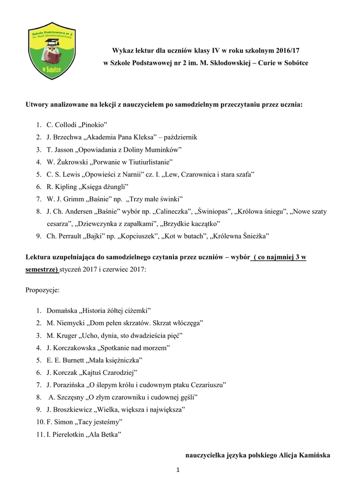 Wykaz lektur dla uczniów klasy IV w roku szkolnym 2016/17 w Szkole Podstawowej nr 2 im. M. Skłodowskiej – Curie w Sobótce Utwory analizowane na lekcji z nauczycielem po samodzielnym przeczytaniu przez ucznia: 1. C. Collodi „Pinokio” 2. J. Brzechwa „Akademia Pana Kleksa” – październik 3. T. Jasson „Opowiadania z Doliny Muminków” 4. W. Żukrowski „Porwanie w Tiutiurlistanie” 5. C. S. Lewis „Opowieści z Narnii” cz. I. „Lew, Czarownica i stara szafa” 6. R. Kipling „Księga dżungli” 7. W. J. Grimm „Baśnie” np. „Trzy małe świnki” 8. J. Ch. Andersen „Baśnie” wybór np. „Calineczka”, „Świniopas”, „Królowa śniegu”, „Nowe szaty cesarza”, „Dziewczynka z zapałkami”, „Brzydkie kaczątko” 9. Ch. Perrault „Bajki” np. „Kopciuszek”, „Kot w butach”, „Królewna Śnieżka” Lektura uzupełniająca do samodzielnego czytania przez uczniów – wybór ( co najmniej 3 w semestrze) styczeń 2017 i czerwiec 2017: Propozycje: 1. Domańska „Historia żółtej ciżemki” 2. M. Niemycki „Dom pełen skrzatów. Skrzat włóczęga” 3. M. Kruger „Ucho, dynia, sto dwadzieścia pięć” 4. J. Korczakowska „Spotkanie nad morzem” 5. E. E. Burnett „Mała księżniczka” 6. J. Korczak „Kajtuś Czarodziej” 7. J. Porazińska „O ślepym królu i cudownym ptaku Cezariuszu” 8. A. Szczęsny „O złym czarowniku i cudownej gęśli” 9. J. Broszkiewicz „Wielka, większa i największa” 10. F. Simon „Tacy jesteśmy” 11. I. Pierelotkin „Ala Betka” nauczycielka języka polskiego Alicja Kamińska 1