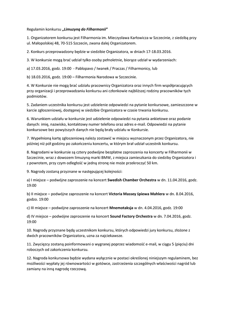 Regulamin konkursu „Limuzyną do Filharmonii” 1. Organizatorem konkursu jest Filharmonia im. Mieczysława Karłowicza w Szczecinie, z siedzibą przy ul. Małopolskiej 48, 70-515 Szczecin, zwana dalej Organizatorem. 2. Konkurs przeprowadzony będzie w siedzibie Organizatora, w dniach 17-18.03.2016. 3. W konkursie mogą brać udział tylko osoby pełnoletnie, biorące udział w wydarzeniach: a) 17.03.2016, godz. 19:00 - Pablopavo / Iwanek / Praczas / Filharmonicy, lub b) 18.03.2016, godz. 19:00 – Filharmonia Narodowa w Szczecinie. 4. W Konkursie nie mogą brać udziału pracownicy Organizatora oraz innych firm współpracujących przy organizacji i przeprowadzaniu konkursu ani członkowie najbliższej rodziny pracowników tych podmiotów. 5. Zadaniem uczestnika konkursu jest udzielenie odpowiedzi na pytanie konkursowe, zamieszczone w karcie zgłoszeniowej, dostępnej w siedzibie Organizatora w czasie trwania konkursu. 6. Warunkiem udziału w konkursie jest udzielenie odpowiedzi na pytania ankietowe oraz podanie danych: imię, nazwisko, kontaktowy numer telefonu oraz adres e-mail. Odpowiedzi na pytanie konkursowe bez powyższych danych nie będą brały udziału w Konkursie. 7. Wypełnioną kartę zgłoszeniową należy zostawić w miejscu wyznaczonym przez Organizatora, nie później niż pół godziny po zakończeniu koncertu, w którym brał udział uczestnik konkursu. 8. Nagrodami w konkursie są cztery podwójne bezpłatne zaproszenia na koncerty w Filharmonii w Szczecinie, wraz z dowozem limuzyną marki BMW, z miejsca zamieszkania do siedziby Organizatora i z powrotem, przy czym odległość w jedną stronę nie może przekroczyć 50 km. 9. Nagrody zostaną przyznane w następującej kolejności: a) I miejsce – podwójne zaproszenie na koncert Swedish Chamber Orchestra w dn. 11.04.2016, godz. 19:00 b) II miejsce – podwójne zaproszenie na koncert Victoria Massey śpiewa Mahlera w dn. 8.04.2016, godzo. 19:00 c) III miejsce – podwójne zaproszenie na koncert Mnemotaksja w dn. 4.04.2016, godz. 19:00 d) IV miejsce – podwójne zaproszenie na koncert Sound Factory Orchestra w dn. 7.04.2016, godz. 19:00 10. Nagrody przyznane będą uczestnikom konkursu, których odpowiedzi jury konkursu, złożone z dwóch pracowników Organizatora, uzna za najciekawsze. 11. Zwycięzcy zostaną poinformowani o wygranej poprzez wiadomość e-mail, w ciągu 5 (pięciu) dni roboczych od zakończenia konkursu. 12. Nagroda konkursowa będzie wydana wyłącznie w postaci określonej niniejszym regulaminem, bez możliwości wypłaty jej równowartości w gotówce, zastrzeżenia szczególnych właściwości nagród lub zamiany na inną nagrodę rzeczową. 13. Celem potwierdzenia chęci przyjęcia nagrody, powiadomiony zwycięzca powinien odpowiedzieć na wiadomość w terminie 3 (trzech) dni od dnia wysłania powiadomienia, pod rygorem przepadnięcia prawa do nagrody. 14. Uczestnicy konkursu wyrażają zgodę na przetwarzanie danych osobowych (zgodnie z ustawą z dnia 29 sierpnia 1997 r. o ochronie danych osobowych), zarówno dla celów organizacji i przeprowadzenia Konkursu, wyłonienia i powiadomienia zwycięzców oraz przekazania nagród, w szeroko pojętych celach marketingowych i promocyjnych działalności Organizatora także w celach statystycznych, analitycznych oraz nawiązywania kontaktu z właścicielem danych. 15. Zwycięzcy Konkursu wyrażają zgodę na rozpowszechnianie ich wizerunku utrwalonego podczas korzystania z nagród (zdjęcia, film) w związku z informacjami o konkursie. 16. Udzielenie odpowiedzi na zadane pytanie jest jednoznaczne z akceptacją powyższych warunków. 17. Filharmonia im. M. Karłowicza w Szczecinie informuje, iż dochód z tytułu wygranej zwolniony jest z podatku dochodowego od osób fizycznych (podstawa: art. 21 ust. 1 pkt 68 ustawy z dnia 26 lipca 1991 r. o podatku dochodowym od osób fizycznych; Dz. U. z 2012 r., poz. 361 ze zm.).