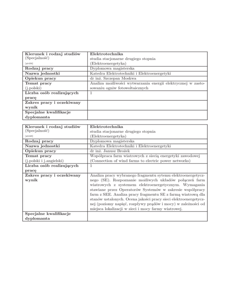 Kierunek i rodzaj studiów (Specjalność) [#450] Rodzaj pracy Nazwa jednostki Opiekun pracy Temat pracy (j.polski) Liczba osób realizujących pracę Zakres pracy i oczekiwany wynik Specjalne kwalifikacje dyplomanta Kierunek i rodzaj studiów (Specjalność) [#249] Rodzaj pracy Nazwa jednostki Opiekun pracy Temat pracy (j.polski i j.angielski) Liczba osób realizujących pracę Zakres pracy i oczekiwany wynik Specjalne kwalifikacje dyplomanta Elektrotechnika studia stacjonarne drugiego stopnia (Elektroenergetyka) Dyplomowa magisterska Katedra Elektrotechniki i Elektroenergetyki dr inż. Szczepan Moskwa Analiza możliwości wytwarzania energii elektrycznej w zastosowaniu ogniw fotowoltaicznych 1 Elektrotechnika studia stacjonarne drugiego stopnia (Elektroenergetyka) Dyplomowa magisterska Katedra Elektrotechniki i Elektroenergetyki dr inż. Janusz Brożek Współpraca farm wiatrowych z siecią energetyki zawodowej (Connection of wind farms to electric power networks) 1 Analiza pracy wybranego fragmentu sytemu elektroenergetycznego (SE). Rozpoznanie możliwych układów połączeń farm wiatrowych z systemem elektroenergetycznym. Wymagania stawiane przez Operatorów Systemów w zakresie współpracy farm z SEE. Analiza pracy fragmentu SE z farmą wiatrową dla stanów ustalonych. Ocena jakości pracy sieci elektroenergetycznej (poziomy napięć, rozpływy prądów i mocy) w zależności od miejsca lokalizacji w sieci i mocy farmy wiatrowej. Kierunek i rodzaj studiów (Specjalność) [#248] Rodzaj pracy Nazwa jednostki Opiekun pracy Temat pracy (j.polski i j.angielski) Liczba osób realizujących pracę Zakres pracy i oczekiwany wynik Elektrotechnika studia stacjonarne drugiego stopnia (Elektroenergetyka) Dyplomowa magisterska Katedra Elektrotechniki i Elektroenergetyki dr inż. Janusz Brożek Zastosowanie algorytmów genetycznych do projektowania struktur sieci elektroenergetycznych (Application of genetic algorithms for designing structures of electric power networks) 1 Zapoznanie się z możliwościami wykorzystania algorytmów genetycznych do projektowania optymalnych struktur sieci elektroenergetycznych. Utworzenie wybranych modeli sieci dystrybucyjnych. Przeprowadzenie obliczeń dedykowanymi programami. Porównanie otrzymanych wyników. Specjalne kwalifikacje dyplomanta Kierunek i rodzaj studiów (Specjalność) [#200] Rodzaj pracy Nazwa jednostki Opiekun pracy Temat pracy (j.polski i j.angielski) Liczba osób realizujących pracę Zakres pracy i oczekiwany wynik Specjalne kwalifikacje dyplomanta Elektrotechnika studia stacjonarne drugiego stopnia (Elektroenergetyka) Dyplomowa magisterska Katedra Elektrotechniki i Elektroenergetyki dr inż. Michał Daszczyszak Predykcja zapotrzebowania na energię elektryczną w sieci niskiego napięcia (The prediction of electrical energy demand in networks of low tension) 1 Praca zawierać będzie prezentację wybranej przez Autora metody do prognozowania zapotrzebowania na energię elektryczną w sieci niskiego napięcia oraz wyniki obliczeń wykonanych za pomocą prezentowanej metody dla wybranej sieci nn. Kierunek i rodzaj studiów (Specjalność) [#240] Rodzaj pracy Nazwa jednostki Opiekun pracy Temat pracy (j.polski i j.angielski) Liczba osób realizujących pracę Zakres pracy i oczekiwany wynik Elektrotechnika studia stacjonarne drugiego stopnia (Elektroenergetyka) Dyplomowa magisterska Katedra Elektrotechniki i Elektroenergetyki dr hab. inż., prof. n. Jakub Furgał Analiza przepięć wewnętrznych w transformatorach (Analysis of internal overvoltages in transformers) 1 Badania i obliczenia przepięć w uzwojeniach transformatora energetycznego oraz przepięć przenoszonych przez transformatory rozdzielcze średniego napięcia. Analiza narażeń przepięciowych układów izolacyjnych transformatorów oraz odbiorników energii elektrycznej niskiego napięcia opracowana na podstawie wyników badań przepięć. Specjalne kwalifikacje dyplomanta Kierunek i rodzaj studiów (Specjalność) [#220] Rodzaj pracy Nazwa jednostki Opiekun pracy Temat pracy (j.polski i j.angielski) Liczba osób realizujących pracę Zakres pracy i oczekiwany wynik Specjalne kwalifikacje dyplomanta Elektrotechnika studia stacjonarne drugiego stopnia (Elektroenergetyka) Dyplomowa magisterska Katedra Elektrotechniki i Elektroenergetyki dr inż. Wojciech Kraszewski Instalacje elektryczne dla budownictwa jednorodzinnego z wykorzystaniem źródeł odnawialnych (Electrical installations for single-family housing with the use of renewable sources) 1 1. Znajomość z zakresu projektowania instalacji elektrycznych, 2. Możliwości wykorzystania źródeł odnawialnych dla budownictwa jednorodzinnego, 3. Analiza ekonomiczna i techniczna opisywanego problemu, 4. Analiza otrzymanych wyników, wnioski końcowe. Dyplomant powinien posiadać dobrą znajomość zagadnień z zakresu projektowania instalacji elektrycznych i wykorzystania źródeł odnawialnych. Kierunek i rodzaj studiów (Specjalność) [#219] Rodzaj pracy Nazwa jednostki Opiekun pracy Temat pracy (j.polski i j.angielski) Liczba osób realizujących pracę Zakres pracy i oczekiwany wynik Specjalne kwalifikacje dyplomanta Kierunek i rodzaj studiów (Specjalność) [#217] Rodzaj pracy Nazwa jednostki Opiekun pracy Temat pracy (j.polski i j.angielski) Liczba osób realizujących pracę Zakres pracy i oczekiwany wynik Specjalne kwalifikacje dyplomanta Elektrotechnika studia stacjonarne drugiego stopnia (Elektroenergetyka) Dyplomowa magisterska Katedra Elektrotechniki i Elektroenergetyki dr inż. Wojciech Kraszewski Modelowanie rozkładu pola magnetycznego wokół aplikatorów stosowanych w rehabilitacji (Modeling of magnetic field distribution around the applicator used in the rehabilitation) 1 1. Znajomość z zakresu teorii pola elektromagnetycznego, 2. Zastosowanie pola magnetycznego w medycynie, 3. Symulacje komputerowe rozpatrywanego zagadnienia, 4. Analiza otrzymanych wyników, wnioski końcowe. Dyplomant powinien posiada