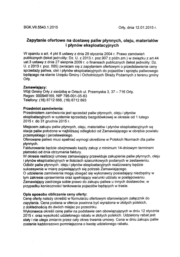 BGK.VII.5543.1.2015 Orły, dnia 12.01.2015 r. Zapytanie ofertowe na dostawę paliw płynnych, oleju, materiałów i płynów eksploatacyjnych W oparciu o art. 4 pkt 8 ustawy z dnia 29 stycznia 2004 r. Prawo zamówień publicznych (tekst jednolity: Dz. U. z 2013 r. poz.907 z późn.zm.) w związku z art.44 ust.3 ustawy z dnia 27 sierpnia 2009 r. o finansach publicznych (tekst jednolity: Dz. U. z 2013 r. póz. 885) zwracam się z zapytaniem ofertowym o przedstawienie ceny sprzedaży paliwa, olei i płynów eksploatacyjnych do pojazdów i sprzętu paliwowego będącego na stanie Urzędu Gminy i Ochotniczych Straży Pożarnych z terenu gminy Orły. Zamawiający: Wójt Gminy Orły z siedzibą w Orłach ul. Przemyska 3, 37-716 Orły. Regon: 000548169, NIP 795-001-05-83 Telefony: (16) 6712 668, (16) 6712 693 Przedmiot zamówienia: Przedmiotem zamówienia jest sprzedaż paliw płynnych, oleju i płynów eksploatacyjnych w systemie sprzedaży bezgotówkowej w okresie od 1 lutego 2015 r. do 31 grudnia 2015 r. Miejscem zakupu paliw płynnych, oleju, materiałów i płynów eksploatacyjnych są stacje paliw położone w najbliższej odległości od Zamawiającego w obrębie powiatu przemyskiego i jarosławskiego. Oferowane paliwo musi spełniać wymogi określone w Polskich Normach dla paliw płynnych. Fakturowanie będzie obejmowało każdy zakup z minimum 14-dniowym terminem płatności od dnia otrzymania faktury. W okresie realizacji umowy zamawiający przewiduje zakupienie paliw płynnych, oleju i płynów eksploatacyjnych w ilościach szacunkowych podanych w zestawieniu. Odbiór paliw płynnych, oleju i płynów eksploatacyjnych realizowany będzie sukcesywnie w miarę pojawiających się potrzeb Zamawiającego. O udzielenie zamówienia mogą ubiegać się wykonawcy posiadający niezbędny w tym zakresie uprawnienia oraz spełniający warunki udziału w postępowaniu. Zamawiający zastrzega sobie prawo do zakupu paliwa u innych dostawców, w przypadku konieczności tankowania pojazdów będących w trasie. Opis sposobu obliczenia ceny oferty: Cenę oferty należy określić w formularzu ofertowym stanowiącym załącznik do zapytania. Cena podana w ofercie powinna być wyrażona w złotych polskich, z dokładnością do dwóch miejsc po przecinku. Wykonawca określi cenę paliw na podstawie cen obowiązujących w dniu 12 stycznia 2015 r. oraz wysokość udzielonego rabatu w złotych polskich. Udzielony rabat jest stały i nie ulega zmianie przez cały okres trwania umowy. Cena w dniu zakupu paliw zostanie każdorazowo pomniejszona o kwotę udzielonego rabatu. Sposób przygotowania oferty: 1.Wykonawca powinien sporządzić ofertę na wymaganym formularzu ofertowym, podając cenę jednostkową netto, podatek VAT, cenę brutto oraz określić wysokość stałego rabatu na zakup 1 litra paliwa. Oferta winna zawierać nazwę i adres wykonawcy oraz podpis osoby uprawnionej lub upoważnionej do występowania w imieniu wykonawcy, przy czym podpis musi być czytelny lub podpisany pieczęcią imienną. 2.Jako wymagany załącznik do formularza ofertowego, wykonawca winien załączyć: 1/ podpisane oświadczenie dotyczące jakości oferowanego paliwa, 21 dokument potwierdzający cenę sprzedaży oleju napędowego i benzyny bezołowiowej Pb 95 w dniu 12 stycznia 2015 r. Miejsce i termin złożenia oferty: Ofertę należy złożyć do dnia 22 stycznia 2015 r. do godz.15.00 w siedzibie Urzędu Gminy w Orłach, ul. Przemyska 3, 37-716 Orły - biuro podawcze l piętro lub przesłać faksem na nr (16) 736 24 34. Kryterium wyboru oferty: Cena paliwa 40 % Rabat 60 % Zestawienie zapotrzebowania na paliwo płynne, oleje i płyny eksploatacyjne w roku kalendarzowym: Asortyment Lp. 1 Benzyna bezołowiowa Pb 95 2 Olej napędowy Olej do sporządzania mieszanki paliwowej do 3 sprzętu silnikowego będącego na stanie OSP 4 Olej do przygotowania mieszanek paliwowych do kosiarek spalinowych Płyn do spryskiwaczy letni - 5 l 5 6 Płyn do spryskiwaczy zimowy 5 l 7 Olej do przygotowania mieszanek paliwowych do kosiarek spalinowych Ilość (litry) 6800 9100 20 15 50 50 100 mgr