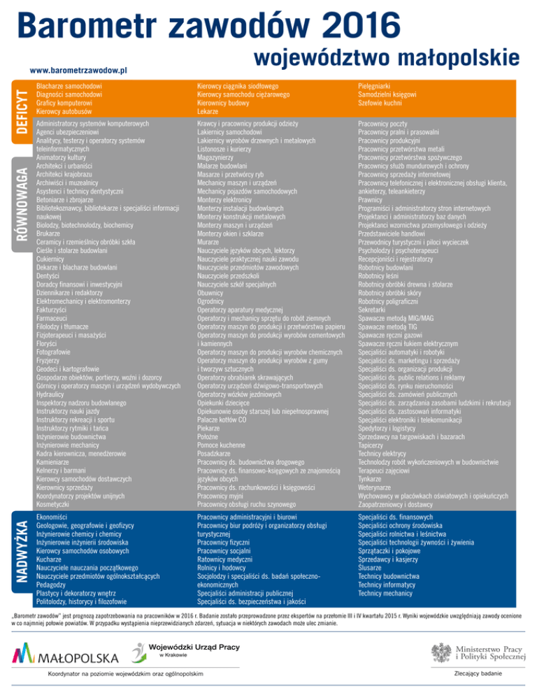 Barometr zawodów 2016 województwo małopolskie NADWYŻKA RÓWNOWAGA DEFICYT www.barometrzawodow.pl Blacharze samochodowi Diagności samochodowi Graficy komputerowi Kierowcy autobusów Kierowcy ciągnika siodłowego Kierowcy samochodu ciężarowego Kierownicy budowy Lekarze Pielęgniarki Samodzielni księgowi Szefowie kuchni Administratorzy systemów komputerowych Agenci ubezpieczeniowi Analitycy, testerzy i operatorzy systemów teleinformatycznych Animatorzy kultury Architekci i urbaniści Architekci krajobrazu Archiwiści i muzealnicy Asystenci i technicy dentystyczni Betoniarze i zbrojarze Bibliotekoznawcy, bibliotekarze i specjaliści informacji naukowej Biolodzy, biotechnolodzy, biochemicy Brukarze Ceramicy i rzemieślnicy obróbki szkła Cieśle i stolarze budowlani Cukiernicy Dekarze i blacharze budowlani Dentyści Doradcy finansowi i inwestycyjni Dziennikarze i redaktorzy Elektromechanicy i elektromonterzy Fakturzyści Farmaceuci Filolodzy i tłumacze Fizjoterapeuci i masażyści Floryści Fotografowie Fryzjerzy Geodeci i kartografowie Gospodarze obiektów, portierzy, woźni i dozorcy Górnicy i operatorzy maszyn i urządzeń wydobywczych Hydraulicy Inspektorzy nadzoru budowlanego Instruktorzy nauki jazdy Instruktorzy rekreacji i sportu Instruktorzy rytmiki i tańca Inżynierowie budownictwa Inżynierowie mechanicy Kadra kierownicza, menedżerowie Kamieniarze Kelnerzy i barmani Kierowcy samochodów dostawczych Kierownicy sprzedaży Koordynatorzy projektów unijnych Kosmetyczki Krawcy i pracownicy produkcji odzieży Lakiernicy samochodowi Lakiernicy wyrobów drzewnych i metalowych Listonosze i kurierzy Magazynierzy Malarze budowlani Masarze i przetwórcy ryb Mechanicy maszyn i urządzeń Mechanicy pojazdów samochodowych Monterzy elektronicy Monterzy instalacji budowlanych Monterzy konstrukcji metalowych Monterzy maszyn i urządzeń Monterzy okien i szklarze Murarze Nauczyciele języków obcych, lektorzy Nauczyciele praktycznej nauki zawodu Nauczyciele przedmiotów zawodowych Nauczyciele przedszkoli Nauczyciele szkół specjalnych Obuwnicy Ogrodnicy Operatorzy aparatury medycznej Operatorzy i mechanicy sprzętu do robót ziemnych Operatorzy maszyn do produkcji i przetwórstwa papieru Operatorzy maszyn do produkcji wyrobów cementowych i kamiennych Operatorzy maszyn do produkcji wyrobów chemicznych Operatorzy maszyn do produkcji wyrobów z gumy i tworzyw sztucznych Operatorzy obrabiarek skrawających Operatorzy urządzeń dźwigowo-transportowych Operatorzy wózków jezdniowych Opiekunki dziecięce Opiekunowie osoby starszej lub niepełnosprawnej Palacze kotłów CO Piekarze Położne Pomoce kuchenne Posadzkarze Pracownicy ds. budownictwa drogowego Pracownicy ds. finansowo-księgowych ze znajomością języków obcych Pracownicy ds. rachunkowości i księgowości Pracownicy myjni Pracownicy obsługi ruchu szynowego Pracownicy poczty Pracownicy pralni i prasowalni Pracownicy produkcyjni Pracownicy przetwórstwa metali Pracownicy przetwórstwa spożywczego Pracownicy służb mundurowych i ochrony Pracownicy sprzedaży internetowej Pracownicy telefonicznej i elektronicznej obsługi klienta, ankieterzy, teleankieterzy Prawnicy Programiści i administratorzy stron internetowych Projektanci i administratorzy baz danych Projektanci wzornictwa przemysłowego i odzieży Przedstawiciele handlowi Przewodnicy turystyczni i piloci wycieczek Psycholodzy i psychoterapeuci Recepcjoniści i rejestratorzy Robotnicy budowlani Robotnicy leśni Robotnicy obróbki drewna i stolarze Robotnicy obróbki skóry Robotnicy poligraficzni Sekretarki Spawacze metodą MIG/MAG Spawacze metodą TIG Spawacze ręczni gazowi Spawacze ręczni łukiem elektrycznym Specjaliści automatyki i robotyki Specjaliści ds. marketingu i sprzedaży Specjaliści ds. organizacji produkcji Specjaliści ds. public relations i reklamy Specjaliści ds. rynku nieruchomości Specjaliści ds. zamówień publicznych Specjaliści ds. zarządzania zasobami ludzkimi i rekrutacji Specjaliści ds. zastosowań informatyki Specjaliści elektroniki i telekomunikacji Spedytorzy i logistycy Sprzedawcy na targowiskach i bazarach Tapicerzy Technicy elektrycy Technolodzy robót wykończeniowych w budownictwie Terapeuci zajęciowi Tynkarze Weterynarze Wychowawcy w placówkach oświatowych i opiekuńczych Zaopatrzeniowcy i dostawcy Ekonomiści Geologowie, geografowie i geofizycy Inżynierowie chemicy i chemicy Inżynierowie inżynierii środowiska Kierowcy samochodów osobowych Kucharze Nauczyciele nauczania początkowego Nauczyciele przedmiotów ogólnokształcących Pedagodzy Plastycy i dekoratorzy wnętrz Politolodzy, historycy i filozofowie Pracownicy administracyjni i biurowi Pracownicy biur podróży i organizatorzy obsługi turystycznej Pracownicy fizyczni Pracownicy socjalni Ratownicy medyczni Rolnicy i hodowcy Socjolodzy i specjaliści ds. badań społecznoekonomicznych Specjaliści administracji publicznej Specjaliści ds. bezpieczeństwa i jakości Specjaliści ds. finansowych Specjaliści ochrony środowiska Specjaliści rolnictwa i leśnictwa Specjaliści technologii żywności i żywienia Sprzątaczki i pokojowe Sprzedawcy i kasjerzy Ślusarze Technicy budownictwa Technicy informatycy Technicy mechanicy „Barometr zawodów” jest prognozą zapotrzebowania na pracowników w 2016 r. Badanie zostało przeprowadzone przez ekspertów na przełomie III i IV kwartału 2015 r. Wyniki wojewódzkie uwzględniają zawody ocenione w co najmniej połowie powiatów. W przypadku wystąpienia nieprzewidzianych zdarzeń, sytuacja w niektórych zawodach może ulec zmianie. Koordynator na poziomie wojewódzkim oraz ogólnopolskim Zlecający badanie