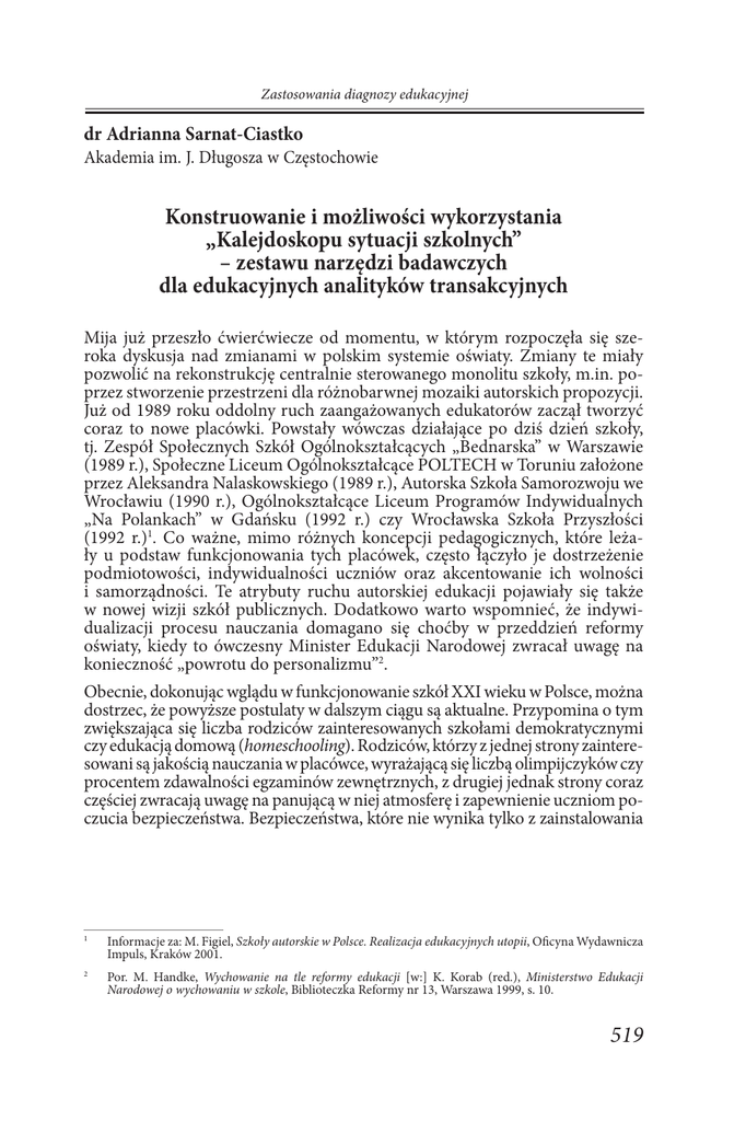 Zastosowania diagnozy edukacyjnej dr Adrianna Sarnat-Ciastko Akademia im. J. Długosza w Częstochowie Konstruowanie i możliwości wykorzystania „Kalejdoskopu sytuacji szkolnych” – zestawu narzędzi badawczych dla edukacyjnych analityków transakcyjnych Mija już przeszło ćwierćwiecze od momentu, w którym rozpoczęła się szeroka dyskusja nad zmianami w polskim systemie oświaty. Zmiany te miały pozwolić na rekonstrukcję centralnie sterowanego monolitu szkoły, m.in. poprzez stworzenie przestrzeni dla różnobarwnej mozaiki autorskich propozycji. Już od 1989 roku oddolny ruch zaangażowanych edukatorów zaczął tworzyć coraz to nowe placówki. Powstały wówczas działające po dziś dzień szkoły, tj. Zespół Społecznych Szkół Ogólnokształcących „Bednarska” w Warszawie (1989 r.), Społeczne Liceum Ogólnokształcące POLTECH w Toruniu założone przez Aleksandra Nalaskowskiego (1989 r.), Autorska Szkoła Samorozwoju we Wrocławiu (1990 r.), Ogólnokształcące Liceum Programów Indywidualnych „Na Polankach” w Gdańsku (1992 r.) czy Wrocławska Szkoła Przyszłości (1992 r.)1. Co ważne, mimo różnych koncepcji pedagogicznych, które leżały u podstaw funkcjonowania tych placówek, często łączyło je dostrzeżenie podmiotowości, indywidualności uczniów oraz akcentowanie ich wolności i samorządności. Te atrybuty ruchu autorskiej edukacji pojawiały się także w nowej wizji szkół publicznych. Dodatkowo warto wspomnieć, że indywidualizacji procesu nauczania domagano się choćby w przeddzień reformy oświaty, kiedy to ówczesny Minister Edukacji Narodowej zwracał uwagę na konieczność „powrotu do personalizmu”2. Obecnie, dokonując wglądu w funkcjonowanie szkół XXI wieku w Polsce, można dostrzec, że powyższe postulaty w dalszym ciągu są aktualne. Przypomina o tym zwiększająca się liczba rodziców zainteresowanych szkołami demokratycznymi czy edukacją domową (homeschooling). Rodziców, którzy z jednej strony zainteresowani są jakością nauczania w placówce, wyrażającą się liczbą olimpijczyków czy procentem zdawalności egzaminów zewnętrznych, z drugiej jednak strony coraz częściej zwracają uwagę na panującą w niej atmosferę i zapewnienie uczniom poczucia bezpieczeństwa. Bezpieczeństwa, które nie wynika tylko z zainstalowania Informacje za: M. Figiel, Szkoły autorskie w Polsce. Realizacja edukacyjnych utopii, Oficyna Wydawnicza Impuls, Kraków 2001. Por. M. Handke, Wychowanie na tle reformy edukacji [w:] K. Korab (red.), Ministerstwo Edukacji Narodowej o wychowaniu w szkole, Biblioteczka Reformy nr 13, Warszawa 1999, s. 10. 1 2 519 XXI Konferencja Diagnostyki Edukacyjnej, Bydgoszcz 2015 monitoringu, a z dobrych relacji3. W tej perspektywie to właśnie relacje szkolne stanowią przedmiot zainteresowania Zespołu Badawczego Edukacyjnej Analizy Transakcyjnej, który zdecydował się na stworzenie narzędzia badawczego pozwalającego na ich diagnozę. Opis owego narzędzia – „Kalejdoskopu sytuacji szkolnych” stanowi przedmiot niniejszego artykułu. Analiza transakcyjna jako źródło inspiracji do badań edukacyjnych Analiza transakcyjna (AT) stanowi, stworzoną przez Erica Berne’a w latach 50., koncepcję opartą na teoretycznym systemie osobowości, służącemu z jednej strony systematycznej psychoterapii prowadzącej do osobistego rozwoju i zmiany4, ale także interpretowaniu stosunków międzyludzkich5. AT w dużej mierze czerpie swoje źródło z psychoanalizy, jak również psychologii uczenia się, psychologii postaci oraz psychologii humanistycznej. Różni się jednak od wymienionych podejść specyficznym, obrazowym, czerpiącym ze słownictwa potocznego językiem, który ułatwiać ma komunikację z pacjentem/klientem, a także ujęciem szeregu aspektów ontogenezy człowieka. Uniwersalny przekaz AT, zasadzający się na następujących założeniach: „(1) Ludzie są OK; (2) Każdy ma zdolność do myślenia; (3) Ludzie mogą decydować o swoim przeznaczeniu, a ich decyzje mogą być zmieniane”6, pozwolił ostatecznie na wykorzystywanie jej nie tylko w praktyce psychoterapeutycznej. Koncepcja ta z powodzeniem stosowana jest również w innych obszarach: doradczym (counselling), organizacyjnym (organizational) i edukacyjnym (educational)7. Analiza transakcyjna od momentu swojego powstania zainteresowała i nadal interesuje wielu praktyków oraz badaczy z całego świata, w tym także z Polski8. Jest to widoczne w międzynarodowych periodykach, pozwalających na wymianę myśli, doświadczeń, recenzji czy rekomendacji, przyczyniających się do dalszego rozwoju tej koncepcji9. Warto tutaj wspomnieć o procesie wdrażania do placówek publicznych tutoringu szkolnego, który w znacznej mierze stanowić ma alternatywę dla wychowawstwa klasowego. Por. A. Sarnat-Ciastko, Tutor a wychowawca – rzeczywistość nadana czy wybrana? [w:] A. Gofron, B. Łukasik (red.), Podstawy edukacji – podmiot w dyskursie pedagogicznym, Oficyna Wydawnicza Impuls, Kraków 2010; A. SarnatCiastko, Tutoring a czas. Strukturalizacja czasu w opinii tutorów szkolnych z perspektywy edukacyjnej analizy transakcyjnej [w:] „Forum Oświatowe”, nr 2 (49), Wrocław 2013. I. Stewart, V. Jones, TA Today. A New Introduction to Transactional Analysis, Nottingham and Chapel Hill 1987, s. 3. R. Rogoll, Aby być sobą. Wprowadzenie do analizy transakcyjnej, PWN, Warszawa 2010, s. 12. I. Stewart, V. Jones, dz. cyt., s. 6 (tłumaczenie własne). Por. Th. Ohlsson, Scientific evidence base for transactional analysis in the year 2010 [w:] „International Journal of Transactional Analysis Research”, 1: 1, 2010, s. 6. Istnieją międzynarodowe organizacje zajmujące się szerzeniem idei Erica Berne’a, a także zapewniające dbałość o organizację szkoleń dla jej praktyków – analityków transakcyjnych. Wśród owych organizacji znajdą się m.in.: International Transactional Analysis Association (ITAA); Europea