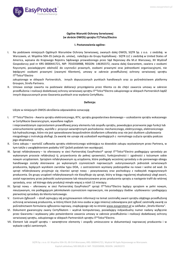 www.easyprotect.pl OgólneWarunkiOchronySerwisowej (wskrócieOWOS)sprzętuIT/Telco/Electro I. II. I. II. III. IV. V. VI. VII. I.Postanowieniaogólne: Na podstawie niniejszych Ogólnych Warunków Ochrony Serwisowej, zwanych dalej OWOS, SQTR Sp. z o.o. z siedzibą w Warszawie,ul.Wspólna50A-35(sekcjads.umów),należącadoGrupyKapitałowej-SQTRLLCzsiedzibąwUnitedStatesof America, wpisana do Krajowego Rejestru Sądowego prowadzonego przez Sąd Rejonowy dla M.st Warszawy, XII Wydział Gospodarczy pod nr KRS 0000441721, NIP: 7010358988, REGON: 146392372, zwana dalej Gwarantem, zawiera z osobami fizycznymi, posiadającymi zdolność do czynności prawnych, osobami prawnymi oraz jednostkami organizacyjnymi, nie będącymi osobami prawnymi (zwanymi Klientem), umowy w zakresie przedłużonej ochrony serwisowej sprzętu IT*Telco*Electro zakupionego w sklepach Partnerskich, innych dopuszczonych punktach handlowych oraz za pośrednictwem platformy Groupon,StrefaPartnera. Umowa zostaje zawarta na podstawie deklaracji przystąpienia przez Klienta co do chęci zawarcia umowy w zakresie przedłużeniairealizacjidodatkowejochronyserwisowejsprzętuIT*Telco*ElectrozakupionegowsklepachPartnerskichbądź innychdopuszczonychprzezGwarantapunktachorazwydaniaCertyfikatu. Definicje: UżytewniniejszychOWOSokreśleniaodpowiedniooznaczają: IT*Telco*Electro-Awariasprzętuelektronicznego,RTV,sprzętugospodarstwadomowego–uszkodzeniesprzętuwskazanego wCertyfikacieGwarancyjnym,wywołanenagłym inieprzewidzianymzaprzestaniemprawidłowejpracyelementulubzespołusprzętu,powodująceprzerwaniejegofunkcjilub unieruchomieniesprzętu,wynikłezprzyczynwewnętrznychpochodzenia:mechanicznego,elektrycznego,elektronicznego lubhydraulicznego,któreniejestspowodowanebezpośrednimdziałaniemczłowiekaorazniejestskutkiemużytkowania niezgodnegozinstrukcjąobsługi.Zaawarięnieuznajesięuszkodzeńwynikającychznormalnegozużyciasprzętupodczas jegoeksploatacji. Cenazakupu–wartośćcałkowitasprzętuelektronicznegowidniejącanadowodziezakupuwystawionymprzezPartnera,w tymtakżezuwzględnieniempodatkuVAT(jeżelipodatektenwystępuje). Sprzęt refabrykowany– to oferowany w sieci Partnerskiej EasyProtect® sprzęt IT*Telco*Electro podlegający sprzedaży po wykonanym procesie refabrykacji tj. przywrócenia do pełnej sprawności, funkcjonalności i zgodności z tożsamym sobie nowymurządzeniem.Sprzętemrefabrykowanymsąurządzenia,którepodlegaływcześniejsprzedażyadoponownegoobiegu handlowego zostały skierowane po wykonanych czynnościach naprawczych autoryzowanych jednostek serwisowych producenta, będących wynikiem zwrotów typu DOA, z zastrzeżeniem wymiany podzespołów na nowe i wolne od wad. Za sprzęt refabrykowany przyjmuje się również sprzęt nowy - powystawowy oraz pochodzący z nadwyżek magazynowych producenta.Dogrupyurządzeńrefabrykowanychnieklasyfikujesięsprzęt,którywbieguregularnejeksploatacjiuległawarii, zostałnaprawionyprzezjednostkiautoryzowanelubnieautoryzowaneprzezproducentasprzętuanastępnietrafiłdowtórnej sprzedaży,orazodktóregodatyprodukcjiminęłowięcejaniżeli12miesięcy. Sprzęt nowy - oferowany w sieci Partnerskiej EasyProtect® sprzęt IT*Telco*Electro będący sprzętem w pełni nowym, nieużywanym,niepodlegającymjakimkolwiekczynnościomnaprawczym,nieposiadającyśladówużytkowaniaipodlegający pierwotnejsprzedażydoklientakońcowego. CentrumZgłoszeń–działzajmującysięprzyjmowanieminformacjinatematzaistniałejawariisprzętuobjętegoprzedłużoną ochronąserwisowąproducenta,wktórejKlient(lubinnaosobawjegoimieniu)zobowiązanajestzgłosićzaistniałąawarięza pośrednictwemformularzazgłoszenianaprawy,znajdującegosięnastroniewww.easyprotect.plwzakładce„StrefaKlienta”. Dokument gwarancyjny zwany Certyfikatem – wydruk komputerowy, posiadający indywidualny numer nadany wyłącznie przez Gwaranta i wydawany jako potwierdzenie zawarcia umowy w zakresie przedłużenia i realizacji dodatkowej ochrony serwisowejsprzętu,zakupionegowsklepachPartnerskichsprzętuIT*Telco*Electro. Element lub zespół sprzętu – wewnętrzne elementy i zespoły umieszczone w dokumentacji naprawczej producenta i w wykazieczęścizamiennych. SQTRSp.zo.o.Ul.Wspólna50A-35,00-514Warszawa,KRS:0000441721,WydziałXIISąduRejonowegowWarszawie. Kapitałzakładowy500000,00zł.NIP:7010358988,REGON:146392372 www.easyprotect.pl VIII. Gwarancja producenta – gwarancja udzielona przez producenta, importera, wprowadzającego lub sprzedającego, objętego ochronągwarancyjnąsprzętuIT*Telco*Electro. IX. Okres ochrony – okres dodatkowej ochrony serwisowej wskazany w dokumencie zwanym Certyfikatem. W przypadku, gdy dany sprzęt objęty jest więcej niż jedną gwarancją, okres dodatkowej ochrony serwisowej rozpoczyna się w dniu następującympodniuzakończenianajkrótszegozokresówgwarancjiproducenta. X. Punkt naprawczy – mający swoją siedzibę na terytorium Rzeczpospolitej Polskiej i innych krajach Unii Europejskiej, autoryzowany przez producenta punkt obsługi i naprawy, właściwy dla marki urządzenia objętego ochroną w zakresie przedłużeniairealizacjidodatkowejochronyserwisowejsprzętulubinnypunktserwisowyuzgodnionyzCentrumZgłoszeń Gwaranta. XI. SprzętelektronicznyIT*Telco*Electrozwanydalejsprzętem–sprzętzakupionywStrefiePartnerawsiecisklepówzwanych sklepami Partnerskimi bądź innymi punktami handlowymi objętymi akcją promocyjną, dopuszczonymi przez Gwaranta do listyautoryzowanychjednostekhandlowych. XII. Klient-osobafizycznaposiadającazdolnośćdoczynnościprawnych,osobaprawna,orazjednostkaorganizacyjnaniebędące osobami prawnymi, nabywającymi sprzęt elektroniczny IT/Telco/Electro w sklepach Partnerskich, Strefie Partnera, zarejestrowana w systemie informatycznym sklepu, w którym Klient dokonał detalicznego lub hurtowego zakupu sprzętu izawarł umowę w zakresie przedłużenia i realizacji dodatkowej ochrony serwisowej sprzętu elektronicznego IT*Telco*Electro. XIII. Wartoś