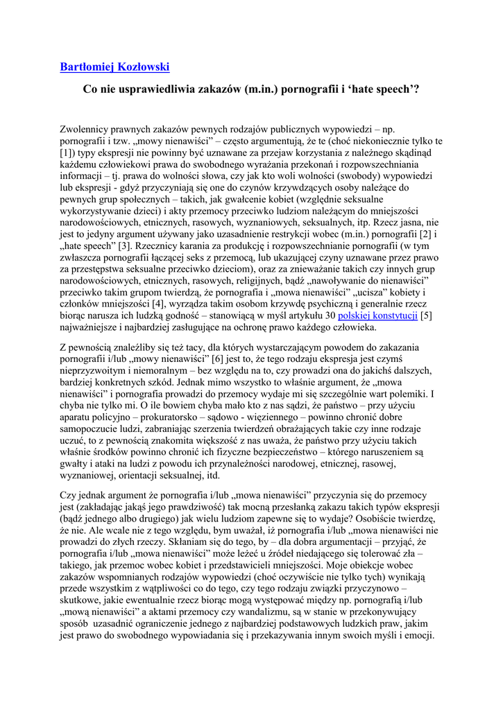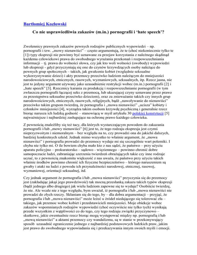 Bartłomiej Kozłowski Co nie usprawiedliwia zakazów (m.in.) pornografii i ‘hate speech’? Zwolennicy prawnych zakazów pewnych rodzajów publicznych wypowiedzi – np. pornografii i tzw. „mowy nienawiści” – często argumentują, że te (choć niekoniecznie tylko te [1]) typy ekspresji nie powinny być uznawane za przejaw korzystania z należnego skądinąd każdemu człowiekowi prawa do swobodnego wyrażania przekonań i rozpowszechniania informacji – tj. prawa do wolności słowa, czy jak kto woli wolności (swobody) wypowiedzi lub ekspresji - gdyż przyczyniają się one do czynów krzywdzących osoby należące do pewnych grup społecznych – takich, jak gwałcenie kobiet (względnie seksualne wykorzystywanie dzieci) i akty przemocy przeciwko ludziom należącym do mniejszości narodowościowych, etnicznych, rasowych, wyznaniowych, seksualnych, itp. Rzecz jasna, nie jest to jedyny argument używany jako uzasadnienie restrykcji wobec (m.in.) pornografii [2] i „hate speech” [3]. Rzecznicy karania za produkcję i rozpowszechnianie pornografii (w tym zwłaszcza pornografii łączącej seks z przemocą, lub ukazującej czyny uznawane przez prawo za przestępstwa seksualne przeciwko dzieciom), oraz za znieważanie takich czy innych grup narodowościowych, etnicznych, rasowych, religijnych, bądź „nawoływanie do nienawiści” przeciwko takim grupom twierdzą, że pornografia i „mowa nienawiści” „ucisza” kobiety i członków mniejszości [4], wyrządza takim osobom krzywdę psychiczną i generalnie rzecz biorąc narusza ich ludzką godność – stanowiącą w myśl artykułu 30 polskiej konstytucji [5] najważniejsze i najbardziej zasługujące na ochronę prawo każdego człowieka. Z pewnością znaleźliby się też tacy, dla których wystarczającym powodem do zakazania pornografii i/lub „mowy nienawiści” [6] jest to, że tego rodzaju ekspresja jest czymś nieprzyzwoitym i niemoralnym – bez względu na to, czy prowadzi ona do jakichś dalszych, bardziej konkretnych szkód. Jednak mimo wszystko to właśnie argument, że „mowa nienawiści” i pornografia prowadzi do przemocy wydaje mi się szczególnie wart polemiki. I chyba nie tylko mi. O ile bowiem chyba mało kto z nas sądzi, że państwo – przy użyciu aparatu policyjno – prokuratorsko – sądowo - więziennego – powinno chronić dobre samopoczucie ludzi, zabraniając szerzenia twierdzeń obrażających takie czy inne rodzaje uczuć, to z pewnością znakomita większość z nas uważa, że państwo przy użyciu takich właśnie środków powinno chronić ich fizyczne bezpieczeństwo – którego naruszeniem są gwałty i ataki na ludzi z powodu ich przynależności narodowej, etnicznej, rasowej, wyznaniowej, orientacji seksualnej, itd. Czy jednak argument że pornografia i/lub „mowa nienawiści” przyczynia się do przemocy jest (zakładając jakąś jego prawdziwość) tak mocną przesłanką zakazu takich typów ekspresji (bądź jednego albo drugiego) jak wielu ludziom zapewne się to wydaje? Osobiście twierdzę, że nie. Ale wcale nie z tego względu, bym uważał, iż pornografia i/lub „mowa nienawiści nie prowadzi do złych rzeczy. Skłaniam się do tego, by – dla dobra argumentacji – przyjąć, że pornografia i/lub „mowa nienawiści” może leżeć u źródeł niedającego się tolerować zła – takiego, jak przemoc wobec kobiet i przedstawicieli mniejszości. Moje obiekcje wobec zakazów wspomnianych rodzajów wypowiedzi (choć oczywiście nie tylko tych) wynikają przede wszystkim z wątpliwości co do tego, czy tego rodzaju związki przyczynowo – skutkowe, jakie ewentualnie rzecz biorąc mogą występować między np. pornografią i/lub „mową nienawiści” a aktami przemocy czy wandalizmu, są w stanie w przekonywujący sposób uzasadnić ograniczenie jednego z najbardziej podstawowych ludzkich praw, jakim jest prawo do swobodnego wypowiadania się i przekazywania innym swoich myśli i emocji. Na temat natury, zakresu i zapewne nawet w ogóle występowania związków przyczynowo – skutkowych między pornografią względnie „mową nienawiści” a przemocą można by długo debatować, jednak czegokolwiek byśmy nie uważali na ten temat, musimy się zgodzić co do jednego: związki te z pewnością nie są proste, jasne i bezpośrednie. Nawet najwięksi zwolennicy tezy, że pornografia przyczynia się do (np.) gwałtów nie twierdzą – bo byłoby to wbrew oczywistym faktom – że obejrzenie „świerszczyka” czy pornograficznego filmu w Internecie musi prowadzić do takiego czynu, jak zgwałcenie kobiety. Nikt nie zaprzeczy, że byli gwałciciele, którzy w życiu nie widzieli żadnej pornografii – i że byli ludzie wręcz nałogowo oglądający pornografię, którym do głowy nie strzeliła myśl o dokonaniu takiego czynu, jak gwałt. Nikt też nie twierdzi, że „mowa nienawiści” przeciwko mniejszościom – w rozumieniu wypowiedzi, które lżą, poniżają, bądź w taki czy inny sposób zachęcają do negatywnego nastawiania wobec tych mniejszości – w sposób bezpośredni i nieunikniony prowadzi do przestępczych zachowań wymierzonych w przedstawicieli owych mniejszości. Jakoś nie słychać o tym, by ci, którzy stykają się z rasistowskimi czy np. wrogimi wobec homoseksualistów treściami np. w Internecie popełniali en masse przestępstwa przeciwko członkom tych grup, których dotyczy nienawistna propaganda. Jeśli coś można próbować twierdzić w odniesieniu do takich rodzajów wypowiedzi, jak pornografia czy „mowa nienawiści” to co najwyżej to, że tego typu ekspresja może – u niektórych podatnych na jej wpływ osobników – pobudzać przekonania i wywoływać lub podsycać emocje, które mogą czasem stać się podłożem krzywdzących innych ludzi działań. Może – to jeszcze wcale nie znaczy, że musi. Działacze organizacji walczących z rasizmem – takich, jak stowarzyszenia „Nigdy Więcej” i 