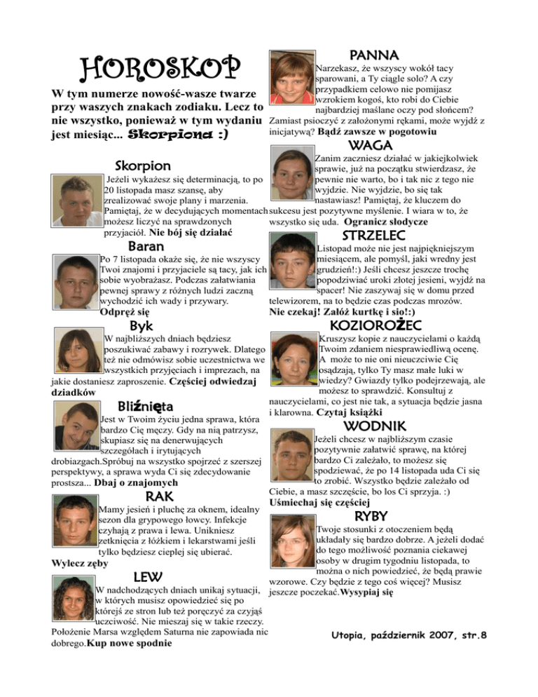 HOROSKOP W tym numerze nowość-wasze twarze przy waszych znakach zodiaku. Lecz to nie wszystko, ponieważ w tym wydaniu jest miesiąc... Skorpiona :) PANNA Narzekasz, że wszyscy wokół tacy sparowani, a Ty ciągle solo? A czy przypadkiem celowo nie pomijasz wzrokiem kogoś, kto robi do Ciebie najbardziej maślane oczy pod słońcem? Zamiast psioczyć z założonymi rękami, może wyjdź z inicjatywą? Bądź zawsze w pogotowiu WAGA Zanim zaczniesz działać w jakiejkolwiek Skorpion sprawie, już na początku stwierdzasz, że pewnie nie warto, bo i tak nic z tego nie Jeżeli wykażesz się determinacją, to po wyjdzie. Nie wyjdzie, bo się tak 20 listopada masz szansę, aby nastawiasz! Pamiętaj, że kluczem do zrealizować swoje plany i marzenia. Pamiętaj, że w decydujących momentach sukcesu jest pozytywne myślenie. I wiara w to, że możesz liczyć na sprawdzonych wszystko się uda. Ogranicz słodycze przyjaciół. Nie bój się działać STRZELEC Baran Listopad może nie jest najpiękniejszym miesiącem, ale pomyśl, jaki wredny jest Po 7 listopada okaże się, że nie wszyscy grudzień!:) Jeśli chcesz jeszcze trochę Twoi znajomi i przyjaciele są tacy, jak ich popodziwiać uroki złotej jesieni, wyjdź na sobie wyobrażasz. Podczas załatwiania spacer! Nie zaszywaj się w domu przed pewnej sprawy z różnych ludzi zaczną telewizorem, na to będzie czas podczas mrozów. wychodzić ich wady i przywary. Odpręż się Byk W najbliższych dniach będziesz poszukiwać zabawy i rozrywek. Dlatego też nie odmówisz sobie uczestnictwa we wszystkich przyjęciach i imprezach, na jakie dostaniesz zaproszenie. Częściej odwiedzaj dziadków Bliźnięta Jest w Twoim życiu jedna sprawa, która bardzo Cię męczy. Gdy na nią patrzysz, skupiasz się na denerwujących szczegółach i irytujących drobiazgach.Spróbuj na wszystko spojrzeć z szerszej perspektywy, a sprawa wyda Ci się zdecydowanie prostsza... Dbaj o znajomych RAK Mamy jesień i pluchę za oknem, idealny sezon dla grypowego łowcy. Infekcje czyhają z prawa i lewa. Unikniesz zetknięcia z łóżkiem i lekarstwami jeśli tylko będziesz cieplej się ubierać. Nie czekaj! Załóż kurtkę i sio!:) KOZIOROŻEC Kruszysz kopie z nauczycielami o każdą Twoim zdaniem niesprawiedliwą ocenę. A może to nie oni nieuczciwie Cię osądzają, tylko Ty masz małe luki w wiedzy? Gwiazdy tylko podejrzewają, ale możesz to sprawdzić. Konsultuj z nauczycielami, co jest nie tak, a sytuacja będzie jasna i klarowna. Czytaj książki WODNIK Jeżeli chcesz w najbliższym czasie pozytywnie załatwić sprawę, na której bardzo Ci zależało, to możesz się spodziewać, że po 14 listopada uda Ci się to zrobić. Wszystko będzie zależało od Ciebie, a masz szczęście, bo los Ci sprzyja. :) Uśmiechaj się częściej RYBY Twoje stosunki z otoczeniem będą układały się bardzo dobrze. A jeżeli dodać do tego możliwość poznania ciekawej osoby w drugim tygodniu listopada, to Wylecz zęby można o nich powiedzieć, że będą prawie LEW wzorowe. Czy będzie z tego coś więcej? Musisz W nadchodzących dniach unikaj sytuacji, jeszcze poczekać.Wysypiaj się w których musisz opowiedzieć się po którejś ze stron lub też poręczyć za czyjąś uczciwość. Nie mieszaj się w takie rzeczy. Położenie Marsa względem Saturna nie zapowiada nic Utopia, październik 2007, str.8 dobrego.Kup nowe spodnie