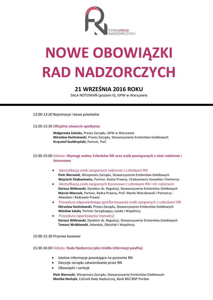 NOWE OBOWIĄZKI RAD NADZORCZYCH 21 WRZEŚNIA 2016 ROKU SALA NOTOWAŃ (poziom II), GPW w Warszawie 13:00-13:20 Rejestracja i kawa powitalna 13:20-13:30 Oficjalne otwarcie spotkania Małgorzata Zaleska, Prezes Zarządu, GPW w Warszawie Mirosław Kachniewski, Prezes Zarządu, Stowarzyszenie Emitentów Giełdowych Krzysztof Szułdrzyński, Partner, PwC 13:30-15:00 Debata: Wymogi wobec Członków RN oraz osób powiązanych z nimi rodzinnie i biznesowo Identyfikacja osób związanych rodzinnie z członkami RN Piotr Biernacki, Wiceprezes Zarządu, Stowarzyszenie Emitentów Giełdowych Wojciech Chabasiewicz, Partner, Radca Prawny, Chabasiewicz Kowalska i Partnerzy Identyfikacja osób związanych biznesowo z członkami RN i ich rodzinami Dariusz Witkowski, Dyrektor ds. Regulacji, Stowarzyszenie Emitentów Giełdowych Marcin Marczuk, Partner, Radca Prawny, Prof. Marek Wierzbowski i Partnerzy Adwokaci i Radcowie Prawni Procedura odpowiedniego poinformowania osób związanych z członkami RN Mirosław Kachniewski, Prezes Zarządu, Stowarzyszenie Emitentów Giełdowych Wiesław Łatała, Partner Zarządzający, Łatała i Wspólnicy Procedura raportowania transakcji Dariusz Witkowski, Dyrektor ds. Regulacji, Stowarzyszenie Emitentów Giełdowych Tomasz Wróblewski, Adwokat, Olesiński i Wspólnicy 15:00-15:30 Przerwa kawowa 15:30-16:00 Debata: Rada Nadzorcza jako źródło informacji poufnej Istotne informacje powstające na poziomie RN Decyzje zarządu zatwierdzanie przez RN Obowiązki i sankcje Piotr Biernacki, Wiceprezes Zarządu, Stowarzyszenie Emitentów Giełdowych Monika Nachyła, Członek Rady Nadzorczej, Bank BGŻ BNP Paribas NOWE OBOWIĄZKI RAD NADZORCZYCH 21 WRZEŚNIA 2016 ROKU SALA NOTOWAŃ (poziom II), GPW w Warszawie 16:00-16:30 Prezentacja raportu o wynagrodzeniach RN Jak kształtuje się struktura i poziom wynagrodzeń członków RN? Trendy w wynagradzaniu Rad Nadzorczych. Czy większa odpowiedzialność będzie oznaczała wzrost poziomu wynagrodzeń? Czy istnieje korelacja poziomu wynagrodzenia Rady Nadzorczej z wielkością spółki, jej branżą czy strukturą akcjonariatu? Porównanie poziomów i struktury wynagrodzeń w Polsce z rynkiem brytyjskim i niemieckim Dariusz Witkowski, Dyrektor ds. Regulacji, Stowarzyszenie Emitentów Giełdowych Robert Kujoth, Senior Menedżer, PwC Agnieszka Słomka - Gołębiowska, Członek Rady Nadzorczej, mBank 16:30-17:00 Możliwości profesjonalizacji RN na polskim rynku kapitałowym Poziom uciążliwości nowych wymogów Realny wpływ RN na funkcjonowanie spółki Zagrożenia a wynagrodzenie Mirosław Kachniewski, Prezes Zarządu, Stowarzyszenie Emitentów Giełdowych Raimondo Eggink, Niezależny Członek Rady Nadzorczej, Prime Car Management, PKP Cargo, Suwary 17:00-18:00 Koktajl Miej wpływ na rozwój profesjonalnych i skutecznych rad nadzorczych! Celem Forum Rad Nadzorczych jest kompleksowe wspieranie członków rad nadzorczych w pełnieniu ich strategicznej roli w spółce. Wspólna inicjatywa GPW, PwC i SEG to platforma komunikacji między członkami rad nadzorczych, członkami zarządów oraz regulatorami. Od kilku lat aktywnie działamy na rzecz profesjonalizacji polskich rad nadzorczych i podnoszenia jakości nadzoru nad spółkami publicznymi w Polsce. W ramach inicjatywy odbywają się kwartalne spotkania warsztatowe i konferencje. Forum to także centrum badań i analiz poświęconych kluczowym wyzwaniom rynkowym oraz profesjonalizacji członków rad nadzorczych. Rada Ekspertów FRN to grupa kilku doświadczonych członków rad nadzorczych, praktyków biznesowych oraz doradców. Misją Rady jest wsparcie członków rad nadzorczych w budowie ich rozwoju w oparciu o efektywny dialog z zarządami, właścicielami i rynkiem. Rada działa pod egidą Forum Rad Nadzorczych jako niezależna grupa ekspertów. Forum Rad Nadzorczych Miej wpływ na rozwój profesjonalnych i skutecznych rad nadzorczych! Inicjatywa skupiająca • rady nadzorcze • zarządy • właścicieli • regulatorów • inwestorów Inspiracje Wiedza Doświadczenie Komunikacja Harmonogram spotkań 2016 21 września XXI Forum Rad Nadzorczych październik Warsztaty dla Komitetów: Rada Ekspertów profesjonalnych członków rad nadzorczych Strategii, Wynagrodzeń i Audytu Kwartalne spotkania i konferencje 6 grudnia XXII Forum Rad Nadzorczych www.forumradnadzorczych.pl Analizy Badania Raporty