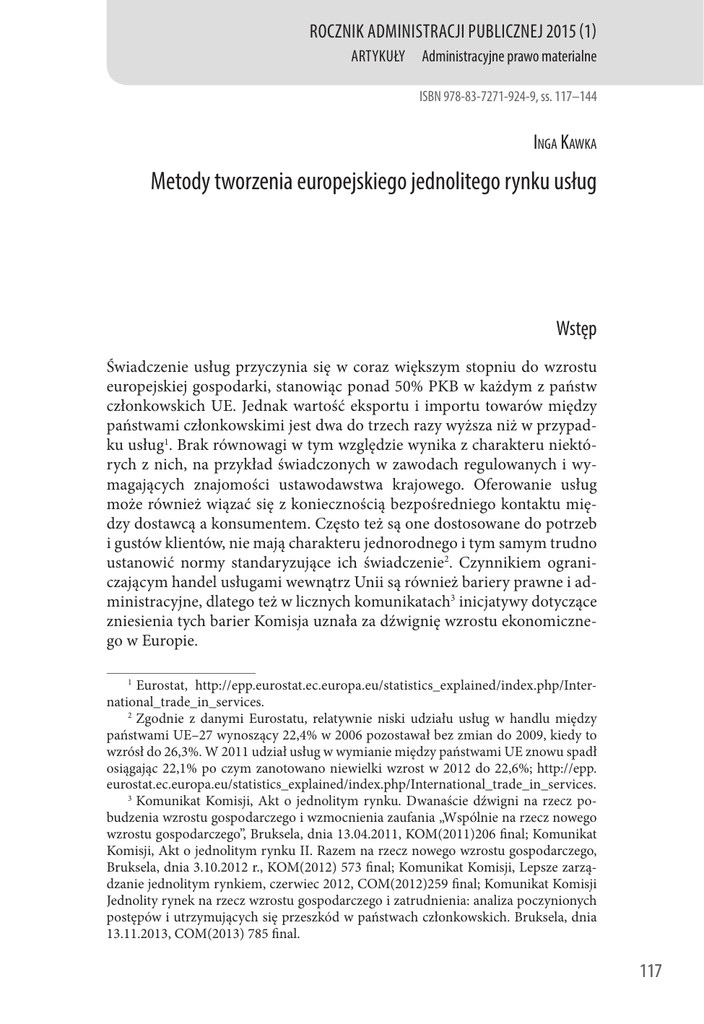 ROCZNIK ADMINISTRACJI PUBLICZNEJ 2015 (1) ARTYKUŁY Administracyjne prawo materialne ISBN 978-83-7271-924-9, ss. 117–144 Inga Kawka Metody tworzenia europejskiego jednolitego rynku usług Wstęp Świadczenie usług przyczynia się w coraz większym stopniu do wzrostu europejskiej gospodarki, stanowiąc ponad 50% PKB w każdym z państw członkowskich UE. Jednak wartość eksportu i importu towarów między państwami członkowskimi jest dwa do trzech razy wyższa niż w przypadku usług1. Brak równowagi w tym względzie wynika z charakteru niektórych z nich, na przykład świadczonych w zawodach regulowanych i wymagających znajomości ustawodawstwa krajowego. Oferowanie usług może również wiązać się z koniecznością bezpośredniego kontaktu między dostawcą a konsumentem. Często też są one dostosowane do potrzeb i gustów klientów, nie mają charakteru jednorodnego i tym samym trudno ustanowić normy standaryzujące ich świadczenie2. Czynnikiem ograniczającym handel usługami wewnątrz Unii są również bariery prawne i administracyjne, dlatego też w licznych komunikatach3 inicjatywy dotyczące zniesienia tych barier Komisja uznała za dźwignię wzrostu ekonomicznego w Europie. Eurostat, http://epp.eurostat.ec.europa.eu/statistics_explained/index.php/International_trade_in_services. 2 Zgodnie z danymi Eurostatu, relatywnie niski udziału usług w handlu między państwami UE–27 wynoszący 22,4% w 2006 pozostawał bez zmian do 2009, kiedy to wzrósł do 26,3%. W 2011 udział usług w wymianie między państwami UE znowu spadł osiągając 22,1% po czym zanotowano niewielki wzrost w 2012 do 22,6%; http://epp. eurostat.ec.europa.eu/statistics_explained/index.php/International_trade_in_services. 3 Komunikat Komisji, Akt o jednolitym rynku. Dwanaście dźwigni na rzecz pobudzenia wzrostu gospodarczego i wzmocnienia zaufania „Wspólnie na rzecz nowego wzrostu gospodarczego”, Bruksela, dnia 13.04.2011, KOM(2011)206 final; Komunikat Komisji, Akt o jednolitym rynku II. Razem na rzecz nowego wzrostu gospodarczego, Bruksela, dnia 3.10.2012 r., KOM(2012) 573 final; Komunikat Komisji, Lepsze zarządzanie jednolitym rynkiem, czerwiec 2012, COM(2012)259 final; Komunikat Komisji Jednolity rynek na rzecz wzrostu gospodarczego i zatrudnienia: analiza poczynionych postępów i utrzymujących się przeszkód w państwach członkowskich. Bruksela, dnia 13.11.2013, COM(2013) 785 final. 1 117 Metody tworzenia europejskiego jednolitego rynku usług RAP 2015 (1) Celem artykułu jest ukazanie metod integracji systemów prawnych państw członkowskich w celu realizacji jednolitego rynku europejskiego. Analizie w szczególności zostaną poddane metody pośrednie na przykładzie zmian zachodzących w polskim ustawodawstwie oraz w praktyce działania polskiej administracji gospodarczej. 1. Pojęcie usługi w prawie Unii Europejskiej Legalną definicję usług ustanawia art. 57 TFUE. Są nimi „świadczenia wykonywane zwykle za wynagrodzeniem w zakresie, w jakim nie są objęte postanowieniami o swobodnym przepływie towarów, kapitału i osób”. Artykuł 57 TFUE zawiera również przykładową listę usług. Obejmują one zwłaszcza: a) działalność o charakterze przemysłowym, b) działalność o charakterze handlowym, c) działalność rzemieślniczą, d) wykonywanie wolnych zawodów. Trybunał bardzo szeroko definiuje pojęcie usług. Z orzecznictwa TS wynika, że nimi są m.in.: działalność turystyczna, medyczna, ubezpieczeniowa czy nadawanie sygnałów telewizyjnych. W literaturze prawniczej4 podkreśla się, że normatywne pojęcie usługi w prawie unijnym różni się od ekonomicznego rozumienia5 tego terminu i praktyW. Sędzicki, Definicja usług w prawie wspólnotowym, „Przegląd Prawa Europejskiego i Międzynarodowego” 2008, nr 1 (25), s. 55; E. Skrzydło-Tefelska, Komentarz do art. 57 TFUE, w: A. Wróbel (red.), Traktat o funkcjonowaniu Unii Europejskiej. Komentarz, Warszawa 2012, s. 958. 5 W literaturze ekonomicznej (P. Mudie, A. Cottam, Usługi. Zarządzanie i marketing, Warszawa 1998, s. 15; Dictionnaire d’Économie et de Sciences Sociales, Paris 1993) pojęciem szerszym od terminu usługa jest produkt. Produkt to wszystko, co można zaoferować na rynku, a zatem wyroby i usługi, które zaspokajają ludzkie potrzeby. Wyroby mają charakter materialny. Są to np.: surowce, półfabrykaty, wyroby finalne oraz zespoły i części. Usługi natomiast, to świadczenia, które jedna strona – usługodawca, może zaoferować usługobiorcy, czyli wszelkie czynności wykonywane na rzecz jednostek gospodarczych na potrzeby produkcji oraz na rzecz ludności (konsumpcja indywidualna, zbiorowa i ogólnospołeczna). Polegają one na świadczeniach technicznych, lub intelektualnych albo też na pracy bezpośrednio wykorzystywanej przez użytkownika nieprzybierającej postaci materialnej. W literaturze (Usługi w gospodarce rynkowej, I. Rudawska (red.), Warszawa 2009; J. Gadrey, J. de Bandt, De l‘économie des services à l’économie des relations de service, w: Relations de service, marché de services, Lonrai 1994, s. 11 i n; J. de Bandt, Services et modèle de croissance. L’économie de service, w: Les services. Productivité et prix, Paris 1991, s. 39 i n.) dostrzega się również znaczny wzrost znaczenia działalności usługowej dla gospodarki, który rozpoczął się już po drugiej wojnie światowej (serwicyzacja gospodarki) i powstanie gospodarki, której podstawą są usługi (economie des services). W ujęciu ekonomicznym (R. Wolak, S. Kalafatis, P. Harris: An Investigation Into Four Characteristics of Services – „Journal of Empirical Generalisations in Marketing Science” 1998, s. 22–43, na: http://members.byronsharp.com/empgens/emp1.pdf) cztery podstawowe cechy odróżniają usługi od towarów. Są to: niematerialność (intangibility) – „usługą jest coś, co można kupić, lecz nie można sobie upuścić na stopę” (E. Gummesson, Lip Serv
