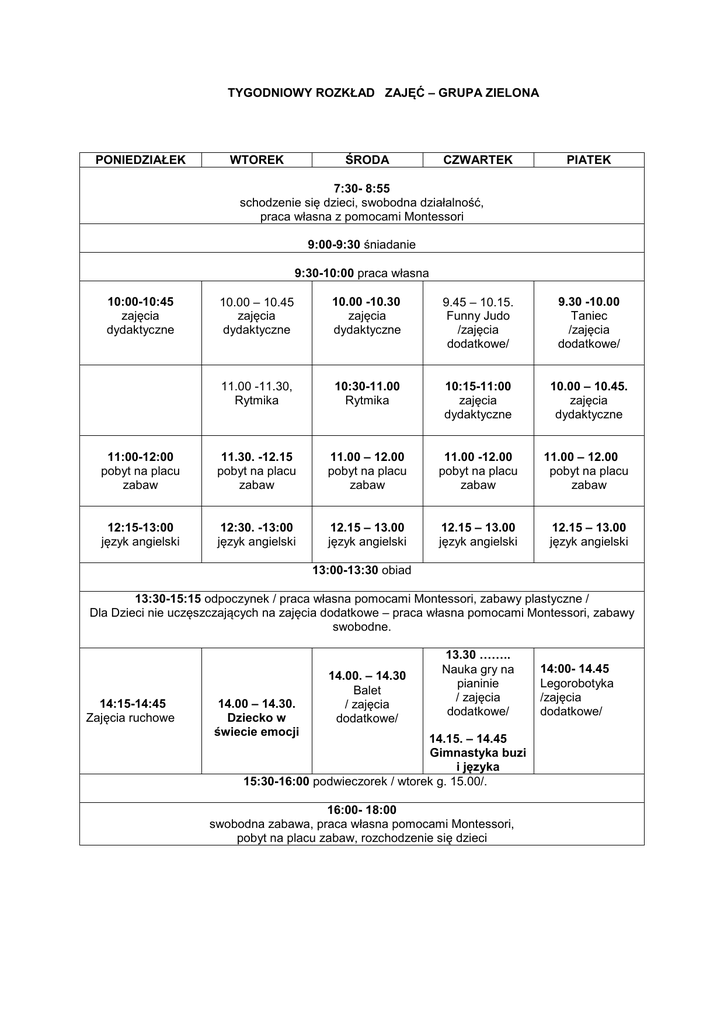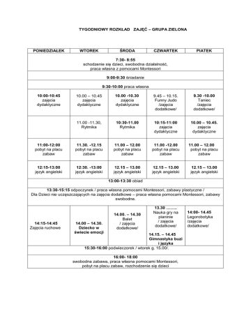 TYGODNIOWY ROZKŁAD ZAJĘĆ – GRUPA ZIELONA PONIEDZIAŁEK ŚRODA WTOREK CZWARTEK PIATEK 7:30- 8:55 schodzenie się dzieci, swobodna działalność, praca własna z pomocami Montessori 9:00-9:30 śniadanie 9:30-10:00 praca własna 10:00-10:45 zajęcia dydaktyczne 10.00 – 10.45 zajęcia dydaktyczne 10.00 -10.30 zajęcia dydaktyczne 9.45 – 10.15. Funny Judo /zajęcia dodatkowe/ 9.30 -10.00 Taniec /zajęcia dodatkowe/ 11.00 -11.30, Rytmika 10:30-11.00 Rytmika 10:15-11:00 zajęcia dydaktyczne 10.00 – 10.45. zajęcia dydaktyczne 11:00-12:00 pobyt na placu zabaw 11.30. -12.15 pobyt na placu zabaw 11.00 – 12.00 pobyt na placu zabaw 11.00 -12.00 pobyt na placu zabaw 11.00 – 12.00 pobyt na placu zabaw 12:15-13:00 język angielski 12:30. -13:00 język angielski 12.15 – 13.00 język angielski 12.15 – 13.00 język angielski 12.15 – 13.00 język angielski 13:00-13:30 obiad 13:30-15:15 odpoczynek / praca własna pomocami Montessori, zabawy plastyczne / Dla Dzieci nie uczęszczających na zajęcia dodatkowe – praca własna pomocami Montessori, zabawy swobodne. 14:15-14:45 Zajęcia ruchowe 14.00 – 14.30. Dziecko w świecie emocji 14.00. – 14.30 Balet / zajęcia dodatkowe/ 13.30 …….. Nauka gry na pianinie / zajęcia dodatkowe/ 14.15. – 14.45 Gimnastyka buzi i języka 15:30-16:00 podwieczorek / wtorek g. 15.00/. 16:00- 18:00 swobodna zabawa, praca własna pomocami Montessori, pobyt na placu zabaw, rozchodzenie się dzieci 14:00- 14.45 Legorobotyka /zajęcia dodatkowe/