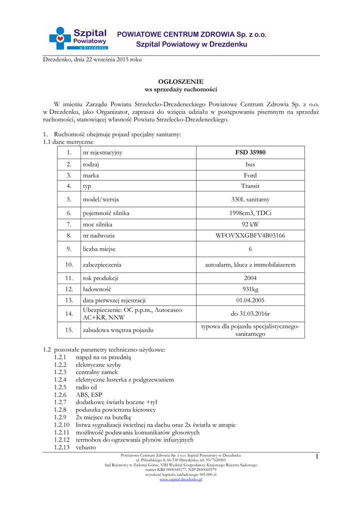 Drezdenko, dnia 22 września 2015 roku OGŁOSZENIE ws sprzedaży ruchomości W imieniu Zarządu Powiatu Strzelecko-Drezdeneckiego Powiatowe Centrum Zdrowia Sp. z o.o. w Drezdenku, jako Organizator, zaprasza do wzięcia udziału w postępowaniu pisemnym na sprzedaż ruchomości, stanowiącej własność Powiatu Strzelecko-Drezdeneckiego. 1. Ruchomość obejmuje pojazd specjalny sanitarny: 1.1 dane metryczne 1. nr rejestracyjny 2. rodzaj bus 3. marka Ford 4. typ 5. model/wersja 330L sanitarny 6. pojemność silnika 1998cm3, TDCi 7. moc silnika 92 kW 8. nr nadwozia WFOVXXGBFV4B03166 9. liczba miejsc 6 10. zabezpieczenia autoalarm, klucz z immobilaizerem 11. rok produkcji 2004 12. ładowność 931kg 13. data pierwszej rejestracji Ubezpieczenie: OC p.p.m., Autocasco AC+KR, NNW 14. 15. FSD 35980 Transit zabudowa wnętrza pojazdu 01.04.2005 do 31.03.2016r typowa dla pojazdu specjalistycznegosanitarnego 1.2 pozostałe parametry techniczno-użytkowe: 1.2.1 napęd na os przednią 1.2.2 elektryczne szyby 1.2.3 centralny zamek 1.2.4 elektryczne lusterka z podgrzewaniem 1.2.5 radio cd 1.2.6 ABS, ESP 1.2.7 dodatkowe światła boczne +tył 1.2.8 poduszka powietrzna kierowcy 1.2.9 2x miejsce na butelkę 1.2.10 listwa sygnalizacji świetlnej na dachu oraz 2x światła w atrapie 1.2.11 możliwość podawania komunikatów głosowych 1.2.12 termobox do ogrzewania płynów infuzyjnych 1.2.13 vebasto Powiatowe Centrum Zdrowia Sp. z o.o. Szpital Powiatowy w Drezdenku ul. Piłsudskiego 8, 66-530 Drezdenko, tel. 95/7620505 Sąd Rejonowy w Zielonej Górze, VIII Wydział Gospodarczy Krajowego Rejestru Sądowego numer KRS 0000345177, NIP 2810069579 wysokość kapitału zakładowego 505 000 zł www.szpital-drezdenko.pl 1 1.2.14 1.2.15 1.2.16 1.2.17 1.2.18 1.2.19 1.2.20 1.2.21 1.2.22 1.2.23 1.2.24 1.2.25 1.2.26 1.2.27 1.2.28 1.2.29 1.2.30 kierunkowskazy z tyłu na dachu pojazdu oraz lampy obrysowe z tyłu na dachu podłoga wzmocniona, antyposlizgowa, łatwo zmywalna, kabina kierowcy oddzielona od przedziału medycznego- okienko półki i schowki na sprzęt medyczny-sanitarny (meble wykonane z wysokiej klasy płyt z tworzywa sztucznego) centralna instalacja tlenowa z 2 punktami poboru laweta mechaniczna pod nosze sufitowe uchwyty do płynów infuzyjnych antena radiotelefonu z instalacja połączeniową wspomaganie układu kierowniczego kieszenie w drzwiach przednich konsola przednia z gniazdem 12V fotel kierowcy z regulacją wysokości przednie zagłówki z regulacją wysokości wlew paliwa zamykany na kluczyk kolo zapasowe z podnośnikiem 3 gniazda 12V w tylnej części pojazdu przebieg 516 593km W załączeniu do ogłoszenia poglądowe zdjęcia ambulansu 3. Ruchomość jest wolna od zobowiązań i obciążeń. 4. Nie wymaga się wniesienia wadium. 5. Miejsce i termin w którym można obejrzeć przedmiot sprzedaży Ambulans można obejrzeć w siedzibie Powiatowego Centrum Zdrowia Sp. z o.o. ul. Piłsudskiego 8, 66-530 Drezdenko, od poniedziałku do piątku. Termin wizji należy uprzednio ustalić z Kierownikiem Działu Logistyki – nr tel. 95/7639955. Przedmiot sprzedaży nie jest w pełni sprawny, w związku z czym Organizator zaleca dokonanie oceny sprawności technicznej pojazdu przed złożeniem oferty. 6. Wymagania dotyczące oferty. 6.1 Warunkiem przystąpienia do postępowania jest złożenie oferty. 6.2 Pod rygorem nieważności oferta musi być sporządzona w formie pisemnej i zawierać następujące dane: • imię i nazwisko lub nazwę firmy, dokładny adres i telefon kontaktowy, • NIP, REGON, • aktualny odpis z właściwego rejestru (KRS) albo aktualne zaświadczenie o wpisie do ewidencji działalności (CEDiG) gospodarczej, wystawiony nie wcześniej niż 6 miesięcy przed upływem terminu składania ofert, • oferowaną cenę nabycia • oferta powinna być podpisana przez osobę uprawnioną do składania oświadczeń woli i zaciągania zobowiązań w imieniu Wykonawcy, zgodnie z danymi zawartymi w dokumentach rejestrowych. Jeżeli ofertę podpisuje inna osoba, należy dołączyć stosowane dokumenty (np.: oryginał pełnomocnictwa lub kopię potwierdzoną notarialnie) uprawniające do podpisania oferty. Proponowany wzór formularza ofertowego stanowi załącznik do niniejszego ogłoszenia Powiatowe Centrum Zdrowia Sp. z o.o. Szpital Powiatowy w Drezdenku ul. Piłsudskiego 8, 66-530 Drezdenko, tel. 95/7620505 Sąd Rejonowy w Zielonej Górze, VIII Wydział Gospodarczy Krajowego Rejestru Sądowego numer KRS 0000345177, NIP 2810069579 wysokość kapitału zakładowego 505 000 zł www.szpital-drezdenko.pl 2 7. Termin składania ofert 7.1 Oferty pisemne należy składać do dnia 12 października 2015r. do godz. 12:00 w na adres: Powiatowe Centrum Zdrowia Sp. z o.o., ul. Piłsudskiego 8, 66-530 Drezdenko, Sekretariat 7.2 Oferta winna być złożona w zaklejonym i nienaruszonym opakowaniu opatrzona następującym opisem: Powiatowe Centrum Zdrowia Sp. z o.o. ul. Piłsudskiego 8, 66-530 Drezdenko Oferta na sprzedaż ambulansu 8. Miejsce i termin otwarcia ofert 8.1 Oferty złożone w terminie zostaną przekazana do Właściciela przedmiotu sprzedaży, który dokona ich oceny. 8.2 Oferta złożona po terminie lub w niewłaściwym miejscu zostanie zwrócona bez otwierania. 8.3 Właściciel zastrzega sobie prawo swobodnego wyboru oferty, a także zamknięcia/ unieważnienia postępowania bez wybrania którejkolwiek z ofert, bez podawania przyczyny. 9. Minimalny termin związania ofertą - 30 dni. 10. Forma porozumienia się z Organizatorem W przedmiotowym postępowaniu oświadczenia, wnioski, zawiadomienia oraz informacje mogą być przekazywane pisemnie, za pomocą faksu – pod nr 95/7639974 lub poczty elektronicznej [email protected] . 11. Tryb i forma udzielania wyjaśnień. Kupujący może zwrócić się do Organizatora o wyjaśnienie treści ogłoszenia, przekazanie dodatkowych informacji. Treść zapytań wraz z wyjaśnieniami zostanie opublikowana na stronie internetowej, na której umieszczono ogłosze