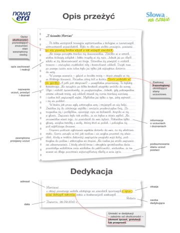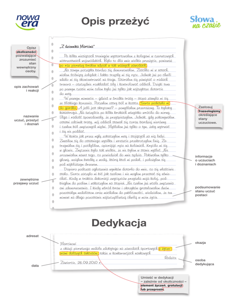 Opis przeżyć Opisz okoliczności pozwalające zrozumieć stan wewnętrzny osoby. opis zachowań i reakcji nazwanie uczuć, przeżyć i doznań zewnętrzne przejawy uczuć „Z dziennika Ma cina” Po kilku miesiàcach t eningów wysta towałem z kolegami w cze wcowych mist zostwach wojewódzkich. Było to dla mnie wielkie p ze˝ycie, poniewa˝ po az pie wszy b ałem udział w tak wa˝nych zawodach. Na samym poczàtku ba dzo si´ dene wowałem. Zaschło mi w ustach, miałem ÊciÊni´ty ˝ołàdek i lekko t z´sły mi si´ ´ce. Jednak ju˝ po chwili udało mi si´ skoncent owaç na biegu. Sta ałem si´ pami´taç o adach t ene a – oszcz´dnie ozkładaç siły i kont olowaç oddech. Dzi´ki temu po pewnym czasie moim celem było ju˝ tylko jak najszybsze dota cie do mety. W pewnym momencie – gdzieÊ w Ê odku t asy – stopa zsun´ła mi si´ ze Êliskiego ko zenia. Poczułem ost y ból w kostce. Se ce podeszło mi do ga dła. A jeÊli jest sk ´cona? – pomyÊlałem p ze a˝ony. To byłaby katast ofa. Na szcz´Êcie po kilku k okach wszystko w óciło do no my. Ulga i adoÊç spowodowały, ˝e p zyspieszyłem. Jednak, gdy pokonywałem ostatni odcinek t asy, mój oddech stawał si´ co az ba dziej nie ówny i czułem ból zm´czonych mi´Êni. MyÊlałem ju˝ tylko o tym, ˝eby wyt waç i si´ nie poddaç. W koƒcu jak p zez mgł´ zobaczyłem met´ i stojàcych za nià ludzi. Zmusiłem si´ do ostatniego wysiłku i w eszcie p zek oczyłem lini´. Zat zymałem si´ i pochyliłem, opie ajàc ´ce na kolanach. K ´ciło mi si´ w głowie. Zm´czenie było tak wielkie, ˝e nie byłem w stanie myÊleç. Nie z ozumiałem nawet tego, co powiedział do mnie s´dzia. Pokiwałem tylko głowà, wziàłem butelk´ z wodà, któ à ktoÊ mi podał, i poło˝yłem si´ pod najbli˝szym d zewem. Dopie o podczas ogłoszenia wyników dota ło do mnie, co si´ właÊciwie stało. Se ce zacz´ło mi biç jak szalone i nie mogłem p zestaç si´ uÊmiechaç. Kiedy w t akcie deko acji zwyci´zców p zyszła moja kolej, podbiegłem do podium i wskoczyłem na stopieƒ. Nie czułem ju˝ wcale zm´czenia ani zdene wowania. I kiedy wÊ ód b aw i ok zyków g atulowałem dwóm pozostałym medalistom o az machałem do publicznoÊci, wiedziałem, ˝e ten moment na długo pozostanie najszcz´Êliwszà chwilà w moim ˝yciu. Zastosuj frazeologizmy określające stany uczuciowe. informacje o uczuciach i doznaniach podsumowanie stanu uczuć postaci Dedykacja adresat data Ma cinowi z okazji pie wszego medalu zdobytego na zawodach spo towych z ˝yczeniami dalszych sukcesów, tak˝e w konku encjach naukowych Rodzice Zawie cie, 26.09.2010 . Umieść w dedykacji – zależnie od okoliczności – element życzeń, gratulacji lub przeprosin. okazja osoba dedykująca
