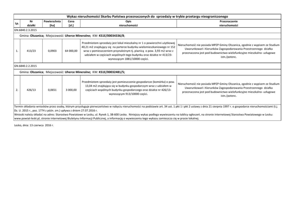 Wykaz nieruchomości Skarbu Państwa przeznaczonych do sprzedaży w trybie przetargu nieograniczonego Lp. Nr działki Powierzchnia [ha] Cena [zł.] Opis nieruchomości Przeznaczenie nieruchomości GN.6840.2.3.2015 Gmina: Olszanica; Miejscowość: Uherce Mineralne; KW: KS1E/00034336/8; 1. 413/23 0,0903 64 000,00 Przedmiotem sprzedaży jest lokal mieszkalny nr 1 o powierzchni użytkowej Nieruchomość nie posiada MPZP Gminy Olszanica, zgodnie z wypisem ze Studium 40,21 m2 znajdujący się na parterze budynku wielomieszkaniowego nr 152 Uwarunkowań i Kierunków Zagospodarowania Przestrzennego działka wraz z pomieszczeniem przynależnym tj. piwnicą o pow. 3,93 m2 wraz z przeznaczona jest pod budownictwo wielofunkcyjne mieszkalno- usługowe udziałem w częściach wspólnych tego budynku oraz działce nr 413/23istn./potenc. wynoszącym 1881/10000 części. GN.6840.2.2.2015 Gmina: Olszanica; Miejscowość: Uherce Mineralne; KW: KS1E/00032481/5; 2. 426/13 0,0651 3 000,00 Przedmiotem sprzedaży jest pomieszczenie gospodarcze (komórka) o pow. 13,04 m2 znajdująca się w budynku gospodarczym wraz z udziałem w częściach wspólnych budynku gospodarczego oraz działce nr 426/13wynoszącym 913/10000 części. Nieruchomość nie posiada MPZP Gminy Olszanica, zgodnie z wypisem ze Studium Uwarunkowań i Kierunków Zagospodarowania Przestrzennego działka przeznaczona jest pod budownictwo wielofunkcyjne mieszkalno- usługowe istn./potenc. Termin składania wniosków przez osoby, którym przysługuje pierwszeństwo w nabyciu nieruchomości na podstawie art. 34 ust. 1 pkt 1 i pkt 2 ustawy z dnia 21 sierpnia 1997 r. o gospodarce nieruchomościami (t.j. Dz. U. 2015 r., poz. 1774 z późn. zm.) upływa z dniem 27.07.2016 r. Wnioski należy składać na adres: Starostwo Powiatowe w Lesku, ul. Rynek 1, 38-600 Lesko. Niniejszy wykaz podlega wywieszeniu na tablicy ogłoszeń, na stronie internetowej Starostwa Powiatowego w Lesku: www.powiat-leski.pl, stronie internetowej Biuletynu Informacji Publicznej, a informację o wywieszeniu tego wykazu zamieszcza się w prasie lokalnej. Lesko, dnia: 13 czerwca 2016 r.