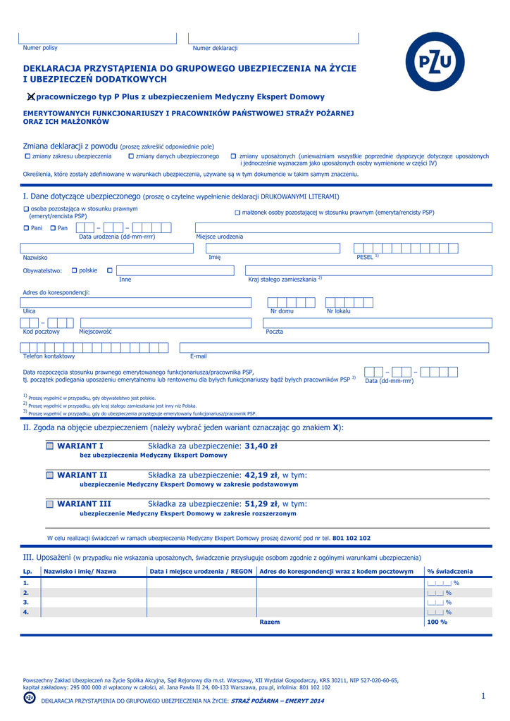 Numer polisy Numer deklaracji DEKLARACJA PRZYSTĄPIENIA DO GRUPOWEGO UBEZPIECZENIA NA ŻYCIE I UBEZPIECZEŃ DODATKOWYCH pracowniczego typ P Plus z ubezpieczeniem Medyczny Ekspert Domowy EMERYTOWANYCH FUNKCJONARIUSZY I PRACOWNIKÓW PAŃSTWOWEJ STRAŻY POŻARNEJ ORAZ ICH MAŁŻONKÓW Zmiana deklaracji z powodu (proszę zakreślić odpowiednie pole) zmiany zakresu ubezpieczenia zmiany danych ubezpieczonego zmiany uposażonych (unieważniam wszystkie poprzednie dyspozycje dotyczące uposażonych i jednocześnie wyznaczam jako uposażonych osoby wymienione w części IV) Określenia, które zostały zdefiniowane w warunkach ubezpieczenia, używane są w tym dokumencie w takim samym znaczeniu. I. Dane dotyczące ubezpieczonego (proszę o czytelne wypełnienie deklaracji DRUKOWANYMI LITERAMI) osoba pozostająca w stosunku prawnym (emeryt/rencista PSP) Pani Pan małżonek osoby pozostającej w stosunku prawnym (emeryta/rencisty PSP) – – Data urodzenia (dd-mm-rrrr) Miejsce urodzenia Imię Nazwisko Obywatelstwo: PESEL 1) polskie Inne Kraj stałego zamieszkania 2) Adres do korespondencji: Ulica Nr domu – Kod pocztowy Miejscowość Nr lokalu Poczta Telefon kontaktowy E-mail Data rozpoczęcia stosunku prawnego emerytowanego funkcjonariusza/pracownika PSP, tj. początek podlegania uposażeniu emerytalnemu lub rentowemu dla byłych funkcjonariuszy bądź byłych pracowników PSP 1) 2) 3) 3) – – Data (dd-mm-rrrr) Proszę wypełnić w przypadku, gdy obywatelstwo jest polskie. Proszę wypełnić w przypadku, gdy kraj stałego zamieszkania jest inny niż Polska. Proszę wypełnić w przypadku, gdy do ubezpieczenia przystępuje emerytowany funkcjonariusz/pracownik PSP. II. Zgoda na objęcie ubezpieczeniem (należy wybrać jeden wariant oznaczając go znakiem X): WARIANT I Składka za ubezpieczenie: 31,40 zł bez ubezpieczenia Medyczny Ekspert Domowy WARIANT II Składka za ubezpieczenie: 42,19 zł, w tym: ubezpieczenie Medyczny Ekspert Domowy w zakresie podstawowym WARIANT III Składka za ubezpieczenie: 51,29 zł, w tym: ubezpieczenie Medyczny Ekspert Domowy w zakresie rozszerzonym W celu realizacji świadczeń w ramach ubezpieczenia Medyczny Ekspert Domowy proszę dzwonić pod nr tel. 801 102 102 III. Uposażeni (w przypadku nie wskazania uposażonych, świadczenie przysługuje osobom zgodnie z ogólnymi warunkami ubezpieczenia) Lp. Nazwisko i imię/ Nazwa Data i miejsce urodzenia / REGON Adres do korespondencji wraz z kodem pocztowym % świadczenia 1. ______ % 2. ____ % 3. ____ % ____ % 4. Razem Powszechny Zakład Ubezpieczeń na Życie Spółka Akcyjna, Sąd Rejonowy dla m.st. Warszawy, XII Wydział Gospodarczy, KRS 30211, NIP 527-020-60-65, kapitał zakładowy: 295 000 000 zł wpłacony w całości, al. Jana Pawła II 24, 00-133 Warszawa, pzu.pl, infolinia: 801 102 102 DEKLARACJA PRZYSTĄPIENIA DO GRUPOWEGO UBEZPIECZENIA NA ŻYCIE: STRAŻ POŻARNA – EMERYT 2014 100 % 1 IV. Zgoda na objęcie ubezpieczeniem i oświadczenie ubezpieczonego (wypełnia przystępujący do ubezpieczenia) Oświadczam, że: 1. Zapoznałam/em się z warunkami ubezpieczenia, w szczególności w zakresie świadczeń z tytułu ubezpieczenia oraz wysokości sumy ubezpieczenia i składki. Oświadczam, że chcę skorzystać z zastrzeżenia na moją rzecz ochrony ubezpieczeniowej na warunkach określonych w umowie, w tym na wysokość sumy ubezpieczenia. PZU Życie SA potwierdzi te warunki Indywidualnym Potwierdzeniem. 2. Zostałam/em poinformowana/y, że administratorem danych osobowych podanych w związku z zawarciem umowy ubezpieczenia jest PZU Życie SA z siedzibą przy al. Jana Pawła II 24, 00 – 133 Warszawa. Osoba, której dane dotyczą ma prawo dostępu do treści swoich danych osobowych i ich poprawiania. Celem przetwarzania tych danych jest przystąpienie do ubezpieczenia i wykonywanie umowy ubezpieczenia. 3. Dla potrzeb oceny ryzyka i ustalenia odpowiedzialności z tytułu zdarzeń objętych ubezpieczeniem upoważniam kierownictwo placówek służby zdrowia oraz lekarzy do udzielania PZU Życie SA informacji, w tym do przekazania do PZU Życie SA kopii dokumentacji medycznej, dotyczących mojego stanu zdrowia. Wyrażam zgodę na przetwarzanie danych osobowych przez PZU Życie SA w wyżej wymienionych celach. 4. Wyrażam zgodę na gromadzenie, przetwarzanie i przekazywanie moich danych osobowych przez Mentor S.A. z siedzibą w Toruniu przy ul. Szosa Chełmińska 177-181 oraz Mentor Ubezpieczenia Indywidualne Sp. z o.o. z siedzibą w Toruniu przy ul. Szosa Chełmińska 177-181. Dane są zbierane i będą przechowywane w celu prawidłowej realizacji usług finansowych, zgodnie z zasadami zawartymi w ustawie z dnia 29 sierpnia 1997 r. o ochronie danych osobowych (Dz. U. z 2002 r. Nr 101 poz. 926, z póź. zm.). Oświadczam, że zostałem/am poinformowany/a o prawie dostępu do treści moich danych osobowych oraz możliwości ich poprawiania, jak również prawie wniesienia w każdym czasie sprzeciwu wobec ich przetwarzania. 5. Wyrażam zgodę4) / Nie wyrażam zgody4) na przetwarzanie moich danych osobowych w celach marketingowych przez PZU Życie SA z siedzibą przy al. Jana Pawła II 24, 00 – 133 Warszawa po zakończeniu odpowiedzialności wynikającej z ubezpieczenia. 6. Wyrażam zgodę4) / Nie wyrażam zgody4) na udostępnianie moich danych osobowych innemu ubezpieczycielowi w celach określonych w art. 22 ust. 5 ustawy z dnia 22 maja 2003r. o działalności ubezpieczeniowej (tekst jednolity: Dz. U. z 2010 r. Nr 11, poz. 66). 7. Wyrażam zgodę4) / Nie wyrażam zgody4) na udostępnianie danych osobowych w celach marketingowych następującym podmiotom: PZU SA, TFI PZU SA, PZU Pomoc SA, których siedziba znajduje się przy al. Jana Pawła II 24, 00-133 Warszawa, PZU Centrum Operacji SA z siedzibą przy ul. Postępu 18 a, 02-676 Warszawa oraz innym podmiotom powiązanym kapitałowo z PZU Życie SA. 8. Wyrażam zgodę* na udostępnienie moich danych osobowych następującym podmiotom: PZU SA, TFI PZU SA, PZU Pomoc S