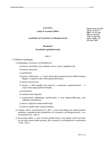 ©Kancelaria Sejmu s. 1/16 USTAWA Opracowano na podstawie: tj. Dz.U. z 2005 r. Nr 41, poz. 399, Nr 143, poz. 1199, Nr 169, poz. 1418, z 2006 r. Nr 222, poz. 1629. z dnia 9 września 2000 r. o podatku od czynności cywilnoprawnych Rozdział 1 Przedmiot opodatkowania Art. 1. 1. Podatkowi podlegają: 1) następujące czynności cywilnoprawne: a) umowy sprzedaży oraz zamiany rzeczy i praw majątkowych, b) umowy pożyczki, c) (uchylona), d) umowy darowizny – w części dotyczącej przejęcia przez obdarowanego długów i ciężarów albo zobowiązań darczyńcy, e) umowy dożywocia, f) umowy o dział spadku oraz umowy o zniesienie współwłasności – w części dotyczącej spłat lub dopłat, g) (uchylona), h) ustanowienie hipoteki, i) ustanowienie odpłatnego użytkowania, w tym nieprawidłowego, oraz odpłatnej służebności, j) umowy depozytu nieprawidłowego, k) umowy spółki (akty założycielskie); 2) zmiany umów wymienionych w pkt 1, jeżeli powodują one podwyższenie podstawy opodatkowania podatkiem od czynności cywilnoprawnych, z zastrzeżeniem ust. 3 pkt 4; 3) orzeczenia sądów, w tym również polubownych, oraz ugody, jeżeli wywołują one takie same skutki prawne, jak czynności cywilnoprawne wymienione w pkt 1 lub 2. 2007-01-22 ©Kancelaria Sejmu s. 2/16 2. Ilekroć w dalszych przepisach jest mowa o czynnościach cywilnoprawnych, przepisy ustawy stosuje się odpowiednio do przedmiotów opodatkowania określonych w ust. 1 pkt 2 i 3. 3. W przypadku umowy spółki za zmianę umowy uważa się: 1) przy spółce osobowej – wniesienie lub podwyższenie wniesionego do spółki wkładu, którego wartość powoduje zwiększenie majątku spółki albo podwyższenie kapitału zakładowego, pożyczkę udzieloną spółce przez wspólnika lub akcjonariusza, dopłaty oraz oddanie przez wspólnika lub akcjonariusza spółce rzeczy lub praw majątkowych do nieodpłatnego używania; 2) przy spółce kapitałowej – wniesienie lub podwyższenie wniesionego do spółki wkładu, którego wartość powoduje podwyższenie kapitału zakładowego, pożyczkę udzieloną spółce przez wspólnika (akcjonariusza) oraz dopłaty; 3) przekształcenie, podział lub łączenie spółek, jeżeli ich wynikiem jest zwiększenie majątku spółki lub podwyższenie kapitału zakładowego; 4) przeniesienie na terytorium Rzeczypospolitej Polskiej rzeczywistego ośrodka zarządzania spółki kapitałowej lub jej siedziby – także wtedy, gdy czynność ta nie powoduje podwyższenia kapitału zakładowego – jeżeli rzeczywisty ośrodek zarządzania lub siedziba nie znajdowały się poprzednio na terytorium państwa członkowskiego, bądź jeżeli znajdowały się na terytorium takiego państwa, jeżeli umowa spółki nie podlegała podatkowi kapitałowemu. 4. Czynności cywilnoprawne podlegają podatkowi, z zastrzeżeniem ust. 5, jeżeli ich przedmiotem są: 1) rzeczy znajdujące się na terytorium Rzeczypospolitej Polskiej lub prawa majątkowe wykonywane na terytorium Rzeczypospolitej Polskiej; 2) rzeczy znajdujące się za granicą lub prawa majątkowe wykonywane za granicą, w przypadku gdy nabywca ma miejsce zamieszkania lub siedzibę na terytorium Rzeczypospolitej Polskiej i czynność cywilnoprawna została dokonana na terytorium Rzeczypospolitej Polskiej. 5. Umowa spółki oraz jej zmiana podlega podatkowi, jeżeli w chwili dokonania czynności na terytorium Rzeczypospolitej Polskiej znajduje się: 1) w przypadku spółki osobowej – siedziba tej spółki; 2) w przypadku spółki kapitałowej: a) rzeczywisty ośrodek zarządzania albo b) siedziba tej spółki – jeżeli jej rzeczywisty ośrodek zarządzania nie znajduje się na terytorium żadnego z państw członkowskich, a jeżeli ośrodek ten znajduje się na terytorium takiego państwa, gdy umowa spółki nie podlega podatkowi kapitałowemu w tym państwie. 6. (uchylony). 7. (uchylony). 8. (uchylony). 2007-01-22 ©Kancelaria Sejmu s. 3/16 Art. 1a. Użyte w ustawie określenia oznaczają: 1) spółka osobowa – spółkę: cywilną, jawną, partnerską, komandytową lub komandytowo-akcyjną; 2) spółka kapitałowa – spółkę: z ograniczoną odpowiedzialnością lub akcyjną; 3) siedziba spółki – siedzibę spółki określoną w umowie (statucie) spółki; 4) rzeczywisty ośrodek zarządzania – miejscowość, w której ma siedzibę organ zarządzający spółki kapitałowej; 5) państwo członkowskie – państwo członkowskie Unii Europejskiej lub państwo członkowskie Europejskiego Porozumienia o Wolnym Handlu (EFTA) – strona umowy o Europejskim Obszarze Gospodarczym; 6) podatek kapitałowy – podatek, który zgodnie z prawem państwa członkowskiego jest pobierany od kapitału spółki kapitałowej lub od jego podwyższenia; 7) podatek od towarów i usług – podatek od towarów i usług w rozumieniu ustawy z dnia 11 marca 2004 r. o podatku od towarów i usług (Dz. U. Nr 54, poz. 535, z późn. zm.1)) lub podatek od wartości dodanej pobierany na podstawie przepisów obowiązujących w państwach członkowskich. Art. 2. Nie podlegają podatkowi: 1) czynności cywilnoprawne w sprawach: a) alimentacyjnych, opieki, kurateli i przysposobienia, b) ubezpieczenia społecznego, ubezpieczenia zdrowotnego, opieki społecznej, ulg określonych w przepisach szczególnych dla żołnierzy niezawodowych i poborowych odbywających służbę zastępczą oraz ich rodzin, a także uprawnień dla osób niepełnosprawnych i osób objętych przepisami o szczególnych uprawnieniach dla kombatantów, c) wyboru Prezydenta Rzeczypospolitej Polskiej, wyborów do Sejmu, Senatu i organów samorządu terytorialnego oraz referendum, d) powszechnego obowiązku obrony, e) zatrudnienia, świadczeń socjalnych i wynagrodzeń za pracę, f) nauki, szkolnictwa i oświaty pozaszkolnej oraz zdrowia, g) podlegających przepisom o gospodarce nieruchomościami lub przepisom o autostradach płatnych, h) podlegających przepisom o szczególnych zasadach przygotowani