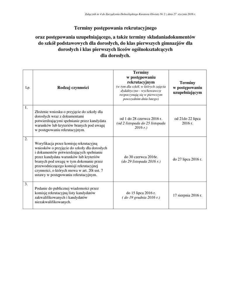 Załącznik nr 4 do Zarządzenia Dolnośląskiego Kuratora Oświaty Nr 2 z dnia 27 stycznia 2016 r. Terminy postępowania rekrutacyjnego oraz postępowania uzupełniającego, a także terminy składaniadokumentów do szkół podstawowych dla dorosłych, do klas pierwszych gimnazjów dla dorosłych i klas pierwszych liceów ogólnokształcących dla dorosłych. Terminy w postępowaniu rekrutacyjnym Lp. Rodzaj czynności (w tym dla szkół, w których zajęcia dydaktyczno - wychowawcze rozpoczynają się w pierwszym powszednim dniu lutego) Terminy w postępowaniu uzupełniającym 1. Złożenie wniosku o przyjęcie do szkoły dla dorosłych wraz z dokumentami potwierdzającymi spełnianie przez kandydata warunków lub kryteriów branych pod uwagę w postępowaniu rekrutacyjnym. od 1 do 28 czerwca 2016 r. (od 2 listopada do 25 listopada 2016 r.) od 21do 22 lipca 2016 r. 2. Weryfikacja przez komisję rekrutacyjną wniosków o przyjęcie do szkoły dla dorosłych i dokumentów potwierdzających spełnianie przez kandydata warunków lub kryteriów branych pod uwagę w tym dokonanie przez przewodniczącego komisji rekrutacyjnej czynności, o których mowa w art. 20t ust. 7 ustawy w postępowaniu rekrutacyjnym. do 30 czerwca 2016r. (do 29 listopada 2016 r.) do 27 lipca 2016 r. Podanie do publicznej wiadomości przez komisję rekrutacyjną listy kandydatów zakwalifikowanych i kandydatów niezakwalifikowanych. do 15 lipca 2016 r. ( do 19 grudnia 2016 r.) 17 sierpnia 2016 r. 3. Załącznik nr 4 do Zarządzenia Dolnośląskiego Kuratora Oświaty Nr 2 z dnia 27 stycznia 2016 r. Terminy w postępowaniu rekrutacyjnym Lp. 4. Rodzaj czynności (w tym dla szkół, w których zajęcia dydaktyczno - wychowawcze rozpoczynają się w pierwszym powszednim dniu lutego) Terminy w postępowaniu uzupełniającym Potwierdzenie przez kandydata albo rodzica kandydata niepełnoletniego woli przyjęcia w postaci przedłożenia odpowiednio: a) dokumentu potwierdzającego ukończenie klasy piątej szkoły podstawowej, w przypadku ubiegania się o przyjęcie do szkoły podstawowej dla dorosłych, b) oryginału świadectwa szkolnego promocyjnego do klasy siódmej lub ósmej ośmioletniej szkoły podstawowej albo świadectwa ukończenia sześcioletniej szkoły podstawowej, w przypadku ubiegania się o przyjęcie do gimnazjum dla dorosłych, 18 i 19 lipca 2016 r. (20 i 21 grudnia 2016 r.) 18 i 19 sierpnia 2016 r. Podanie do publicznej wiadomości przez komisję rekrutacyjną listy kandydatów przyjętych i kandydatów nieprzyjętych. do 20 lipca 2016 r. (do 22 grudnia 2016 r.) 22 sierpnia 2016 r. Poinformowanie przez dyrektora szkoły dla dorosłych kuratora oświaty o liczbie wolnych miejsc w szkole. do 20 lipca 2016 r. (do 22 grudnia 2016 r.) 22 sierpnia 2016 r. c) oryginału świadectwa ukończenia gimnazjum lub ośmioletniej szkoły podstawowej, w przypadku ubiegania się o przyjęcie do liceum ogólnokształcącego dla dorosłych, d) pisemnego oświadczenia, w przypadku kandydata do szkoły podstawowej dla dorosłych, o którym mowa w art. 20k ust. 5 ustawy, - o ile nie zostały one złożone wraz z wnioskiem o przyjęcie do szkoły dla dorosłych. 5. 6.