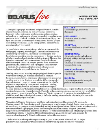www.Belarus-Live.eu NEWSLETTER 02/11-08/11/07 4 listopada opozycja białoruska zorganizowała w Mińsku Marsz Socjalny. Miał on na celu wyrażenie sprzeciwu ludności wobec zniesienia ulg (stosowna ustawa została uchwalona w parlamencie wiosną tego roku) oraz obniżeniu poziomu życia. Jednak ta akcja, jak wskazują analitycy, nie była zbyt udana. Uczestniczyło w niej około półtora tysiąca osób (dla porównania: Marsz Europejski 14 października przyciągnął 5-7 tys. osób). W przededniu Marszu Socjalnego władze przeprowadziły tradycyjną „czystkę prewencyjną” (dokonano aresztowań działaczy opozycyjnych), materiały informacyjne były konfiskowane, milicja czyniła przeszkody w drodze na akcję działaczy regionalnych. Jednocześnie w trakcje Marszu, jak i po nim zatrzymań nie odnotowano. Grupie działaczy młodzieżowych udało się przejść główną ulicą miasta do gmachu Rady Ministrów i tam wyciągnąć transparenty z hasłami. Tą względną uległość władz obserwatorzy tłumaczą chęcią „przypodobania się Europie”. POLITYKA Nowe sankcje przeciwko Białorusi OFICJALNIE Białoruś prosi o kredyt Wenezuelę OPOZYCJA Ulicami Mińska przeszedł Marsz Socjalny GOSPODARKA Rosja nie zamierza budować drugiej nitki gazociągu JamałEuropa Białoruś nie może handlować wenezuelską ropą SPOŁECZEŃSTWO Studenci EHU zakładają własną organizację Według nich Marsz Socjalny nie przyciągnął tłumów przede wszystkim dlatego, że ludność na razie nie odczuła konsekwencji ustawy o zniesieniu ulg socjalnych, ponieważ KULTURA wejdzie ona w życie dopiero w grudniu. Wówczas między Wystawa portretów znanych innymi studenci i emeryci stracą uprawnienia do biletów postaci białoruskich ulgowych na przejazdy transportem miejskim. Według prognoz, niezadowolenie elektoratu może wzrosną na wiosnę, ponieważ w tym czasie mają też zdrożeć usługi komunalne, co jest skutkiem wzrostu cen rosyjskich surowców energetycznych. Ponadto jest prognozowany znaczny wzrost cen produktów spożywczych i innych towarów na Białorusi. Warto zaznaczyć, iż ostatnio już zdrożał nabiał, niektóre produkty stały się deficytowe, a inflacja, według ekonomistów niezależnych, znacznie przewyższa statystyki oficjalne. Wracając do Marszu Socjalnego, analitycy wytykają słabe punkty opozycji. W szeregach Zjednoczonych Sił Demokratycznych obserwujemy brak jednomyślności. Partie prawicowe słabo uczestniczyły w przygotowaniach do akcji zainicjowanej przez lewicę. Nie wykazała się aktywnością również młodzież opozycyjna, która zarzuca organizatorom Marszu uległość (ponieważ zaaprobowali wyznaczoną przez władzę trasę, i w rezultacie manifestacja odbyła się w parku z dala od centrum miasta, w miejscu, które młodzi działacze pogardliwie nazywają „placem do wyprowadzania psów”). Słaba i szablonowa była reklama marszu. Z kolei władze 1-2 listopada zorganizowały I Zjazd Naukowców Białoruskich. W swym przemówieniu Alaksandar Łukaszenka skoncentrował się na konieczności wdrażania 1 www.Belarus-Live.eu innowacyjnych rozwiązań w kraju. Jak powiedział, przyszedł czas srogiego rozliczania naukowców z wyników gospodarczych ich wynalazków. Według politologa Valera Karbalewicza, ten cel jest niewykonalny w warunkach białoruskiego modelu socjalno-gospodarczego. „Zasadniczy problem polega na tym, że Akademia Nauk i wszystkie pozostałe instytucje naukowe Białorusi nie działają w warunkach wolnego rynku i konkurencji. W tej sytuacji Narodowa Akademia Nauk nie może być niczym innym, jak typową radziecką instytucją działającą w warunkach gospodarki socjalistycznej ze wszystkimi jej przymiotami... W tej sytuacji produkt naukowy nie jest oceniany przez rynek, tylko przez biurokratów, nie jest ceniony utalentowany naukowiec, tylko człowiek wygodny dla władz.” Wymowny szczegół: według doniesień mediów niezależnych, treść przemówień na zjeździe wcześniej została uzgodniona z zarządem Akademii Nauk (na jej czele stoi powołany ukazem prezydenta w 2002 r. były naczelnik jego administracji Michaił Miaśnikowicz). Były prezydent Akademii Nauk, obecnie opozycjonista Alaksandar Wajtowicz przypomina, że swego czasu pod koniec lat 90-tych przedstawił rządowi propozycje w sprawie rozwoju innowacyjności, utworzenia w kraju parku wysokich technologii, wykorzystania rodzimych gatunków paliwa. Jak mówi, wtedy rządzący w żaden sposób nie zareagowalina te propozycje, gdyż oczekiwali dalszego wsparcia ze strony Rosji. Jak widać, odpowiednia strategia znalazła zrozumienie władz z dużym opóźnieniem. Ponadto akademik Wojtowicz uważa, że do rozwoju innowacyjności w kraju brakuje obecnie warunków zarówno politycznych, jak i gospodarczych, a powodem tego jest anachroniczny system zarządzania państwem. Z kolei Rosja zamierza kontynuować politykę sprowadzania stosunków z Białorusią do poziomu pragmatyzmu rynkowego. Podkreślają to analitycy w swych komentarzach z okazji konferencji prasowej ambasadora Rosji na Białorusi Aleksandra Surykowa, zorganizowanej 1 listopada. Nie padło tam zapewnienie, że Białoruś uzyska w tym roku kredyt w wysokości 1,5 mld. dolarów, czego Mińsk od początku roku domaga się od Moskwy w związku ze zdrożeniem surowców energetycznych. Ponadto Surykow dał do zrozumienia, że strona rosyjska nie zamierza budować przez Białoruś drugiej nitki gazociągu Jamał-Europa (taką propozycję z obietnicą ulg na tranzyt złożył prezydent Białorusi), ponieważ za lepsze rozwiązanie uważa budowę gazociągu Północnego, który pozwoli dostarczać gaz do Europy bez pośredników. Obserwatorzy tłumaczą, iż taki wybór Rosji jest skutkiem lekcji „wojny gazowej”, w czasie której Mińsk szantażował Rosję ceną tranzytu ropy i gazu żądając tanich dostaw. Jednocześnie ambasador poinformował o możliwym spotkaniu prezydentów Białorusi i Rosji w gr