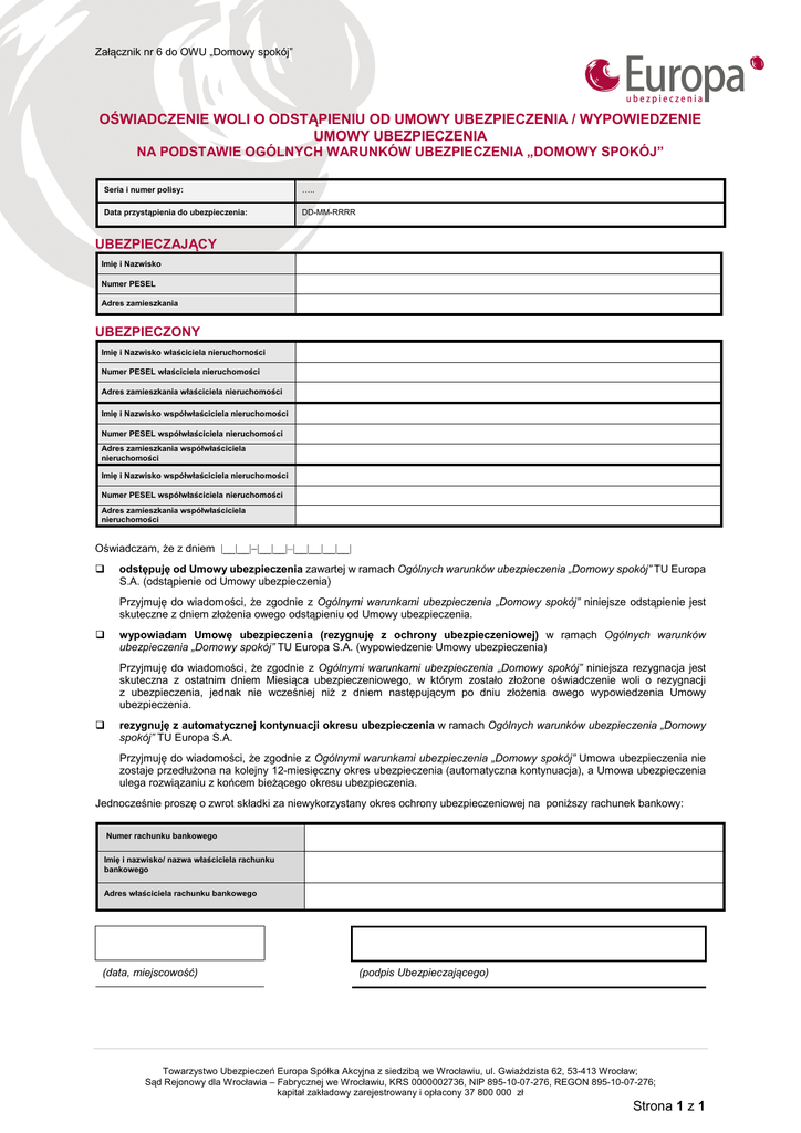 Załącznik nr 6 do OWU „Domowy spokój” OŚWIADCZENIE WOLI O ODSTĄPIENIU OD UMOWY UBEZPIECZENIA / WYPOWIEDZENIE UMOWY UBEZPIECZENIA NA PODSTAWIE OGÓLNYCH WARUNKÓW UBEZPIECZENIA „DOMOWY SPOKÓJ” Seria i numer polisy: ….. Data przystąpienia do ubezpieczenia: DD-MM-RRRR UBEZPIECZAJĄCY Imię i Nazwisko Numer PESEL Adres zamieszkania UBEZPIECZONY Imię i Nazwisko właściciela nieruchomości Numer PESEL właściciela nieruchomości Adres zamieszkania właściciela nieruchomości Imię i Nazwisko współwłaściciela nieruchomości Numer PESEL współwłaściciela nieruchomości Adres zamieszkania współwłaściciela nieruchomości Imię i Nazwisko współwłaściciela nieruchomości Numer PESEL współwłaściciela nieruchomości Adres zamieszkania współwłaściciela nieruchomości Oświadczam, że z dniem |__|__|−|__|__|–|__|__|__|__| odstępuję od Umowy ubezpieczenia zawartej w ramach Ogólnych warunków ubezpieczenia „Domowy spokój” TU Europa S.A. (odstąpienie od Umowy ubezpieczenia) Przyjmuję do wiadomości, że zgodnie z Ogólnymi warunkami ubezpieczenia „Domowy spokój” niniejsze odstąpienie jest skuteczne z dniem złożenia owego odstąpieniu od Umowy ubezpieczenia. wypowiadam Umowę ubezpieczenia (rezygnuję z ochrony ubezpieczeniowej) w ramach Ogólnych warunków ubezpieczenia „Domowy spokój” TU Europa S.A. (wypowiedzenie Umowy ubezpieczenia) Przyjmuję do wiadomości, że zgodnie z Ogólnymi warunkami ubezpieczenia „Domowy spokój” niniejsza rezygnacja jest skuteczna z ostatnim dniem Miesiąca ubezpieczeniowego, w którym zostało złożone oświadczenie woli o rezygnacji z ubezpieczenia, jednak nie wcześniej niż z dniem następującym po dniu złożenia owego wypowiedzenia Umowy ubezpieczenia. rezygnuję z automatycznej kontynuacji okresu ubezpieczenia w ramach Ogólnych warunków ubezpieczenia „Domowy spokój” TU Europa S.A. Przyjmuję do wiadomości, że zgodnie z Ogólnymi warunkami ubezpieczenia „Domowy spokój” Umowa ubezpieczenia nie zostaje przedłużona na kolejny 12-miesięczny okres ubezpieczenia (automatyczna kontynuacja), a Umowa ubezpieczenia ulega rozwiązaniu z końcem bieżącego okresu ubezpieczenia. Jednocześnie proszę o zwrot składki za niewykorzystany okres ochrony ubezpieczeniowej na poniższy rachunek bankowy: Numer rachunku bankowego Imię i nazwisko/ nazwa właściciela rachunku bankowego Adres właściciela rachunku bankowego (data, miejscowość) (podpis Ubezpieczającego) Towarzystwo Ubezpieczeń Europa Spółka Akcyjna z siedzibą we Wrocławiu, ul. Gwiaździsta 62, 53-413 Wrocław; Sąd Rejonowy dla Wrocławia – Fabrycznej we Wrocławiu, KRS 0000002736, NIP 895-10-07-276, REGON 895-10-07-276; kapitał zakładowy zarejestrowany i opłacony 37 800 000 zł Strona 1 z 1