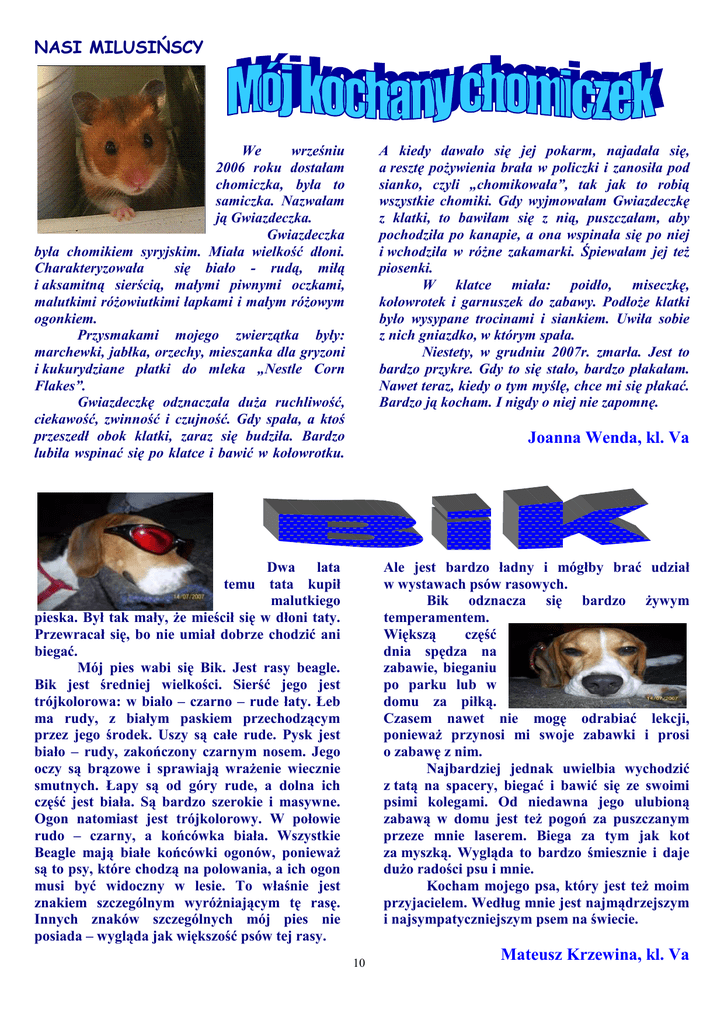 NASI MILUSIŃSCY We wrześniu 2006 roku dostałam chomiczka, była to samiczka. Nazwałam ją Gwiazdeczka. Gwiazdeczka była chomikiem syryjskim. Miała wielkość dłoni. Charakteryzowała się biało - rudą, miłą i aksamitną sierścią, małymi piwnymi oczkami, malutkimi róŜowiutkimi łapkami i małym róŜowym ogonkiem. Przysmakami mojego zwierzątka były: marchewki, jabłka, orzechy, mieszanka dla gryzoni i kukurydziane płatki do mleka „Nestle Corn Flakes”. Gwiazdeczkę odznaczała duŜa ruchliwość, ciekawość, zwinność i czujność. Gdy spała, a ktoś przeszedł obok klatki, zaraz się budziła. Bardzo lubiła wspinać się po klatce i bawić w kołowrotku. A kiedy dawało się jej pokarm, najadała się, a resztę poŜywienia brała w policzki i zanosiła pod sianko, czyli „chomikowała”, tak jak to robią wszystkie chomiki. Gdy wyjmowałam Gwiazdeczkę z klatki, to bawiłam się z nią, puszczałam, aby pochodziła po kanapie, a ona wspinała się po niej i wchodziła w róŜne zakamarki. Śpiewałam jej teŜ piosenki. W klatce miała: poidło, miseczkę, kołowrotek i garnuszek do zabawy. PodłoŜe klatki było wysypane trocinami i siankiem. Uwiła sobie z nich gniazdko, w którym spała. Niestety, w grudniu 2007r. zmarła. Jest to bardzo przykre. Gdy to się stało, bardzo płakałam. Nawet teraz, kiedy o tym myślę, chce mi się płakać. Bardzo ją kocham. I nigdy o niej nie zapomnę. Dwa lata temu tata kupił malutkiego pieska. Był tak mały, Ŝe mieścił się w dłoni taty. Przewracał się, bo nie umiał dobrze chodzić ani biegać. Mój pies wabi się Bik. Jest rasy beagle. Bik jest średniej wielkości. Sierść jego jest trójkolorowa: w biało – czarno – rude łaty. Łeb ma rudy, z białym paskiem przechodzącym przez jego środek. Uszy są całe rude. Pysk jest biało – rudy, zakończony czarnym nosem. Jego oczy są brązowe i sprawiają wraŜenie wiecznie smutnych. Łapy są od góry rude, a dolna ich część jest biała. Są bardzo szerokie i masywne. Ogon natomiast jest trójkolorowy. W połowie rudo – czarny, a końcówka biała. Wszystkie Beagle mają białe końcówki ogonów, poniewaŜ są to psy, które chodzą na polowania, a ich ogon musi być widoczny w lesie. To właśnie jest znakiem szczególnym wyróŜniającym tę rasę. Innych znaków szczególnych mój pies nie posiada – wygląda jak większość psów tej rasy. Ale jest bardzo ładny i mógłby brać udział w wystawach psów rasowych. Bik odznacza się bardzo Ŝywym temperamentem. Większą część dnia spędza na zabawie, bieganiu po parku lub w domu za piłką. Czasem nawet nie mogę odrabiać lekcji, poniewaŜ przynosi mi swoje zabawki i prosi o zabawę z nim. Najbardziej jednak uwielbia wychodzić z tatą na spacery, biegać i bawić się ze swoimi psimi kolegami. Od niedawna jego ulubioną zabawą w domu jest teŜ pogoń za puszczanym przeze mnie laserem. Biega za tym jak kot za myszką. Wygląda to bardzo śmiesznie i daje duŜo radości psu i mnie. Kocham mojego psa, który jest teŜ moim przyjacielem. Według mnie jest najmądrzejszym i najsympatyczniejszym psem na świecie. Joanna Wenda, kl. Va 10 Mateusz Krzewina, kl. Va
