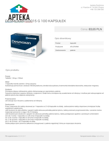 Apteka Rodzinna ul. Piastów 8, 74-500 Chojna +48 725 298 530 DESMOXAN 0,0015 G 100 KAPSUŁEK Cena: 83,65 PLN Opis słownikowy Postać kapsułki Producent AFLOFARM Zastosowanie palenie Opis produktu Postać Tabletki, 1,5mg x 100szt. Skład 1 kapsułka twarda zawiera 1,5mg cytyzyny. Substancje pomocnicze: celuloza mikrokrystaliczna, skrobia kukurydziana, krzemionka koloidalna bezwodna, stearynian magnezu. Działanie Zmniejsza objawy odstawienia, głodu nikotynowego po zaprzestaniu palenia. Cytyzyna stopniowo wypiera nikotynę z organizmu. Dzięki temu zmniejsza się uzuależnienie od nikotyny i możliwe jest odzwyczajenie od palenia tytoniu bez objawów abstynencji. Przeznaczenie Lek stosuje się w leczeniu uzależnienia od nikotyny. Dawkowanie Przez 3 pierwsze dni należy stosować po 1 kapsułce co 2 h (6 kapsułek na dobę). Jednocześnie należy stopniowo zmniejszać liczbę wypalanych papierosów. Jeśli leczenie nie dało efektów i pacjent nadal odczuwa potrzebę palenia tytoniu, należy przerwać przyjmowanie leku. Leczenie można rozpocząć ponownie w ciągu 2 do 3 miesięcy. Jeśli leczenie jest skuteczne i pacjent nie odczuwa potrzeby palenia tytoniu, należy postępować zgodnie z poniższym schematem: od 4 do 12 dnia: 1 kapsułka co 2,5h (max 5 kapsulek na dobę), od 13 do 16 dnia 1 kapsułka co 3h (max 4 kapsułki na dobę), od 17 do 20 dnia 1 kapsułka co 5h (max 3 kapsułki na dobę), od 21 do 25 dnia 1 do 2 kapsułek na dobę. Osoba paląca tytoń powinna całkowicie zrezygnować z palenia najpóźniej 5 dnia po rozpoczęciu leczenia. Plik wygenerowano: 02-03-2017 Oprogramowanie sklepu: AptusShop Apteka Rodzinna ul. Piastów 8, 74-500 Chojna +48 725 298 530 Przeciwwskazania Uczulenie na którykolwiek ze składników preparatu, niestabilna dławica piersiowa, przebyty niedawno zawał serca lub udar mózgu, istotne klinicznie zaburzenia rytmu serca, ciąża lub karmienie piersią. Plik wygenerowano: 02-03-2017 Powered by TCPDF (www.tcpdf.org) Oprogramowanie sklepu: AptusShop