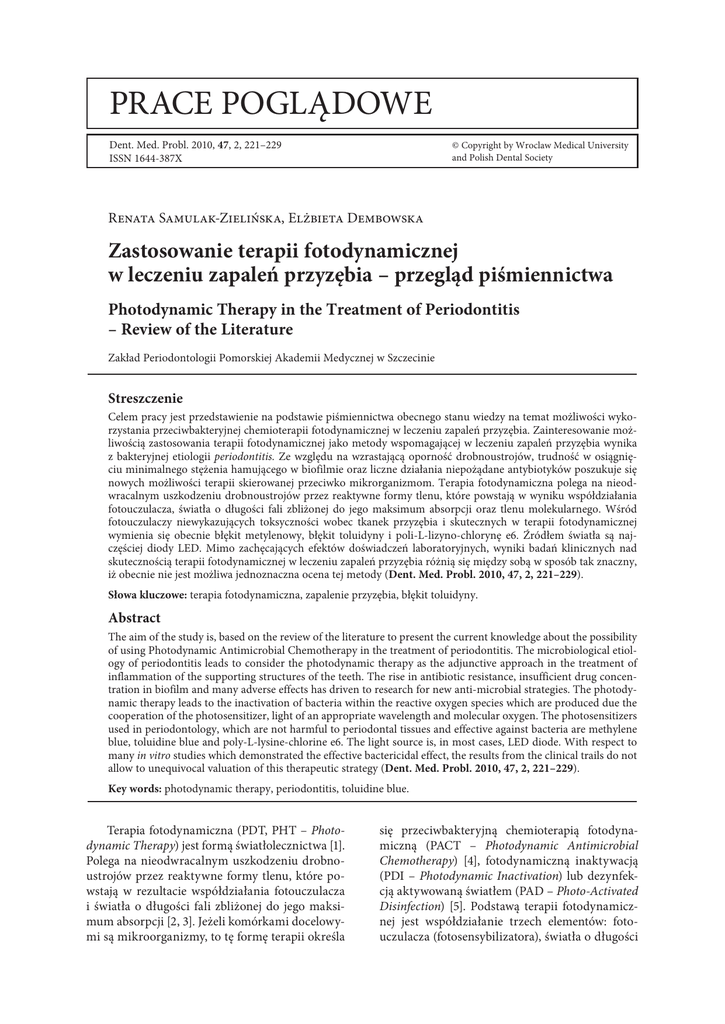 prace poglądowe Dent. Med. Probl. 2010, 47, 2, 221–229 ISSN 1644-387X © Copyright by Wroclaw Medical University and Polish Dental Society Renata Samulak-Zielińska, Elżbieta Dembowska Zastosowanie terapii fotodynamicznej w leczeniu zapaleń przyzębia – przegląd piśmiennictwa Photodynamic Therapy in the Treatment of Periodontitis – Review of the Literature Zakład Periodontologii Pomorskiej Akademii Medycznej w Szczecinie Streszczenie Celem pracy jest przedstawienie na podstawie piśmiennictwa obecnego stanu wiedzy na temat możliwości wykorzystania przeciwbakteryjnej chemioterapii fotodynamicznej w leczeniu zapaleń przyzębia. Zainteresowanie możliwością zastosowania terapii fotodynamicznej jako metody wspomagającej w leczeniu zapaleń przyzębia wynika z bakteryjnej etiologii periodontitis. Ze względu na wzrastającą oporność drobnoustrojów, trudność w osiągnięciu minimalnego stężenia hamującego w biofilmie oraz liczne działania niepożądane antybiotyków poszukuje się nowych możliwości terapii skierowanej przeciwko mikrorganizmom. Terapia fotodynamiczna polega na nieodwracalnym uszkodzeniu drobnoustrojów przez reaktywne formy tlenu, które powstają w wyniku współdziałania fotouczulacza, światła o długości fali zbliżonej do jego maksimum absorpcji oraz tlenu molekularnego. Wśród fotouczulaczy niewykazujących toksyczności wobec tkanek przyzębia i skutecznych w terapii fotodynamicznej wymienia się obecnie błękit metylenowy, błękit toluidyny i poli-L-lizyno-chlorynę e6. Źródłem światła są najczęściej diody LED. Mimo zachęcających efektów doświadczeń laboratoryjnych, wyniki badań klinicznych nad skutecznością terapii fotodynamicznej w leczeniu zapaleń przyzębia różnią się między sobą w sposób tak znaczny, iż obecnie nie jest możliwa jednoznaczna ocena tej metody (Dent. Med. Probl. 2010, 47, 2, 221–229). Słowa kluczowe: terapia fotodynamiczna, zapalenie przyzębia, błękit toluidyny. Abstract The aim of the study is, based on the review of the literature to present the current knowledge about the possibility of using Photodynamic Antimicrobial Chemotherapy in the treatment of periodontitis. The microbiological etiology of periodontitis leads to consider the photodynamic therapy as the adjunctive approach in the treatment of inflammation of the supporting structures of the teeth. The rise in antibiotic resistance, insufficient drug concentration in biofilm and many adverse effects has driven to research for new anti-microbial strategies. The photodynamic therapy leads to the inactivation of bacteria within the reactive oxygen species which are produced due the cooperation of the photosensitizer, light of an appropriate wavelength and molecular oxygen. The photosensitizers used in periodontology, which are not harmful to periodontal tissues and effective against bacteria are methylene blue, toluidine blue and poly-L-lysine-chlorine e6. The light source is, in most cases, LED diode. With respect to many in vitro studies which demonstrated the effective bactericidal effect, the results from the clinical trails do not allow to unequivocal valuation of this therapeutic strategy (Dent. Med. Probl. 2010, 47, 2, 221–229). Key words: photodynamic therapy, periodontitis, toluidine blue. Terapia fotodynamiczna (PDT, PHT – Photodynamic Therapy) jest formą światłolecznictwa [1]. Polega na nieodwracalnym uszkodzeniu drobnoustrojów przez reaktywne formy tlenu, które powstają w rezultacie współdziałania fotouczulacza i światła o długości fali zbliżonej do jego maksimum absorpcji [2, 3]. Jeżeli komórkami docelowymi są mikroorganizmy, to tę formę terapii określa się przeciwbakteryjną chemioterapią fotodynamiczną (PACT – Photodynamic Antimicrobial Chemotherapy) [4], fotodynamiczną inaktywacją (PDI – Photodynamic Inactivation) lub dezynfekcją aktywowaną światłem (PAD – Photo-Activated Disinfection) [5]. Podstawą terapii fotodynamicznej jest współdziałanie trzech elementów: fotouczulacza (fotosensybilizatora), światła o długości 222 fali dostosowanej do widma absorpcyjnego danego fotouczulacza oraz tlenu [6, 7]. Zainteresowanie możliwością zastosowania PHT w leczeniu zapaleń przyzębia wynika z bakteryjnej etiologii periodontitis. Podstawową metodą leczenia pozostaje nadal mechaniczne usuwanie złogów nazębnych, lecz niektóre sytuacje kliniczne wymagają dodatkowego zastosowania antybiotyków [8]. Z antybiotykoterapią w periodontitis wiążą się istotne ograniczenia: wzrastająca oporność drobnoustrojów, trudność w osiągnięciu MIC (Minimal Inhibitory Concentration – minimalnego stężenia hamującego) w biofilmie oraz liczne działania niepożądane antybiotyków [1]. Próby zastosowania PACT w periodontologii trwają od lat 90. XX wieku [9]. Zachętą do działań w tym kierunku jest brak możliwości rozwoju wśród mikroorganizmów oporności wobec reaktywnych form tlenu [7]. Celem pracy było przedstawienie, na podstawie przeglądu piśmiennictwa, obecnego stanu wiedzy na temat możliwości wykorzystania przeciwbakteryjnej chemioterapii fotodynamicznej w leczeniu zapaleń przyzębia. Mechanizm terapii fotodynamicznej Mechanizmy odpowiedzialne za PACT nie są jeszcze w pełni poznane [10]. Wiadomo, że w wyniku naświetlenia fotouczulacza światłem o długości fali odpowiadającej jego maksimum absorpcji dochodzi do wzbudzenia fotosensybilizatora. Wzbudzony fotouczulacz, przebywając w stanie tripletowym, może następnie reagować w dwojaki sposób, w zależności od dostępności tlenu w środowisku reakcji. Przy małym stężeniu tlenu zachodzi pierwszy typ reakcji nazwany mechanizmem wolnorodnikowym [10]. Fotouczulacz przekazuje elektron lub atom wodoru substancji ze swojego najbliższego otoczenia, która staje się wolnym rodnikiem [2, 9]. One natomiast w krótkim czasie reagują z tlenem molekularnym (cząs teczkowym) rozpuszczonym w cytoplazmie l