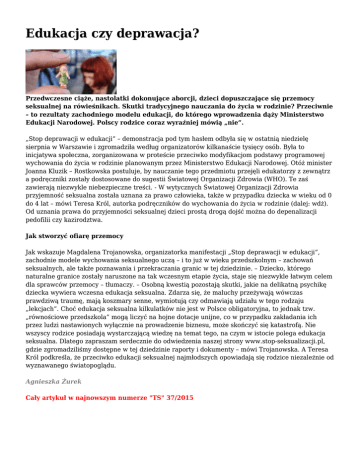 Edukacja czy deprawacja? Przedwczesne ciąże, nastolatki dokonujące aborcji, dzieci dopuszczające się przemocy seksualnej na rówieśnikach. Skutki tradycyjnego nauczania do życia w rodzinie? Przeciwnie – to rezultaty zachodniego modelu edukacji, do którego wprowadzenia dąży Ministerstwo Edukacji Narodowej. Polscy rodzice coraz wyraźniej mówią „nie”. „Stop deprawacji w edukacji” – demonstracja pod tym hasłem odbyła się w ostatnią niedzielę sierpnia w Warszawie i zgromadziła według organizatorów kilkanaście tysięcy osób. Była to inicjatywa społeczna, zorganizowana w proteście przeciwko modyfikacjom podstawy programowej wychowania do życia w rodzinie planowanym przez Ministerstwo Edukacji Narodowej. Otóż minister Joanna Kluzik – Rostkowska postuluje, by nauczanie tego przedmiotu przejęli edukatorzy z zewnątrz a podręczniki zostały dostosowane do sugestii Światowej Organizacji Zdrowia (WHO). Te zaś zawierają niezwykle niebezpieczne treści. - W wytycznych Światowej Organizacji Zdrowia przyjemność seksualna została uznana za prawo człowieka, także w przypadku dziecka w wieku od 0 do 4 lat – mówi Teresa Król, autorka podręczników do wychowania do życia w rodzinie (dalej: wdż). Od uznania prawa do przyjemności seksualnej dzieci prostą drogą dojść można do depenalizacji pedofilii czy kazirodztwa. Jak stworzyć ofiarę przemocy Jak wskazuje Magdalena Trojanowska, organizatorka manifestacji „Stop deprawacji w edukacji”, zachodnie modele wychowania seksualnego uczą – i to już w wieku przedszkolnym – zachowań seksualnych, ale także poznawania i przekraczania granic w tej dziedzinie. – Dziecko, którego naturalne granice zostały naruszone na tak wczesnym etapie życia, staje się niezwykle łatwym celem dla sprawców przemocy – tłumaczy. – Osobną kwestią pozostają skutki, jakie na delikatną psychikę dziecka wywiera wczesna edukacja seksualna. Zdarza się, że maluchy przeżywają wówczas prawdziwą traumę, mają koszmary senne, wymiotują czy odmawiają udziału w tego rodzaju „lekcjach”. Choć edukacja seksualna kilkulatków nie jest w Polsce obligatoryjna, to jednak tzw. „równościowe przedszkola” mogą liczyć na hojne dotacje unijne, co w przypadku zakładania ich przez ludzi nastawionych wyłącznie na prowadzenie biznesu, może skończyć się katastrofą. Nie wszyscy rodzice posiadają wystarczającą wiedzę na temat tego, na czym w istocie polega edukacja seksualna. Dlatego zapraszam serdecznie do odwiedzenia naszej strony www.stop-seksualizacji.pl, gdzie zgromadziliśmy dostępne w tej dziedzinie raporty i dokumenty – mówi Trojanowska. A Teresa Król podkreśla, że przeciwko edukacji seksualnej najmłodszych opowiadają się rodzice niezależnie od wyznawanego światopoglądu. Agnieszka Żurek Cały artykuł w najnowszym numerze "TS" 37/2015