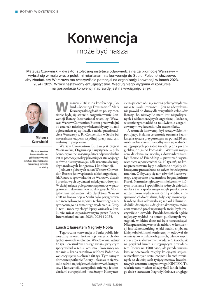 ROTARY W DYSTRYKCIE Konwencja może być nasza Mateusz Czerwiński – dyrektor stołecznej instytucji odpowiedzialnej za promocję Warszawy – wybrał się w maju wraz z polskimi rotarianami na konwencję do Seulu. Pojechał służbowo, aby zbadać, czy Warszawa ma rzeczywiście potencjał na organizację konwencji w latach 2023, 2024 i 2025. Wrócił nastawiony entuzjastycznie. Według niego wygrana w konkursie na gospodarza konwencji naprawdę jest na wyciągnięcie ręki. marcu 2016 r. na konferencji „Poland – Meetings Destination” Mark Krawczyński ogłosił, że polscy rotarianie będą się starać o zorganizowanie konwencji Rotary International w stolicy. Wówczas Warsaw Convention Bureau pracowało już od czterech miesięcy z władzami dystryktu nad ogłoszeniem tej aplikacji, a udział przedstawiciela Warszawy w RI Convention w Seulu był naturalnym etapem wspólnej pracy nad tym ambitnym projektem. Warsaw Convention Bureau jest częścią Warszawskiej Organizacji Turystycznej – publiczno-prywatnej instytucji, która odpowiedzialna jest za promocję stolicy jako miejsca atrakcyjnego zarówno dla turystów, jak i dla uczestników międzynarodowych kongresów i konferencji. Jednym z głównych zadań Warsaw Convention Bureau jest wspieranie takich organizacji, jak Rotary w sprowadzaniu do Warszawy dużych i prestiżowych wydarzeń międzynarodowych. W dużej mierze polega ono na pomocy w przygotowaniu dokumentów aplikacyjnych. Moim głównym zadaniem jako dyrektora Warsaw CvB na konwencji w Seulu było przygotowanie szczegółowego raportu technicznego i merytorycznego na temat tego wydarzenia. Dzięki temu możemy złożyć lepszy wniosek w konkursie miast organizowanym przez Rotary International na lata 2023, 2024 i 2025. W Mateusz Czerwiński Dyrektor Warsaw Convention Bureau – publiczno-prywatnej instytucji odpowiedzialnej za promocję turystyki w stolicy Lunch z laureatem Nagrody Nobla Tegoroczna konwencja w Seulu pobiła historyczny rekord frekwencji wszystkich dotychczasowych wydarzeń. Wzięło w niej udział 45 tys. uczestników z całego świata, przy czym spory wkład w ten sukces mieli koreańscy rotarianie – liczba członków w Korei Południowej oscyluje w okolicach 60 tys. Tym samym doroczne spotkanie Rotary uplasowało się wysoko wśród największych światowych kongresów i konwencji, szczególnie mierząc je standardami europejskimi – na Starym Kontynen10 R O T A R IA N IN 5 2016 cie na palcach obu rąk można policzyć wydarzenia o tej skali i rozmachu. Jest to zdecydowanie powód do dumy dla wszystkich członków Rotary, bo niezwykle mało jest niepolitycznych i niekomercyjnych organizacji, które są w stanie zgromadzić na tak świetnie zorganizowanym wydarzeniu tylu uczestników. A rozmach konwencji był rzeczywiście imponujący. Hala na ceremonię otwarcia i zamknięcia została przygotowana na ponad 20 tys. osób, a obie ceremonie odbywały się w dwóch następujących po sobie turach: jedna po angielsku, druga po koreańsku. Ważnym miejscem dzielenia się wiedzą i doświadczeniami był House of Friendship – przestrzeń wystawiennicza o powierzchni ok. 10 tys. m², na której prezentowane były niezliczone projekty dobroczynne prowadzone na całym świecie przez rotarian. Odbywały się tam również liczne występy artystyczne prezentujące bogatą kulturę Korei. Natomiast głównym miejscem, w którym rotarianie i specjaliści z różnych dziedzin nauki i życia społecznego mogli przekazywać uczestnikom wydarzenia cenną wiedzę i inspirować ich do działania, były sesje równoległe. Każdego dnia odbywało się ich od kilkunastu do kilkudziesięciu, a dzięki znakomitym mówcom wartość przekazywanych treści była rzeczywiście niezwykła. Przykładem niech będzie najlepszy wykład na temat publicznych wystąpień, w jakim dane mi było uczestniczyć. Niezaprzeczalną wartością udziału w konwencji jest też networking, o jaki trudno chyba na jakiejkolwiek innej konferencji – odbywał się on nie tylko w trakcie oficjalnych, biletowanych i przez to ekskluzywnych wydarzeń, takich jak na przykład lunch z ustępującym prezydentem Rotary na 1500 osób, ale przede wszystkim w przerwach między kolejnymi sesjami w niezliczonych restauracjach i barach rozsianych na dziesiątkach tysięcy metrów kwadratowych centrum kongresowego KINTEX. To właśnie tam miałem okazję zjeść lunch jednego dnia z laureatem Nagrody Nobla, a drugiego ROTARY W DYSTRYKCIE z emerytowanym kapitanem atomowej łodzi podwodnej, który zapytany, czym się teraz zajmuje, odpowiedział: „I do Rotary now”. Zmiana zasad = większe szanse dla Warszawy Z punktu widzenia starań Warszawy i Polski o konwencję Rotary na lata 2023, 2024 lub 2025 najważniejszą sesją był jednak warsztat poświęcony zasadom konkursów destynacji na gospodarza RI Convention, jakie regularnie prowadzi organizacja. Najważniejszymi wnioskami płynącymi dla Warszawy z tego warsztatu było ogłoszenie dwóch nowych zasad: w nadchodzących konkursach zarząd Rotary International będzie miał prawo wybrać priorytetowego dla siebie kandydata, nawet jeśli ten nie będzie spełniał w 100% wszystkich wymogów formalnych. Kolejne konwencje będą też miały bardziej otwarty charakter – w programie będą mogły znajdować się wydarzenia, w którym rotarianie spotykają się z nie-rotarianami, a ci ostatni będą również mogli brać udział w wybranych częściach konwencji. Oznacza to nie tylko zwiększenie szans dla Warszawy na wygranie konkursu, ale również może zaowocować wzrostem liczby członków Rotary w Polsce, gdyby konwencję udało się zorganizować w Warszawie. W trakcie warsztatu bardzo wyraźnie został też podkreślony jeden z kluczowych czynników sukcesu w staraniach o wydarzenie – entuzjazm, poparcie i zaangażowanie wszystkich rotarian z kandydującego dystryktu. Kompaktowe, zrównoważone, interesujące Po zebraniu materiałów z warsztat