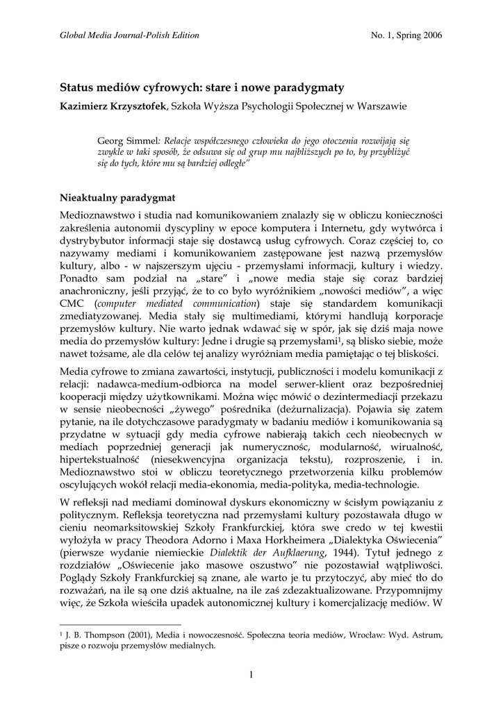 J. B. Thompson (2001), Media i nowoczesność. Społeczna teoria mediów, Wrocław: Wyd. Astrum,