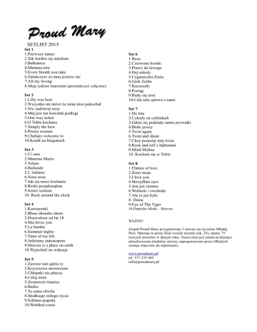 SETLIST 2015 Set 1 1.Pierwszy taniec 2.Tak bardzo się starałem 3.Bałkanica 4.Mamma mia 5.Every breath you take 6.Zatańczysz ze mną jeszcze raz 7.All my loving 8.Moje jedyne marzenie (przetańczyć całą noc) Set 2 1.Lilly was here 2.Wszystko mi mówi że mnie ktoś pokochał 3.Nie zadzieraj nosa 4.Mój jest ten kawałek podłogi 5.One way ticket 6.O Tobie kochana 7.Simply the best 8.Preety woman 9.Chałupy welcome to 10.Konik na biegunach Set 3 1.Ci sara 2.Mamma Maria 3.Volare 4.Bailando 5.L`italiano 6.Nosa nosa 7.Jak się masz kochanie 8.Rzeki przepłynąłem 9.Jesteś szalona 10. Rock around the clock Set 4 1.Kawiarenki 2.Blues shoudes shoes 3.Dozwolone od lat 18 4.She loves you 5.La bamba 6.Summer nights 7.Time of my life 8.Jedziemy autostopem 9.Heaven is a place on earth 10.Wyjechali na wakacje Set 5 1.Zawsze tam gdzie ty 2.Kryzysowa narzeczona 3.Chłopaki nie płaczą 4.Całuj mnie 5.Zostawcie titanica 6.Baśka 7.Ta sama chwila 8.Słodkiego miłego życia 9.Szklana pogoda 10.Wehikuł czasu Set 6 1.Boso 2.Czerwone korale 3.Prawy do lewego 4.Hej sokoły 5.Cyganeczka Zosia 6.Grek Zorba 7.Kaczuszki 8.Pociąg 9.Rudy się żeni 10.Cała sala spiewa z nami Set 7 1.Do lata 2.Cykady na cykladach 3.Gdzie się podziały tamte prywatki 4.Białe jerozy 5.Twist again 6.Twist and shout 7.Choć pomaluj mój świat 8.Rock and roll z bębanami 9.Miód Malina 10. Kocham się w Tobie Set 8 1.Flames of love 2.Żono moja 3.I love you 4.Skrzydlate ręce 5.Jest już ciemno 6.Wolnośc i swoboda 7.Ale to już było 8. Diana 9.Eye of The Tiger 10.Depeche Mode – Heaven WAŻNE! Zespół Proud Mary przygotowuje 3 utwory na życzenie Młodej Pary. Mnożąc to przez ilość wesele rocznie (ok. 25), mamy 75 nowych utworów w danym roku. Nasza lista jest zatem na bieżąco aktualizowana (niektóre utwory zaproponowane przez Młodych zostają włączone do repertuaru). www.proudmary.pl tel. 571 255 445 [email protected]