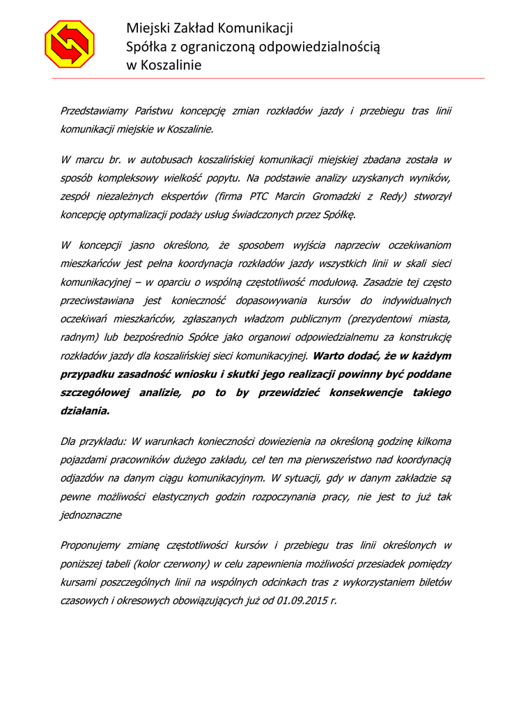 Miejski Zakład Komunikacji Spółka z ograniczoną odpowiedzialnością w Koszalinie Przedstawiamy Państwu koncepcję zmian rozkładów jazdy i przebiegu tras linii komunikacji miejskie w Koszalinie. W marcu br. w autobusach koszalińskiej komunikacji miejskiej zbadana została w sposób kompleksowy wielkość popytu. Na podstawie analizy uzyskanych wyników, zespół niezależnych ekspertów (firma PTC Marcin Gromadzki z Redy) stworzył koncepcję optymalizacji podaży usług świadczonych przez Spółkę. W koncepcji jasno określono, że sposobem wyjścia naprzeciw oczekiwaniom mieszkańców jest pełna koordynacja rozkładów jazdy wszystkich linii w skali sieci komunikacyjnej – w oparciu o wspólną częstotliwość modułową. Zasadzie tej często przeciwstawiana jest konieczność dopasowywania kursów do indywidualnych oczekiwań mieszkańców, zgłaszanych władzom publicznym (prezydentowi miasta, radnym) lub bezpośrednio Spółce jako organowi odpowiedzialnemu za konstrukcję rozkładów jazdy dla koszalińskiej sieci komunikacyjnej. Warto dodać, że w każdym przypadku zasadność wniosku i skutki jego realizacji powinny być poddane szczegółowej analizie, po to by przewidzieć konsekwencje takiego działania. Dla przykładu: W warunkach konieczności dowiezienia na określoną godzinę kilkoma pojazdami pracowników dużego zakładu, cel ten ma pierwszeństwo nad koordynacją odjazdów na danym ciągu komunikacyjnym. W sytuacji, gdy w danym zakładzie są pewne możliwości elastycznych godzin rozpoczynania pracy, nie jest to już tak jednoznaczne Proponujemy zmianę częstotliwości kursów i przebiegu tras linii określonych w poniższej tabeli (kolor czerwony) w celu zapewnienia możliwości przesiadek pomiędzy kursami poszczególnych linii na wspólnych odcinkach tras z wykorzystaniem biletów czasowych i okresowych obowiązujących już od 01.09.2015 r. Miejski Zakład Komunikacji Spółka z ograniczoną odpowiedzialnością w Koszalinie Projektowane trasy linii koszalińskiej komunikacji miejskiej Nr linii Przebieg trasy (wybrane kursy: STREFOWA ZAKŁAD KARNY – Łukasiewicza – Bojowników o Wolność i Demokrację) BOJOWNIKÓW O WOLNOŚĆ I DEMOKRACJĘ – Mieszka I – Szczecińska – Zwycięstwa – ZWYCIĘSTWA/CHEŁMONIEWO (wybrane kursy: Zwycięstwa – 2 Zdobywców Wału Pomorskiego – SIANOWSKA – Westerplatte – Zdobywców Wału Pomorskiego – Zwycięstwa lub Zwycięstwa – Lubiatowska – Dzierżęcińska – Łąkowa – LUBIATOWSKA/ŁĄKOWA lub Zwycięstwa – Lubiatowska – Jeziorna – LUBIATOWSKA/JEZIORNA) WŁADYSŁAWA IV – Wąwozowa – Władysława IV – al. Monte Cassino – al. Armii 3 Krajowej – Krakusa i Wandy – Lechicka (z powrotem: Lechicka – Powstańców Wielkopolskich – Zwycięstwa) – NIEKŁONICE DZIAŁKI (wybrane kursy: NIEKŁONICE WIEŚ), wycofanie z Jamna i Łabusza WŁADYSŁAWA IV – Wąwozowa – Władysława IV – Jana Pawła II – Orląt Lwowskich – Traugutta – 4 Marca – Sybiraków – Paderewskiego – Gnieźnieńska – Krakusa i Wandy – 4 Lechicka – Lutyków – Wenedów – Słowiańska – Lechicka – Powstańców Wielkopolskich – Zwycięstwa /z powrotem: Krakusa i Wandy – Lechicka/ – al. Armii Krajowej – DWORZEC PKP (sezonowo wybrane kursy: Lechicka – NIEKŁONICE DZIAŁKI), likwidacja kursów skróconych do C.H. Atrium (wybrane kursy: ŁABUSZ – Starowiejska – Północna – Koszalińska – Władysława IV lub JAMNEŃSKA/SZKOŁA – Koszalińska HOLENDERSKA/MALTAŃSKA 6 – – Władysława Holenderska – IV Władysława – Wąwozowa IV – lub Wąwozowa) WŁADYSŁAWA IV – Wąwozowa – Władysława IV – al. Monte Cassino – Kościuszki – Waryńskiego /z powrotem: Pileckiego/ – Zwycięstwa (wybrane kursy: Stawisińskiego – Krakusa i Wandy lub (i) al. Armii Krajowej – ARMII KRAJOWEJ/BANK) – SZCZECIŃSKA CHAŁUBIŃSKIEGO/CENTRUM EDUKACJI – Chałubińskiego – Piłsudskiego /z powrotem: Waryńskiego – Piłsudskiego/ – Zwycięstwa – Krakusa i Wandy – Gnieźnieńska – 8 GNIEŹNIEŃSKA/KAMIENIARSKA (wybrane kursy: Gnieźnieńska – KRETOMINO: Koszalińska – Kretomińska – KOSZALIN: Paproci – PAPROCI/GOŹDZIKÓW lub Kaczeńców – Paproci – KRETOMINO: Kretomińska – Koszalińska – BONIN) OSKARA LANGE – Gdańska – Fałata – Młyńska – 1 Maja – Połczyńska – Seminaryjna – 9 SEMINARIUM DUCHOWNE, wycofanie kursów z os. Raduszka, po wybudowaniu pętli na os. Sarzyno skrócenie do niej części kursów Miejski Zakład Komunikacji Spółka z ograniczoną odpowiedzialnością w Koszalinie Nr linii Przebieg trasy CHAŁUBIŃSKIEGO/CENTRUM EDUKACJI – Chałubińskiego – Piłsudskiego – Traugutta 10 – Zwycięstwa – al. Armii Krajowej (wybrane kursy: ARMII KRAJOWEJ/BANK) – Bohaterów Warszawy – Morska – Przemysłowa – BOJOWNIKÓW O WOLNOŚĆ I DEMOKRACJĘ OSKARA LANGE – Śniadeckich – Jana Pawła II – Orląt Lwowskich – Piłsudskiego – Kościuszki – Pileckiego /z powrotem: Waryńskiego – Piłsudskiego/ – Zwycięstwa – Krakusa 11 i Wandy – Lechicka – Lutyków – LECHICKA/ŁUŻYCKA /z powrotem: Wenedów Lechicka – – Słowiańska Powstańców – Lechicka – Wielkopolskich – Zwycięstwa/ SZCZECIŃSKA – Mieszka I – Bojowników o Wolność i Demokrację – Przemysłowa – Morska – Rybacka – Spokojna – Franciszkańska – al. Monte Cassino – al. Armii Krajowej 12 (wybrane kursy: ARMII KRAJOWEJ/DWORZEC PKP) – al. Monte Cassino /z powrotem: al. Armii Krajowej – Morska – Energetyków – Franciszkańska/ – Władysława IV – Jana Pawła II – Orląt Lwowskich – Traugutta – Zwycięstwa – św. Wojciecha – Wojska Polskiego – ZAGÓRZYNO (wybrane kursy: Wojska Polskiego – Dzierżęcińska – DZIERŻĘCINO) 13 Likwidacja (zastąpienie przez wybrane kursy linii 8) OSKARA LANGE – Śniadeckich – Jana Pawła II – Orląt Lwowskich – Traugutta – 14 Zwycięstwa 