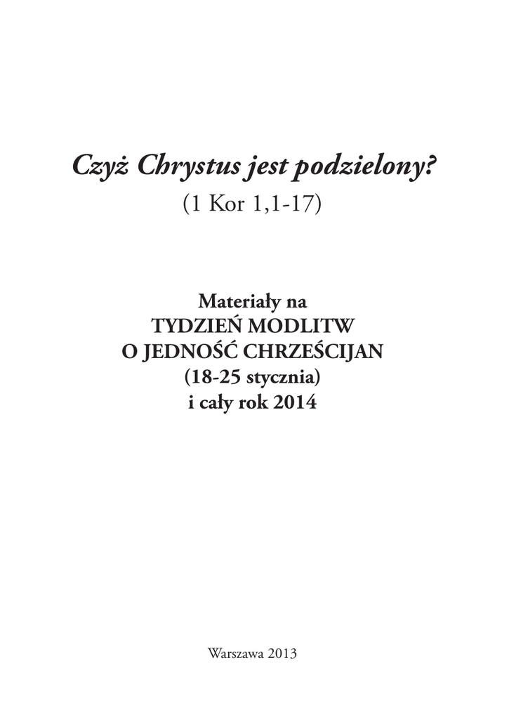 Czyż Chrystus jest podzielony? (1 Kor 1,1-17) Materiały na TYDZIEŃ MODLITW O JEDNOŚĆ CHRZEŚCIJAN (18-25 stycznia) i cały rok 2014 Warszawa 2013 © Copyright by Rada ds. Ekumenizmu Konferencji Episkopatu Polski i Polska Rada Ekumeniczna Teksty Pisma Świętego Psalmy i Nowy Testament − Przekład Ekumeniczny: Pismo Święte Nowego Testamentu. Przekład Ekumeniczny. Wydanie piąte poprawione, Warszawa 2012. © Towarzystwo Biblijne w Polsce. Pozostałe księgi biblijne – Biblia Warszawska: Biblia to jest Pismo Święte Starego i Nowego Testamentu. Nowy przekład, Warszawa 1975 © Towarzystwo Biblijne w Polsce. ISSN 0208-9424 Redakcja: Andrzej Gontarek Sławomir Pawłowski Edward Puślecki Kalina Wojciechowska Przygotowanie do druku: Sławomir Pawłowski Część I Wprowadzenie 1. Słowo polskiego Komitetu Redakcyjnego Sposób wykorzystania materiałów Tydzień i rok Tydzień Modlitw o Jedność Chrześcijan trwa w Polsce od 18 do 25 stycznia. Termin ten został zaproponowany przez pioniera ruchu ekumenicznego, Paula Wattsona z USA, w 1908 r., aby obejmował czas między dniem wspominającym św. Piotra (18 stycznia – niegdyś w rzymskim kalendarzu święto katedry Apostoła), a dniem upamiętniającym św. Pawła (25 stycznia – święto jego nawrócenia), co miało mieć symboliczne znaczenie. Na półkuli południowej, gdzie w styczniu zwykle trwają wakacje, Tydzień Modlitw o Jedność Chrześcijan jest zazwyczaj obchodzony w innym terminie, np. w okresie obejmującym święto Pięćdziesiątnicy (propozycja ruchu „Wiara i Ustrój” z 1926 r.), co również zyskuje rangę symbolu. Usilnie zachęca się Kościoły, by korzystały z tych materiałów przez cały rok, np. podczas comiesięcznych spotkań czy nabożeństw ekumenicznych, godzin biblijnych, w pracy duszpasterskiej wśród młodzieży, studentów, dorosłych. Podane w broszurze tzw. tematy do refleksji mogą posłużyć za wstęp do dyskusji, którą z kolei można zakończyć zaproponowanymi modlitwami. 4 Część I Nabożeństwa codzienne i nabożeństwo centralne W ramach Tygodnia Modlitw o Jedność Chrześcijan niektóre Kościoły, diecezje czy miasta organizują jedno nabożeństwo, inne spotykają się każdego dnia Tygodnia (właściwie oktawy). Jeszcze inne spośród tych ośmiu nabożeństw wybierają jedno, któremu nadają charakter obchodów centralnych, najczęściej w niedzielę. Należy tu podkreślić, że przypadająca w Tygodniu Modlitw niedziela ma szczególne znaczenie duszpasterskie. Niniejsza broszura uwzględnia każdą z tych możliwości, czemu służy propozycja nabożeństwa Słowa Bożego oraz bogaty zestaw modlitw na każdy dzień, łącznie z czytaniami biblijnymi i komentarzami. Międzywyznaniowo i konfesyjnie Materiały Tygodnia Modlitw o Jedność Chrześcijan można wykorzystać zarówno podczas nabożeństw międzywyznaniowych jak i w ramach nabożeństw tylko jednej konfesji, włączając proponowane modlitwy − na ile to możliwe − do własnych porządków liturgicznych. Na nabożeństwach centralnych w diecezjach Kościoła Rzymskokatolickiego, na które zapraszani są duchowni i świeccy z bratnich Kościołów chrześcijańskich, zalecane jest organizowanie nabożeństwa słowa Bożego. Jeżeli jednak racje duszpasterskie podpowiadają, że ze względu na większy udział wiernych wskazane jest umieszczenie modlitw o jedność chrześcijan w ramach Mszy św., skorzystać należy z Mszału Rzymskiego, wzbogacając celebrację o podane w broszurze teksty (czytania biblijne, modlitwy). Zwyczajem przyjętym w Polsce na nabożeństwach ekumenicznych stosowana jest gościnna wymiana kaznodziei. Jeżeli kazanie wygłasza przedstawiciel jednego nurtu chrześcijaństwa, pozdrowienie do zgromadzonych przekazać mogą przedstawiciele innych tradycji. Wspólnotowo i indywidualnie Choć wspólnotowa modlitwa o jedność chrześcijan ma charakter uprzywilejowany, to jednak chrześcijanin powinien także modlić się do Wprowadzenie 5 Ojca, „który widzi w ukryciu” (por. Mt 6,6). Materiały mogą służyć także tym, którzy chcieliby oddać się osobistej modlitwie w intencji jedności chrześcijan. Warto mieć przy tym świadomość, że wszyscy modlący się o większą widzialną jedność Kościoła tworzą wspólnotę, nawet gdy modlą się indywidualnie. Przygotowanie materiałów Zarys materiałów na tegoroczny Tydzień Modlitw został przygotowany przez chrześcijan z Kanady. Do ich powstania przyczynili się w szczególności: − Pani Bernice Baranowski (Kościół Rzymskokatolicki), Kanadyjskie Centrum Ekumeniczne, Montreal; − Wiel. Sandra Beardsall (Zjednoczony Kościół Kanady), St. Andrew`s College, Saskatoon; − Wiel. Michel Belzile (baptysta, Kościół Wspólnoty Greenborough), Toronto; − Bp Donald Bolen, (Kościół Rzymskokatolicki), diecezja Saskatoon; − Wiel. Amanda Currie (Prezbiteriański Kościół Kanady), Saskatoon; − Pan Nicholas Jesson (Kościół Rzymskokatolicki), referent ds. ekumenizmu diecezji Saskatoon; − Pan Norman Lévesque (Kościół Rzymskokatolicki), dyrektor Kanadyjskiego Centrum Ekumenicznego i dyrektor programu Green Church; − Dk. Anthony Mansour (Kościół Prawosławny w Ameryce), Kanadyjskie Centrum Ekumeniczne, Montréal; − Wiel. David MacLachlan (Zjednoczony Kościół Kanady), Atlantic School of Theology, Halifax; − Wiel. John Wilson (Zjednoczony Kościół Kanady), Summerside, Prince Edward Island; − Wiel. Karen Hamilton (Zjednoczony Kościół Kanady), sekretarz generalna Kanadyjskiej Rady Kościołów; − Wiel. Gilles Routhier (Kościół Rzymskokatolicki), Dziekan Wydziału Teologii Uniwersytetu Laval, Québec. 6 Część I Teksty przygotowane przez tę grupę zostały ostatecznie opracowane przez członków Międzynarodowego Komitetu mianowanego przez Komisję Wiara i Ustrój Światowej Rady Kościołów i Papieską Radę ds. Popierania Jedności Chrześcijan na spotkaniu, które miało miejsce we wr