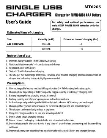 MT6205 SINGLE USB CHARGER Charger for NiMH/NiCd AAA Battery User's Guide For safety and optimal performance, use only MEDIA POWER NiMH batteries with this charger. Estimated time of charging Size AAA NiMH/NiCD Capacity (mAh) Estimated time of charging (hrs) 700 mAh ~8 800 mAh ~10 Instruction of use 1. 2. 3. 4. 5. Insert to charger’s cradle 1 NiMH/NiCd AAA battery Watch polarization marks “+/-„ on battery and charger Connect charger to USB port Status LED will inform about charging The charger has overcharge protection. However after finished charging process disconnection of charger and unloading battery is highly recommended. Prescriptions 1. New rechargeable battery reaches full capacity after 2-4 full charging/recharging cycles. 2. Charging time depending of battery capacity. Bigger capacity result longer charging time 3. Battery heating during charging process is normal 4. Battery capacity and efficiency going down in low temperatures 5. In this charger only nickel-hydride NiMH and nickel-cadmium NiCd battery can be charged 6. Charging other types of batteries could be the reason of explosion and personal injuries 7. The charger can be used only indoor, in dry room 8. Using this charger outdoor, on rain and snow is prohibited 9. Do not short-circuit charging contacts 10. Do not connect to charging contacts bulbs and other electrical devices 11. Do not disassemble. Warranty is void if any tries of unauthorized unscrewing and disassembling will occur 12. Inserting battery non-accordingly to polarity marks will cause USB port and charger damage. MT6205 SINGLE USB CHARGER Charger for NiMH/NiCd AAA Battery Instrukcja obsługi Przybliżone czasy ładowania Rozmiar AAA NiMH/NiCD Dla bezpieczeństwa i optymalnej wydajności używaj akumulatorów Ni-MH MEDIA POWER z tą ładowarką. Pojemność (mAh) Przybliżony czas ładowania (godz) 700 mAh ~8 800 mAh ~10 Instrukcja ładowania 1. 2. 3. 4. 5. Załaduj 1 akumulator NiMH/NiCd AAA Umieść go zgodnie z polaryzacją +/-, tak aby znak na akumulatorze pokrywał się ze znakiem na ładowarce Podłącz ładowarkę do portu USB Zapali się dioda LED informująca o ładowaniu. Ładowarka ma zabezpieczenie przed przeładowaniem. Zalecamy jednak po skończonym procesie ładowania wyjęcie akumulatorów i odłączenie ładowarki od źródła zasilania. Zalecenia i uwagi 1. Nowe akumulatory uzyskują pełną pojemność po 2-4 pełnych cyklach ładowania/rozładowania 2. Czas ładowania jest uzależniony od pojemności akumulatora. Im większa pojemność tym dłuższy czas ładowania 3. Nagrzewanie się akumulatorów podczas ładowania jest zjawiskiem normalnym. 4. W niskiej temperaturze spada sprawność i pojemność akumulatorów. 5. W ładowarce można ładować tylko akumulatory niklowo-wodorkowe NiMH lub niklowo-kadmowe NiCd 6. Ładowanie baterii alkalicznych i zwykłych jest zabronione i może prowadzić do eksplozji i spowodować obrażenia. 7. Ładowarka jest przeznaczona do pracy wyłącznie w suchych pomieszczeniach o standardowym poziomie wilgotności powietrza. 8. Używanie ładowarki na deszczu lub śniegu jest niedopuszczalne. 9. Nie wolno zwierać biegunów akumulatorów 10. Nie podłączać do styków ładowarki żadnych urządzeń elektrycznych i żarówek. 11. Nie rozbierać. Jakiekolwiek próby samodzielnego rozkręcania i demontażu powodują utratę gwarancji. 12. Niezgodne z polaryzacją umiejscowienie baterii w ładowarce może spowodować jej uszkodzenie jak i uszkodzenie portu USB