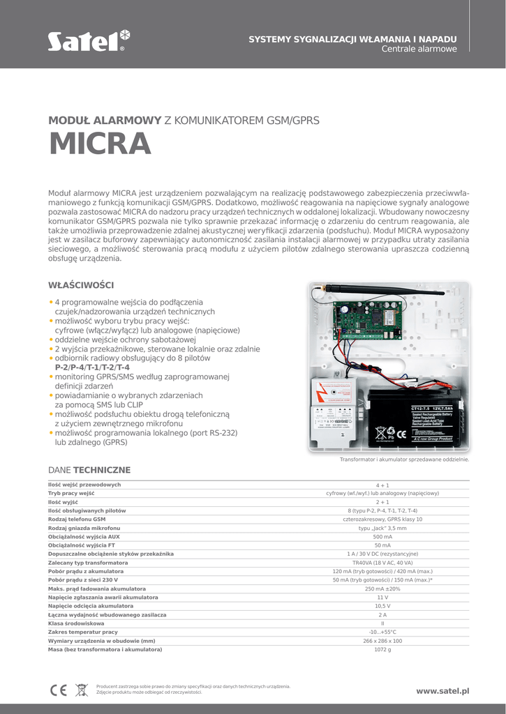 SYSTEMY SYGNALIZACJI WŁAMANIA I NAPADU Centrale alarmowe MODUŁ ALARMOWY Z KOMUNIKATOREM GSM/GPRS MICRA Moduł alarmowy MICRA jest urządzeniem pozwalającym na realizację podstawowego zabezpieczenia przeciwwłamaniowego z funkcją komunikacji GSM/GPRS. Dodatkowo, możliwość reagowania na napięciowe sygnały analogowe pozwala zastosować MICRA do nadzoru pracy urządzeń technicznych w oddalonej lokalizacji. Wbudowany nowoczesny komunikator GSM/GPRS pozwala nie tylko sprawnie przekazać informację o zdarzeniu do centrum reagowania, ale także umożliwia przeprowadzenie zdalnej akustycznej weryfikacji zdarzenia (podsłuchu). Moduł MICRA wyposażony jest w zasilacz buforowy zapewniający autonomiczność zasilania instalacji alarmowej w przypadku utraty zasilania sieciowego, a możliwość sterowania pracą modułu z użyciem pilotów zdalnego sterowania upraszcza codzienną obsługę urządzenia. WŁAŚCIWOŚCI ••4 programowalne wejścia do podłączenia czujek/nadzorowania urządzeń technicznych ••możliwość wyboru trybu pracy wejść: cyfrowe (włącz/wyłącz) lub analogowe (napięciowe) ••oddzielne wejście ochrony sabotażowej ••2 wyjścia przekaźnikowe, sterowane lokalnie oraz zdalnie ••odbiornik radiowy obsługujący do 8 pilotów P-2/P-4/T-1/T-2/T-4 ••monitoring GPRS/SMS według zaprogramowanej definicji zdarzeń ••powiadamianie o wybranych zdarzeniach za pomocą SMS lub CLIP ••możliwość podsłuchu obiektu drogą telefoniczną z użyciem zewnętrznego mikrofonu ••możliwość programowania lokalnego (port RS-232) lub zdalnego (GPRS) Transformator i akumulator sprzedawane oddzielnie. DANE TECHNICZNE Ilość wejść przewodowych Tryb pracy wejść 4+1 cyfrowy (wł./wył.) lub analogowy (napięciowy) Ilość wyjść 2+1 Ilość obsługiwanych pilotów Rodzaj telefonu GSM 8 (typu P-2, P-4, T-1, T-2, T-4) czterozakresowy, GPRS klasy 10 Rodzaj gniazda mikrofonu typu „Jack” 3,5 mm Obciążalność wyjścia AUX 500 mA Obciążalność wyjścia FT Dopuszczalne obciążenie styków przekaźnika Zalecany typ transformatora 50 mA 1 A / 30 V DC (rezystancyjne) TR40VA (18 V AC, 40 VA) Pobór prądu z akumulatora 120 mA (tryb gotowości) / 420 mA (max.) Pobór prądu z sieci 230 V 50 mA (tryb gotowości) / 150 mA (max.)* Maks. prąd ładowania akumulatora Napięcie zgłaszania awarii akumulatora Napięcie odcięcia akumulatora Łączna wydajność wbudowanego zasilacza Klasa środowiskowa Zakres temperatur pracy Wymiary urządzenia w obudowie (mm) Masa (bez transformatora i akumulatora) Producent zastrzega sobie prawo do zmiany specyfikacji oraz danych technicznych urządzenia. Zdjęcie produktu może odbiegać od rzeczywistości. 250 mA ±20% 11 V 10,5 V 2A II -10...+55°C 266 x 286 x 100 1072 g www.satel.pl