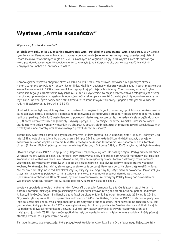 Archiwum Państwowe w Suwałkach Wystawa „Armia skazańców” Wystawa „Armia skazańców” W bieżącym roku mija 75. rocznica utworzenia Armii Polskiej w ZSRR zwanej Armią Andersa. W związku z tym Archiwum Państwowe w Suwałkach zaprasza do obejrzenia jeszcze w marcu wystawy, poświęconej historii i losom Polaków, wywiezionych w głąb b. ZSRR i skazanych na więzienia i łagry, oraz wojska z nich sformowanego, które pod dowództwem gen. Władysława Andersa walczyło jako II Korpus Polski, stanowiący część Polskich Sił Zbrojnych na Zachodzie, na froncie włoskim. Chronologiczne wystawa obejmuje okres od 1941 do 1947 roku. Przedstawia, oczywiście w ogromnym skrócie, historie setek tysięcy Polaków, jeńców, łagierników, więźniów, zesłańców, deportowanych z zagarniętych przez wojska sowieckie we wrześniu 1939 r. terenów II Rzeczypospolitej, późniejszych żołnierzy. Choć możemy zobaczyć tylko namiastkę tego, jak dramatyczne były ich losy, ile musieli wycierpieć, to część prezentowanych fotografii jest w swej treści wręcz przejmująca i sugestywnie obrazuje choćby takie opisy z kroniki 6 dywizji piechoty nowo tworzonej armii (cyt. za: Z. Wawer, Życie codzienne armii Andersa, w: Historia II wojny światowej. Epopeja armii generała Andersa, red. M. Niewierowicz, B. Borucki, s, 36-37): „Ludności polska była zupełnie wyniszczona: dostawała obrzęków i biegunki, co według opinii lekarzy należało uważać za następstwa okresu głodowego i jednostajnego odżywiania się kukurydzą i prosem. W poszukiwaniu pokarmu ludzie jedli psy i padlinę. Duża ilość wysiedleńców, z powodu śmiertelnego wyczerpania, nie nadawała się w ogóle do pracy. […] Nieoczekiwanie zastały one [oddziały 6 dywizji – przyp. T.R.] na miejscu znaczne skupiska ludności polskiej w stanie godnym pożałowania: wynędzniałych, obdartych, bosych, głodnych, żartych przez robactwo i dziesiątkowanych przez tyfus i inne choroby oraz szykanowanych przez ludność miejscową”. Trzeba przy tym trzeba pamiętać o tysiącach zmarłych, którzy pozostali na „nieludzkiej ziemi”. W tych, którzy żyli, od lata 1941 r. wstąpiła nadzieja, bo po podpisaniu 30 lipca 1941 r. tzw. układu Sikorski-Majski zapadły decyzje o tworzeniu polskiego wojska na terenie b. ZSRR i przystąpiono do jego formowania. We wspomnieniach z tamtego okresu (E. Panel, Otchłań północy, w: Wschodnie losy Polaków, t. 3, Łomża 1991, s. 75-76) czytamy, jak było to ważne: „Dwudziestego maja 1942 r. śniegi puściły. Raptownie rozpoczęło się lato. Do naszego rejonu Parbig przyjechał oficer w randze majora wojsk polskich, ob. Konecki Jerzy. Rogatywka, szlify oficerskie, sam wystrój munduru wojsk polskich zrobił na mnie wielkie wrażenie i nie tylko na mnie, ale i na miejscowej Polonii. Lotem błyskawicy powiadomiłem wszystkich, których znałem Polaków w Parbigu, że będzie zebranie Polaków. Na którym będzie przemawiał nasz kochany Polak-major. Zebraliśmy się wszyscy w stołówce fabrycznej. Było nas sporo. Najpierw zaśpiewaliśmy Rotę: Nie rzucim ziemi skąd nasz ród. Rozpłakaliśmy się wszyscy, nie mogliśmy tej Roty śpiewem dokończyć. Major stał, jak przystało na żołnierza polskiego. Z miną stalową i stanowczą. Przemówił, przyjechałem do was, rodacy, z upoważnienia ambasadora RP w Moskwie, by wam zakomunikować, że tworzymy Polską Armię pod dowództwem Władysława Andersa. Rodacy-Polacy, zaciągajcie się w szeregi wojska polskiego”. Wystawa opowiada w kopiach dokumentów i fotografii o genezie, formowaniu, a także dalszych losach tej armii, potem II Korpusu Polskiego, którego szlak bojowy wiódł przez krwawą bitwę pod Monte Cassino, potem Piedimonte, Ankonę, linię Gotów, Apenin Emiliański, a zakończył się bitwą o Bolonię i zajęciem tego miasta 21 kwietnia 1945 r. Gdy skończyła się wojna II korpus przetransportowany w 1945 r. do Wielkiej Brytanii w 1947 r. został rozwiązany, ale jego żołnierze pisali nadal swoją niejednokrotnie dramatyczną i trudną historię. Jedni pozostali na obczyźnie, tak jak gen. Anders, który po śmierci w 1970 r. spoczął obok swych żołnierzy pod Monte Cassino, drudzy wrócili do innej, bo już podporządkowanej komunistom Ojczyzny. Byli też tacy, którzy powrócili do swych rodzinnych stron, ale należących już do b. ZSRR. I tych znów spotkał dramat, bo wywieziono ich na Syberię wraz z rodzinami. Gdy później stamtąd wracali, to już przeważnie do kraju. Ta nader interesująca ekspozycja, którą przygotował Wydział Wydawniczy Biura Organizacyjnego Najwyższej Izby 1 Archiwum Państwowe w Suwałkach Kontroli, a Archiwum otrzymało dzięki uprzejmości Komendy Głównej Straży Granicznej, prezentuje kopie fotografii i dokumentów z lat 1941–1947, wykonane ze zbiorów Narodowego Archiwum Cyfrowego, Muzeum Niepodległości, a także Muzeum Wojska Polskiego, Muzeum Wojska w Białymstoku, Instytutu Polskiego i Muzeum im. Generała Sikorskiego w Londynie oraz p. Jerzego Grzybowskiego. Opr. Tadeusz Radziwonowicz Wystawę można oglądać: od poniedziałku do piątku w godzinach 8.00 - 15.00. 2