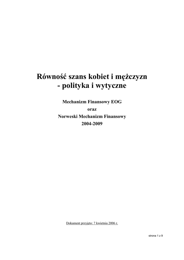 Równość szans kobiet i męŜczyzn - polityka i wytyczne Mechanizm Finansowy EOG oraz Norweski Mechanizm Finansowy 2004-2009 Dokument przyjęto: 7 kwietnia 2006 r. strona 1 z 9 1. Wstęp 1.1. Określenie załoŜeń polityki Równość szans kobiet i męŜczyzn jest kwestią pierwszorzędnej wagi dla państw-darczyńców w ramach Mechanizmu Finansowego Europejskiego Obszaru Gospodarczego i Norweskiego Mechanizmu Finansowego. Państwa-darczyńcy – Islandia, Liechtenstein i Norwegia – są przekonane, Ŝe równość szans kobiet i męŜczyzn wiąŜe się w sposób nierozerwalny z nadrzędnym celem mechanizmów finansowych, czyli zmniejszaniem róŜnic ekonomicznych i społecznych w obrębie noworozszerzonego Europejskiego Obszaru Gospodarczego. Aby moŜliwe było osiągnięcie faktycznego zrównowaŜonego rozwoju gospodarczego i społecznego, kobiety i męŜczyźni muszą mieć równe prawa i szanse we wszystkich obszarach gospodarki i Ŝycia społecznego. Co więcej, dyskryminacja ze względu na płeć stanowi naruszenie podstawowych praw człowieka. Państwa-darczyńcy są świadome faktu, Ŝe nie wszystkie projekty będą miały maksymalny wpływ na wyrównywanie szans kobiet i męŜczyzn. Niemniej jednak włączenie kwestii równości szans kobiet i męŜczyzn jako zagadnienia horyzontalnego w ramach mechanizmów finansowych świadczy o tym, Ŝe efektywność środków pomocowych dostępnych w ramach mechanizmów finansowych zaleŜy od tego, czy finansowane projekty uwzględniają kwestie równości szans kobiet i męŜczyzn. 1.2. Zakres Celem niniejszego dokumentu jest przedstawienie wytycznych dotyczących sposobu, w jaki działania prowadzone w ramach mechanizmów mogą przyczynić się do wyrównywania szans kobiet i męŜczyzn. Ponadto niniejszy dokument – podobnie jak inne dokumenty i listy kontrolne dotyczące polityk horyzontalnych – ma na celu przybliŜenie wnioskodawcom zagadnień horyzontalnych. Wszystkie tego rodzaju dokumenty określają sposób, w jaki zagadnienia równości szans kobiet i męŜczyzn, a takŜe kluczowe aspekty pozostałych zagadnień horyzontalnych, będą poddawane ocenie przez Biuro Mechanizmów Finansowych oraz przez Komitet Mechanizmu Finansowego i/lub norweskie Ministerstwo Spraw Zagranicznych w toku oceny wniosków projektowych pod względem zarówno ich kwalifikowalności, jak i przydatności. Ze wszystkimi politykami horyzontalnymi, jak równieŜ pozostałymi wytycznymi dotyczącymi projektów będzie moŜna zapoznać się na stronie internetowej dotyczącej Grantów EOG: www.eeagrants.org. Polityka równości szans kobiet i męŜczyzn ma stanowić uzupełnienie strategii pozostałych podmiotów realizujących podobne cele, w szczególności Unii Europejskiej, innych organizacji międzynarodowych, państw-darczyńców, państw-beneficjentów oraz organizacji pozarządowych. Bazę dla opracowania polityki w tym zakresie stanowiły ramy prawne Grantów EOG, a takŜe informacje płynące od szeregu powyŜszych organizacji. strona 2 z 9 2. Równość szans kobiet i męŜczyzn - definicja W odniesieniu do mechanizmów finansowych darczyńcy przyjmują, Ŝe termin „równość szans kobiet i męŜczyzn” oznacza1: „Ŝe wszyscy ludzie mają prawo do swobodnego rozwoju ich osobistych umiejętności i dokonywania wyborów bez ograniczeń, jakie narzuca ścisłe pojęcie roli kobiet i męŜczyzn; Ŝe odmienne zachowania, aspiracje i potrzeby kobiet i męŜczyzn są w równy sposób uznawane, doceniane i popierane”. Pełna realizacja zasady równości szans kobiet i męŜczyzn wymaga równej reprezentacji oraz udziału zarówno męŜczyzn, jak i kobiet w Ŝyciu gospodarczym, w procesie decyzyjnym, jak równieŜ w Ŝyciu społecznym, kulturalnym i obywatelskim. Jedynie w ten sposób kobiety i męŜczyźni osiągną pełnię swoich moŜliwości w Ŝyciu społecznym. PowyŜsze zakłada sprawiedliwy podział zasobów pomiędzy męŜczyzn i kobiety, redystrybucję obowiązków w zakresie władzy i opieki oraz wolność od przemocy na tle płci. Z koncepcją równości szans kobiet i męŜczyzn ściśle wiąŜe się zagadnienie włączania problematyki równości płci do głównego nurtu polityki. NiemoŜliwe jest osiągnięcie równości szans kobiet i męŜczyzn poprzez traktowanie spraw dotyczących jednej płci w oderwaniu od spraw drugiej płci czy teŜ spraw dotyczących społeczeństwa jako całości. Dlatego teŜ problematyka równości płci włączana jest do głównego nurtu polityki, co pozwala zajmować się kwestiami dotyczącymi kobiet i męŜczyzn na wszystkich poziomach i etapach. Zjawisko to obejmuje wszystkie ogólne polityki i działania, dzięki czemu mogą one przyczynić się do wyrównywania szans poprzez uwzględnianie, w sposób aktywny i otwarty, juŜ na etapie planowania, ich wpływu na sytuację kobiet i męŜczyzn w dalszym procesie ich wdraŜania, monitorowania i ewaluacji. 3. Kluczowe aspekty równości szans kobiet i męŜczyzn W państwach-beneficjentach mechanizmów finansowych dokonał się znaczny postęp w zakresie wyrównywania szans kobiet i męŜczyzn, jednak formalne prawa niekoniecznie są odzwierciedleniem praw faktycznych/praw realizowanych w praktyce. Fakt ten – wraz z nadal utrzymującą się niedostateczną reprezentacją kobiet wśród przywódców politycznych i ekonomicznych, jak równieŜ przemocą wobec kobiet i procederem handlu kobietami – wskazuje, Ŝe pomimo istnienia odpowiednich ram prawnych nadal utrzymują się nierówności strukturalne. Mimo, iŜ poszczególne aspekty równości szans kobiet i męŜczyzn często zawierają elementy, które częściowo się wzajemnie pokrywają i mogą być kategoryzowane na róŜne sposoby, na potrzeby mechanizmów finansowych zostały one przyporządkowane do następujących kategorii ogólnych2: 1 2 - prawa ekonomiczne i społeczne, - prawa człowieka, - zapobieganie przemocy, Komisja Europejska, DG Zatrudnienie, „Sto słów określających równ