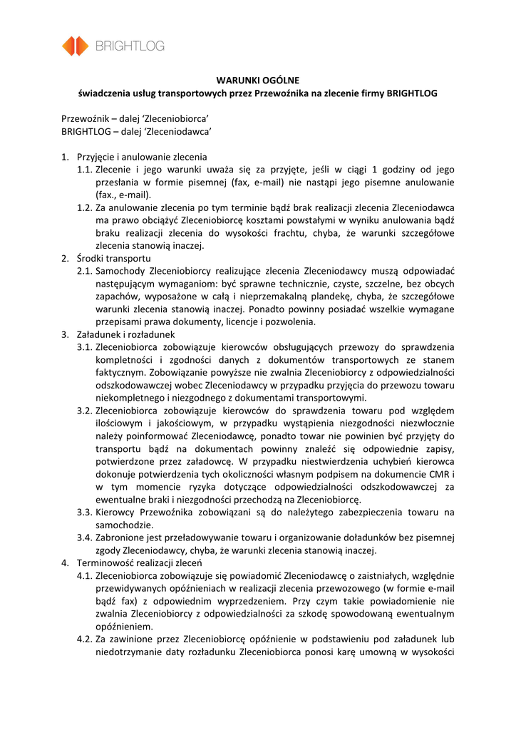 WARUNKI OGÓLNE świadczenia usług transportowych przez Przewoźnika na zlecenie firmy BRIGHTLOG Przewoźnik – dalej ‘Zleceniobiorca’ BRIGHTLOG – dalej ‘Zleceniodawca’ 1. Przyjęcie i anulowanie zlecenia 1.1. Zlecenie i jego warunki uważa się za przyjęte, jeśli w ciągi 1 godziny od jego przesłania w formie pisemnej (fax, e-mail) nie nastąpi jego pisemne anulowanie (fax., e-mail). 1.2. Za anulowanie zlecenia po tym terminie bądź brak realizacji zlecenia Zleceniodawca ma prawo obciążyć Zleceniobiorcę kosztami powstałymi w wyniku anulowania bądź braku realizacji zlecenia do wysokości frachtu, chyba, że warunki szczegółowe zlecenia stanowią inaczej. 2. Środki transportu 2.1. Samochody Zleceniobiorcy realizujące zlecenia Zleceniodawcy muszą odpowiadać następującym wymaganiom: być sprawne technicznie, czyste, szczelne, bez obcych zapachów, wyposażone w całą i nieprzemakalną plandekę, chyba, że szczegółowe warunki zlecenia stanowią inaczej. Ponadto powinny posiadać wszelkie wymagane przepisami prawa dokumenty, licencje i pozwolenia. 3. Załadunek i rozładunek 3.1. Zleceniobiorca zobowiązuje kierowców obsługujących przewozy do sprawdzenia kompletności i zgodności danych z dokumentów transportowych ze stanem faktycznym. Zobowiązanie powyższe nie zwalnia Zleceniobiorcy z odpowiedzialności odszkodowawczej wobec Zleceniodawcy w przypadku przyjęcia do przewozu towaru niekompletnego i niezgodnego z dokumentami transportowymi. 3.2. Zleceniobiorca zobowiązuje kierowców do sprawdzenia towaru pod względem ilościowym i jakościowym, w przypadku wystąpienia niezgodności niezwłocznie należy poinformować Zleceniodawcę, ponadto towar nie powinien być przyjęty do transportu bądź na dokumentach powinny znaleźć się odpowiednie zapisy, potwierdzone przez załadowcę. W przypadku niestwierdzenia uchybień kierowca dokonuje potwierdzenia tych okoliczności własnym podpisem na dokumencie CMR i w tym momencie ryzyka dotyczące odpowiedzialności odszkodowawczej za ewentualne braki i niezgodności przechodzą na Zleceniobiorcę. 3.3. Kierowcy Przewoźnika zobowiązani są do należytego zabezpieczenia towaru na samochodzie. 3.4. Zabronione jest przeładowywanie towaru i organizowanie doładunków bez pisemnej zgody Zleceniodawcy, chyba, że warunki zlecenia stanowią inaczej. 4. Terminowość realizacji zleceń 4.1. Zleceniobiorca zobowiązuje się powiadomić Zleceniodawcę o zaistniałych, względnie przewidywanych opóźnieniach w realizacji zlecenia przewozowego (w formie e-mail bądź fax) z odpowiednim wyprzedzeniem. Przy czym takie powiadomienie nie zwalnia Zleceniobiorcy z odpowiedzialności za szkodę spowodowaną ewentualnym opóźnieniem. 4.2. Za zawinione przez Zleceniobiorcę opóźnienie w podstawieniu pod załadunek lub niedotrzymanie daty rozładunku Zleceniobiorca ponosi karę umowną w wysokości 200 EUR za każdy rozpoczęty dzień opóźnienia, chyba, że warunki szczegółowe zlecenia stanowią inaczej. 4.3. Czas wolny od opłat za postojowe na załadunku lub rozładunku wynosi 24 godziny od daty / godziny wskazanej na zleceniu transportowym. Dla krajów spoza Unii Europejskiej - 48 godzin. 5. Fakturowanie 5.1. Zlecenie musi zostać zafakturowane w miesiącu wykonania usługi. Faktura transportowa wraz z oryginalnymi dokumentami potwierdzającymi realizację transportów (CMR, PACKING LIST) muszą być dostarczone do siedziby Zleceniodawcy nie później niż do 5-tego dnia kolejnego miesiąca. W przypadku niemożności dostarczenia oryginałów dokumentów w tym terminie prosimy o przesłanie kopii na adres e-mail: [email protected]. W przypadku niespełnienia powyższych wymogów faktury transportowe zostaną odesłane a termin płatności za dany transport wydłużony do 90 dni. 5.2. Na fakturze należy obowiązkowo wpisać numer zlecenia, którego dotyczy faktura. W przeciwnym razie zostanie ona odesłana. 5.3. Faktury transportowe dla BRIGHTLOG Sp. z o.o. powinny być wystawione w PLN według kursu z tabeli z dnia załadunku. 6. Tajemnica handlowa 6.1. Warunki umowy są objęte tajemnicą handlową. W szczególności obowiązuje zakaz ich ujawniania osobom trzecim jak i zakaz stosowania praktyk o znamionach nieuczciwej konkurencji. 6.2. W trakcie i po wykonaniu zlecenia obowiązuje ochrona klienta Zleceniodawcy. Podejmowanie bezpośredniej współpracy z klientem z pominięciem Zleceniodawcy skutkuje karą 10 000 EUR. 7. Inne 7.1. Zleceniodawca przejmuje na siebie prawa, obowiązki i odpowiedzialność przewoźnika zawierającego umowę zgodnie z przepisami zawartymi w Konwencji o Umowie Międzynarodowego Przewozu Drogowego Towarów (CMR) z dnia 19 maja 1956 r. 7.2. W sprawach nie uregulowanych zleceniem stosuje się przepisy Konwencji o Umowie Międzynarodowego Przewozu Drogowego Towarów (CMR) z dnia 19 maja 1956 r., co do których Zleceniodawca oświadcza, że zobowiązuje się je stosować.