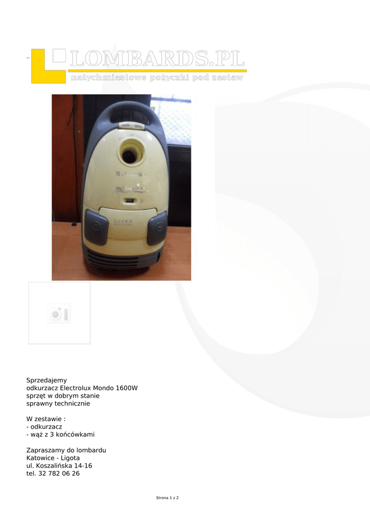 Sprzedajemy odkurzacz Electrolux Mondo 1600W sprzęt w dobrym stanie sprawny technicznie W zestawie : - odkurzacz - wąż z 3 końcówkami Zapraszamy do lombardu Katowice - Ligota ul. Koszalińska 14-16 tel. 32 782 06 26 Strona 1 z 2 Czynne : PON - SOB od 8 do 20 www.lombards.pl Na oferowany towar udzielamy gwarancji rozruchowej Strona 2 z 2