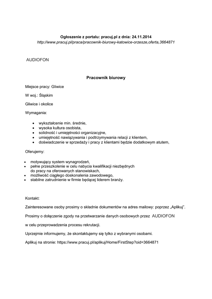 Ogłoszenie z portalu: pracuj.pl z dnia: 24.11.2014 http://www.pracuj.pl/praca/pracownik-biurowy-katowice-orzesze,oferta,3664871 AUDIOFON Pracownik biurowy Miejsce pracy: Gliwice W woj.: Śląskim Gliwice i okolice Wymagania: wykształcenie min. średnie, wysoka kultura osobista, solidność i umiejętności organizacyjne, umiejętność nawiązywania i podtrzymywania relacji z klientem, doświadczenie w sprzedaży i pracy z klientami będzie dodatkowym atutem, Oferujemy: motywujący system wynagrodzeń, pełne przeszkolenie w celu nabycia kwalifikacji niezbędnych do pracy na oferowanych stanowiskach, możliwość ciągłego doskonalenia zawodowego, stabilne zatrudnienie w firmie będącej liderem branży. Kontakt: Zainteresowane osoby prosimy o składnie dokumentów na adres mailowy: poprzez „Aplikuj”. Prosimy o dołączenie zgody na przetwarzanie danych osobowych przez AUDIOFON w celu przeprowadzenia procesu rekrutacji. Uprzejmie informujemy, że skontaktujemy się tylko z wybranymi osobami. Aplikuj na stronie: https://www.pracuj.pl/aplikuj/Home/FirstStep?oid=3664871