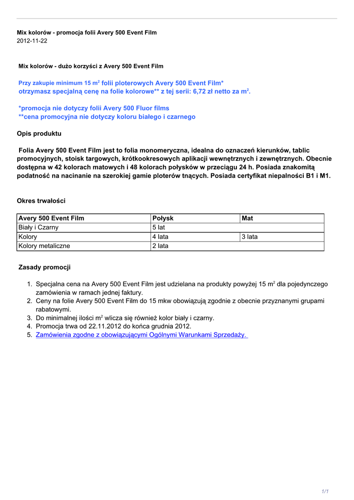 Mix kolorów - promocja folii Avery 500 Event Film 2012-11-22 Mix kolorów - dużo korzyści z Avery 500 Event Film Przy zakupie minimum 15 m2 folii ploterowych Avery 500 Event Film* otrzymasz specjalną cenę na folie kolorowe** z tej serii: 6,72 zł netto za m2. *promocja nie dotyczy folii Avery 500 Fluor films **cena promocyjna nie dotyczy koloru białego i czarnego Opis produktu Folia Avery 500 Event Film jest to folia monomeryczna, idealna do oznaczeń kierunków, tablic promocyjnych, stoisk targowych, krótkookresowych aplikacji wewnętrznych i zewnętrznych. Obecnie dostępna w 42 kolorach matowych i 48 kolorach połysków w przeciągu 24 h. Posiada znakomitą podatność na nacinanie na szerokiej gamie ploterów tnących. Posiada certyfikat niepalności B1 i M1. Okres trwałości Avery 500 Event Film Biały i Czarny Kolory Kolory metaliczne Połysk 5 lat 4 lata 2 lata Mat 3 lata Zasady promocji 1. Specjalna cena na Avery 500 Event Film jest udzielana na produkty powyżej 15 m2 dla pojedynczego zamówienia w ramach jednej faktury. 2. Ceny na folie Avery 500 Event Film do 15 mkw obowiązują zgodnie z obecnie przyznanymi grupami rabatowymi. 3. Do minimalnej ilości m2 wlicza się również kolor biały i czarny. 4. Promocja trwa od 22.11.2012 do końca grudnia 2012. 5. Zamówienia zgodne z obowiązującymi Ogólnymi Warunkami Sprzedaży. 1/1