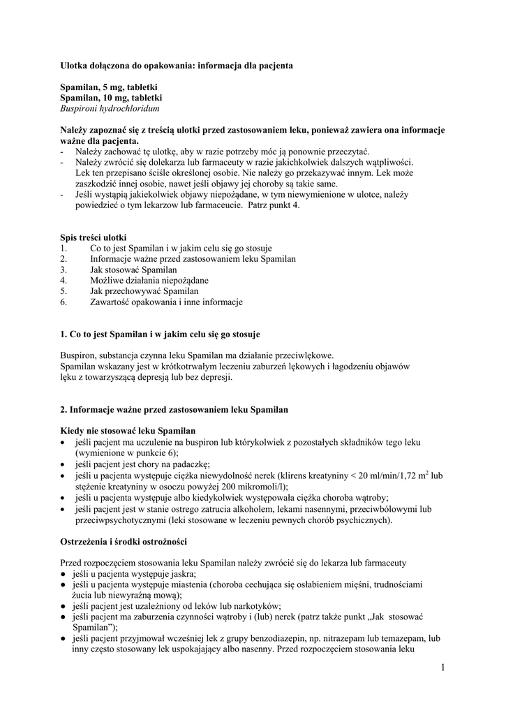 Ulotka dołączona do opakowania: informacja dla pacjenta Spamilan, 5 mg, tabletki Spamilan, 10 mg, tabletki Buspironi hydrochloridum Należy zapoznać się z treścią ulotki przed zastosowaniem leku, ponieważ zawiera ona informacje ważne dla pacjenta. - Należy zachować tę ulotkę, aby w razie potrzeby móc ją ponownie przeczytać. - Należy zwrócić się dolekarza lub farmaceuty w razie jakichkolwiek dalszych wątpliwości. Lek ten przepisano ściśle określonej osobie. Nie należy go przekazywać innym. Lek może zaszkodzić innej osobie, nawet jeśli objawy jej choroby są takie same. - Jeśli wystąpią jakiekolwiek objawy niepożądane, w tym niewymienione w ulotce, należy powiedzieć o tym lekarzow lub farmaceucie. Patrz punkt 4. Spis treści ulotki 1. Co to jest Spamilan i w jakim celu się go stosuje 2. Informacje ważne przed zastosowaniem leku Spamilan 3. Jak stosować Spamilan 4. Możliwe działania niepożądane 5. Jak przechowywać Spamilan 6. Zawartość opakowania i inne informacje 1. Co to jest Spamilan i w jakim celu się go stosuje Buspiron, substancja czynna leku Spamilan ma działanie przeciwlękowe. Spamilan wskazany jest w krótkotrwałym leczeniu zaburzeń lękowych i łagodzeniu objawów lęku z towarzyszącą depresją lub bez depresji. 2. Informacje ważne przed zastosowaniem leku Spamilan Kiedy nie stosować leku Spamilan jeśli pacjent ma uczulenie na buspiron lub którykolwiek z pozostałych składników tego leku (wymienione w punkcie 6); jeśli pacjent jest chory na padaczkę; jeśli u pacjenta występuje ciężka niewydolność nerek (klirens kreatyniny < 20 ml/min/1,72 m2 lub stężenie kreatyniny w osoczu powyżej 200 mikromoli/l); jeśli u pacjenta występuje albo kiedykolwiek występowała ciężka choroba wątroby; jeśli pacjent jest w stanie ostrego zatrucia alkoholem, lekami nasennymi, przeciwbólowymi lub przeciwpsychotycznymi (leki stosowane w leczeniu pewnych chorób psychicznych). Ostrzeżenia i środki ostrożności Przed rozpoczęciem stosowania leku Spamilan należy zwrócić się do lekarza lub farmaceuty ● jeśli u pacjenta występuje jaskra; ● jeśli u pacjenta występuje miastenia (choroba cechująca się osłabieniem mięśni, trudnościami żucia lub niewyraźną mową); ● jeśli pacjent jest uzależniony od leków lub narkotyków; ● jeśli pacjent ma zaburzenia czynności wątroby i (lub) nerek (patrz także punkt „Jak stosować Spamilan”); ● jeśli pacjent przyjmował wcześniej lek z grupy benzodiazepin, np. nitrazepam lub temazepam, lub inny często stosowany lek uspokajający albo nasenny. Przed rozpoczęciem stosowania leku 1 Spamilan należy stopniowo odstawić wymienione leki. Lekarz prowadzący może zalecić przeprowadzenie badań laboratoryjnych przed rozpoczęciem podawania leku Spamilan. Należy poinformować lekarza prowadzącego o wszelkich współistniejących chorobach, które występują u pacjenta a o których lekarz mógłby nie wiedzieć. Dzieci i młodzież Nie zaleca się stosowania leku Spamilan u dzieci i młodzieży. Inne leki i Spamilan Należy powiedzieć lekarzowi o wszystkich lekach przyjmowanych obecnie lub ostatnio a także o lekach, które pacjent planuje stosować. W szczególności należy powiedzieć lekarzowi o przyjmowaniu następujących leków: - inhibitory monoaminooksydazy, takie jak moklobemid i selegilina (stosowane w depresji); leku Spamilan nie należy stosować równocześnie z inhibitorami monoaminooksydazy ze względu na ryzyko wzrostu ciśnienia tętniczego krwi; - erytromycyna, itrakonazol, linezolid i ryfampicyna (stosowane w leczeniu infekcji); - antagoniści wapnia, jak diltiazem i werapamil (stosowane w leczeniu wysokiego ciśnienia tętniczego); - selektywne inhibitory wychwytu zwrotnego serotoniny, jak cytalopram, escytalopram, fluoksetyna, fluwoksamina, paroksetyna i sertralina (stosowane w depresji i zaburzeniach lękowych); - nefazodon, trazodon, preparaty dziurawca, L-tryptofan (stosowane w depresji); - haloperydol i lit (stosowane w chorobach psychicznych); - digoksyna (stosowana w leczeniu niewydolności serca); - leki zmniejszające wydzielanie soku żołądkowego zawierające cymetydynę (stosowane w leczeniu wrzodów żołądka i zgagi); - tramadol (lek przeciwbólowy); - tryptany, np. sumatryptan (stosowane w leczeniu migreny); - baklofen (stosowany w zwiększonym napięciu mięśni); - lofeksydyna (stosowana w leczeniu zespołu odstawiennego); - nabilon (stosowany w leczeniu nudności i wymiotów); - leki przeciwhistaminowe (stosowane w leczeniu reakcji alergicznych); - diazepam (stosowany w leczeniu lęku); - warfaryna (lek rozrzedzający krew); - fenobarbital, fenytoina, karbamazepina (leki na padaczkę). Stosowanie leku Spamilan z jedzeniem, piciem i alkoholem W trakcie przyjmowania leku Spamilan nie należy pić alkoholu. W trakcie przyjmowania leku Spamilan nie należy pić soku grejpfrutowego. Ciąża, karmienie piersią i wpływ na płodność W ciąży i w okresie karmienia piersią lub gdy istnieje podejrzenie, że kobieta jest w ciąży, lub gdy planuje ciążę, przed zastosowaniem tego leku należy poradzić się lekarza lub farmaceuty. Nie należy przyjmować leku Spamilan w czasie ciąży i w okresie karmienia piersią. Prowadzenie pojazdów i obsługiwanie maszyn Spamilan ma umiarkowany wpływ na zdolność prowadzenia pojazdów i obsługiwania maszyn. Może spowodować senność lub zawroty głowy. Zanim pacjent zacznie prowadzić pojazd lub obsługiwać maszyny powinien się upewnić, że takie objawy nie występują. 2 Ze względu na możliwość wystąpienia na początku leczenia przemijających działań niepożądanych, nie należy prowadzić pojazdów ani obsługiwać maszyn do czasu upewnienia się, że lek nie ma niepożądanego wpływu na zdolność prowadzenia pojazdów i obsługiwania maszyn. Tabletka leku Spamilan, 5 mg zawiera 55,7 mg laktozy, a tabletka leku Spamilan, 10 mg zawiera 111,4 mg laktozy. Jeżeli stwierdz