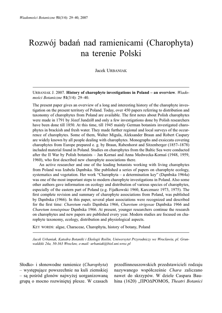 Wiadomości Botaniczne 51(3/4): 29–40, 2007 Rozwój badań nad ramienicami (Charophyta) na terenie Polski Jacek URBANIAK URBANIAK J. 2007. History of charophyte investigations in Poland – an overview. Wiadomości Botaniczne 51(3/4): 29–40. The present paper gives an overview of a long and interesting history of the charophyte investigation on the present territory of Poland. Today, over 450 papers referring to distribution and taxonomy of charophytes from Poland are available. The first notes about Polish charophytes were made in 1791 by Józef Jundziłł and only a few investigations done by Polish researchers have been done till 1850. At this time, till 1945 mainly German botanists investigated charophytes in brackish and fresh water. They made further regional and local surveys of the occurrence of charophytes. Some of them, Walter Migula, Aleksander Braun and Robert Caspary are widely known by all people dealing with charophytes. Monographs and exsiccata covering charophytes from Europe prepared e. g. by Braun, Rabenhorst and Sitzenberger (1857–1878) included material found in Poland. Studies on charophytes from the Baltic Sea were conducted after the II War by Polish botanists – Jan Kornaś and Anna Medwecka-Kornaś (1948, 1959, 1960), who first described new charophyte associations there. An active researcher and one of the leading botanists working with living charophytes from Poland was Izabela Dąmbska. She published a series of papers on charophyte ecology, systematics and vegetation. Her work “Charophyta – a determination key” (Dąmbska 1964a) was one of the most important steps to modern charophyte investigations in Poland. Also some other authors gave information on ecology and distribution of various species of charophytes, especially of the eastern part of Poland (e.g. Fijałkowski 1960, Karczmarz 1973, 1975). The first complete revision and summary of charophyte associations from Poland, was published by Dąmbska (1966). In this paper, several plant associations were recognized and described for the first time: Charetum rudis Dąmbska 1966, Charetum strigosae Dąmbska 1966 and Charetum tenuispinae Dąmbska 1966. At present, younger researchers continue the research on charophytes and new papers are published every year. Modern studies are focused on charophyte taxonomy, ecology, distribution and physiological aspects. KEY WORDS: algae, Characeae, Charophyta, history of botany, Poland Jacek Urbaniak, Katedra Botaniki i Ekologii Roślin, Uniwersytet Przyrodniczy we Wrocławiu, pl. Grunwaldzki 24a, 50-363 Wrocław, e-mail: [email protected] Słodko- i słonowodne ramienice (Charophyta) – występujące powszechnie na kuli ziemskiej – są pośród glonów najwyżej uorganizowaną grupą o mocno rozwiniętej plesze. W czasach przedlinneuszowskich przedstawicieli rodzaju nazywanego współcześnie Chara zaliczano nawet do skrzypów. W dziele Caspara Bauhina (1620) „ΠΡΟΔΡΟΜΟS, Theatri Botanici 30 Ryc. 1. Pierwsze graficzne przedstawienie ramienicy – Equisetum foetidum sub aqua repens, zamieszczona w pracy Bauhina „ΠΡΟΔΡΟΜΟS, Theatri Botanici Caspari Bauhini Basilens”. Francofourti ad Moenum 1620. Rycina ze zbiorów Biblioteki Uniwersyteckiej we Wrocławiu, syg. 393421. Fig. 1. The first drawing of stonewort – Equisetum foetidum sub aqua repens, published by Bauhin in “ΠΡΟΔΡΟΜΟS, Theatri Botanici Caspari Bauhini Basilens”. Francofourti ad Moenum 1620. Drawing from the collection of Wrocław University Library, syg. no. 393421. Caspari Bauhini Basilens” na stronie 25 przedstawiona została rycina oraz pierwszy historycznie opis rośliny nazwanej przez autora Equisetum foetidum sub aqua repens. Z opisu i wyglądu jasno wynika, iż jest to pierwsze przedstawienie ramienicy z rodzaju Chara (Ryc. 1). Oprócz rodzaju Chara – najliczniejszego – do Charophyta należą także rodzaje: Nitella, Tolypella, Nitellopsis, Lychnothamnus i Lamprotamnium. Wszystkie one, z wyjątkiem ostatniego, występują w Polsce i od kilkuset lat budzą zainteresowanie badaczy. Dlatego też, w niniejszym artykule chciałbym przedstawić, jak rozwijały się i czego dotyczyły prowadzone w Polsce badania J. Urbaniak nad ramienicami, akcentując tym samym wkład polskich badaczy w międzynarodowy dorobek nad tą ciekawą grupą systematyczną. Pierwsze publikowane informacje o występowaniu ramienic na terenach Polski są dziełem Bonifacego Stanisława Jundziłła, profesora historii naturalnej w szkole Pijarów w Wilnie. Ten zasłużony dla botaniki badacz, w niespełna 40 lat po wydaniu przez Karola Linneusza w 1753 roku „Species Plantarum”, podał w dziele pt. „Opisanie roślin w prowincyi W. X. Litewskiego, naturalnie rosnących według Linneusza” występowanie kilku gatunków rodzaju Chara na terenie ówczesnej prowincji Wielkiego Księstwa Litewskiego: Ch. tomentosa, Ch. vulgaris i Ch. hispida (Jundziłł 1791). Kontynuatorami tradycji badawczej flory litewskich krańców Polski, w tym ramienic, byli także Józef Jundziłł (1822, 1830) i Jan Fryderyk Wolfgang (1822, 1824), którzy publikowali liczne informacje o nowych znaleziskach ramienic. Badaniami ramienic na Wileńszczyźnie aktywnie zajmował się również Franciszek Błoński (1890), a także Stanisław Batys Gorski (1849), który opracował „Icones Potamogetonum, Characeoarum, Cyperacearum et Graminearum novas vel minus cognitas species Lithuaniae ilustrantes”. Niestety, dwa tomy zawierające opisy gatunków i ryciny roślin wkrótce po wydaniu prawie doszczętnie spłonęły (Hryniewiecki 1952). Jedyny zachowany po wojnie egzemplarz z ilustracjami, w ciągu ostatnich 40 lat zaginął. Nie dały rezultatu intensywne próby ich odnalezienia (J. Urbaniak, J. Zalewska-Gałosz, dane niepublikowane). Dostępne są jedynie zdjęcia fotograficzne tablic, stanowiące dużą rzadkość. Wykaz gatunków ramienic flory wileńskiej wraz z wkładem poszczególnych badaczy w rozwój b