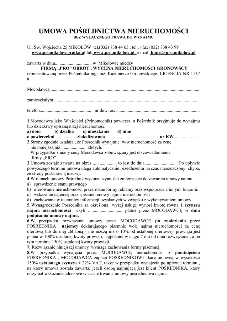 UMOWA POŚREDNICTWA NIERUCHOMOŚCI BEZ WYŁĄCZNEGO PRAWA DO WYNAJMU Ul. Św. Wojciecha 25 MIKOŁÓW tel.(032) 738 44 63 , tel . / fax (032) 738 43 99 www.promikolow.gratka.pl lub www.pro.mikolow.pl, e-mail: [email protected] zawarta w dniu................................ w Mikołowie między FIRMĄ „PRO” OBRÓT , WYCENA NIERUCHOMOŚCI GRONOWSCY reprezentowaną przez Pośrednika mgr inż. Kazimierza Gronowskiego, LICENCJA NR 1137 a Mocodawcą................................................................................................................................... zamieszkałym................................................................................................................................ telefon............................................. nr dow. os. ......................................................................... 1.Mocodawca jako Właściciel (Pełnomocnik) powierza, a Pośrednik przyjmuje do wynajmu lub dzierżawy opisaną niżej nieruchomość a) dom b) działka c) mieszkanie d) inne o powierzchni .................. zlokalizowaną .............................................. nr KW...................... 2.Strony zgodnie ustalają , że Pośrednik wynajmie w/w nieruchomość za cenę nie mniejszą niż ...................... złotych. W przypadku zmiany ceny Mocodawca zobowiązany jest do zawiadomienia firmy „PRO” . 3.Umowa zostaje zawarta na okres ..................... to jest do dnia............................. Po upływie powyższego terminu umowa ulega automatycznie przedłużeniu na czas nieoznaczony chyba, że strony postanowią inaczej. 4.W ramach umowy Pośrednik wykona czynności zmierzające do zawarcia umowy najmu: a) sprawdzenie stanu prawnego b) oferowanie nieruchomości przez różne formy reklamy oraz współpraca z innymi biurami. c) wskazanie najemcę oraz spisanie umowy najmu nieruchomości d) zachowania w tajemnicy informacji uzyskanych w związku z wykonywaniem umowy. 5 Wynagrodzenie Pośrednika za określoną wyżej usługę wynosi kwotę równą 1 czynszu najmu nieruchomości czyli ............................., płatne przez MOCODAWCĘ w dniu podpisania umowy najmu. 6.W przypadku rozwiązania umowy przez MOCODAWCĘ po znalezieniu przez POŚREDNIKA najemcy deklarującego pisemnie wolę najmu nieruchomości za cenę ofertową lub do niej zbliżoną - nie niższą niż o 10% od ustalonej ofertowej- prowizja jest płatna w 100% ustalonej kwoty prowizji, najpóźniej w ciągu 7 dni od dnia rozwiązania , a po tym terminie 150% ustalonej kwoty prowizji. 7. Rozwiązanie niniejszej umowy wymaga zachowania formy pisemnej. 8.W przypadku wynajęcia przez MOCODAWCĘ nieruchomości z pominięciem POŚREDNIKA , MOCODAWCA zapłaci POŚREDNIKOWI karę umowną w wysokości 150% ustalonego czynszu + 22% VAT, także w przypadku wynajęcia po upływie terminu , na który umowa została zawarta, jeżeli osobą najmującą jest klient POŚREDNIKA, który otrzymał wskazanie adresowe w czasie trwania umowy pośrednictwa najmu. 9. MOCODAWCA oświadcza, że nieruchomość / własnościowe prawo do lokalu jest wolna od wad prawnych, praw osób trzecich, oraz nie toczy się żadne postępowanie którego przedmiotem jest ta nieruchomość i nie stanowi również przedmiotu zabezpieczenia, oraz, że podane prze Niego dane są prawdziwe i określone według jego najlepszej wiedzy. Za szkody wywołane prze MOCODAWCĘ działającego w złej wierze należy się POŚREDNIKOWI odszkodowanie. 10. POŚREDNIK nie ponosi odpowiedzialności za działania najmującego i wynajmującego podjęte po zawarciu umowy wynajmu a naruszające postanowienia tej umowy lub prawa i obowiązki stron. 11. W sprawach nieuregulowanych postanowieniami tej umowy mają zastosowanie odpowiednie przepisy Kodeksu Cywilnego. 12. MOCODAWCA oświadcza, że zapoznał się z treścią umowy oraz, że wyraża zgodę na przetwarzanie swoich danych osobowych niezbędnych do realizacji umowy i zgodnie z Ustawą z dnia 29.08.1997 r. o ochronie danych osobowych. 13. Pośrednik oświadcza, iż zgodnie z art.181 ust.3 ustawy o gospodarce nieruchomościami jest ubezpieczony za szkody, które mogą wyniknąć w związku z wykonywaniem czynności pośrednictwa. .................................. Pośrednik ................................. Mocodawca - czytelny podpis