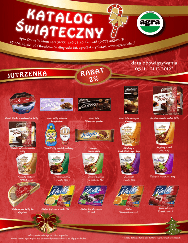 KATALOG ŚwIĄT ECZNY od 1989r. agra Agra Opo 5- 76 le Telefon: +48 (0 45-565 8 (0-77) 453-0 4 + : x fa 7 , 7 0 ) 5 4 8 5 7 6 le.pl O p o l e , ul . Obrońców Stalingradu 66, [email protected], www.agra.opo ra b at 2% JUTRZENKA Bomb. śliwka w czekoladzie 200g Rajskie mleczko wanilia 380g Czek. 100g mleczna Oryginalna Czek. 90g Klasyczna gorzka Czek. 90g marcepan Gorzka Rajskie mleczko czekol 380g Jeżyki Clasic 140g Migdały w Czek.Biał z cyn. 80g Migdały w czek. Ml. 80G Bn 80*30g aniołek, mikołaj św. Orzechy laskowe W biał.Czek Orzechy laskowe w czek. 80g Bakalie mix 200g św. Goplana Galar. Cytryna w czek. 190 data obowiązywania 05.11 - 21.12.2012* Orzechy laskowe w czek.ml. 80g Galar. Cz.Porzeczka W czek oferta ważna do wyczerpania zapasów Firma PURG Agra Opole nie ponosi odpowiedzialności za błędy w druku Rodzynki w czek. 80g Galar. Pomarańcz w czek. Rodzynki w czek.ml. 80g Galar. Wiśnia W czek. 190G * rabaty dotyczą tylko produktów kupowanych do paczek ra b at 3% wawel Bomb. Kasztanki 430g św. Bomb. Malaga 430g św Bomb. Tiki taki 430g św. Bomb. Śliwka W czek. 300G św Bomb. Michałki Zamk. 500g św Bomb. Trufle W czek. 500g św Czek. 100g mleczna z orz. las Czek. 295g Krówkowa św. Michałki zamk 350g Czek. 125g kasztanki św. Czek. 295g Żurawinowa św. Michałki zamk.białe 350g Bomb. Michałki Zamk. Białe 500g Czek. 100g mleczna Z migdała Czek. 125g malaga św. L mieszanka Świąteczna 4*1kg Michałki Kawowe 350g Czek. 125g tiki taki św. Mieszanka krakowska 350g św Trufla biała 350g św. Trufla W czek. 350g św. ra b at 5% SOLIDARNOŚĆ Bomb. Caffe 410g Bomb. Czek. Tajemn. 238g Bomb. Choco-choco 253g Bomb. Czek.Kreacje 245g św Mister ron 180g torba św. Bomb. Oczarowanie 175g Bomb. Pral. Finest select. Bomb. Wiśnie w lik. 203g św Bomb. Wiśnie w lik. 323g Ciast. Maślane. 160g+30g Bomb. Pistachio 410g Bomb. Złota 393g Bomb. Zł czek. Kreacje 228g Galaretki w czekol. 150G Bomb. Choc. Creations 228g Złote praliny 420g torba Mister ron 145g kart. św Bomb. L”amour 235g Gwiazd.Mister Ron 2.5kg św Trufle Świateczne 3kg Gwiazd.Upom. 150g (toffi) Świateczne Zakręcone 2,5k Choco didi 420g torba św. Miesz.Truflowa 180g pacz Bomb. Pistachio 253g Galaretki w cze.200g pacz Krówka mleczna 300g pacz ra b at 3% polonia idc Bałwanek 75g Bombi pomarańcza-gożdziki 45g Bombi jabłko-cynamon Chatka z piernika 232g Choinka 80g Czekoladowy domek 160g Domek królewny Śnieżki 152g Dzwoneczek 40g Dzwonki wiśnia migdał 34g Figurki 16g Happy czekoladowy likier Happy jajaeczny likier Szyszki z likierem 27,5g jajko czekolada Szyszki z likierem 27,5g kokos cappuccino Liqueur dessert Czekolada advocat Miś 75g Szyszki 10,5g Happy mleko Kalendarz adwentowy Mikołaj 40g, 60g, 75g, 110g, 150g, 170g, Liqueur dessert Wiśnia i whisky Liqueur dessert Cappuccino kokos 220g Gradimento Happy orzech Mikołaj tuba 25x16g ra b at 5% mieszko Zozole 2012 muss pomarańcza cytryna Zozole 2012 hello zelo cola 75g Amoretta 324g Ecru Cherrissimo 318g puszka Zozole 2012 shake 75g Zozole 2012 hello zelo sticks 75g Amoretta 324g puszka Cherrissimo white 135g lekki Klejnoty 345g Klejnoty 405g Michaszki 220g Michaszki 250g Zozole 2012 witaminy 75g Zozole 2012 muss jabłko-wiśnia-truskawka 75g Zozole 2012 hello zelo rainbow 75g Amoretta 324g bordo Zozole 2012 muss cola 75g Trufle francuskie 175g czekolada Cherrissimo white 295g lekki Klejnoty 200g Michaszki 260g bn2012 Marcepan 260g bn2012 Zozole kule bn2012 Białe michaszki 220g Twój sekret 324g brąz ra b at 5% Brzydkie a dobre 100g Domowe kruche maślane 400g NOWO DELICPOL Miś w czek. z nadz.trus.126g ŚĆ Party bisz. z gal,135g banan, limon, malina, pomarańcza, róza, szarlotka, truskawka, wiśnia Pierniki gwiazdki w cz.200g Pierniki precle q czek.400g Miś w czek. z nadz.trus. 42g Pierniki gwiazdki z nadz.śli 200g Ptasie ml.wanilia 500g kwadrat Wafle 420g orzechowe, kakaowe, chałwowe, śmietankowe Party wafelistki cocoa, cream 150g Pierniki nadz.w czek.180g Dom.kruche maśl.180g Party cookies, cocoa 120g bakalland* ra b at 5% ra b at 5% Ananas plastry 565g, brzoskwinia 850g, mandarynki 314g puszka ra b at 10% Masa krówkowa 400g x 6szt. Koktail Tropikalny 425g ra b at 10% Masa krówkowokokosowa 400g x 6szt. Masa makowa 850g ra b at 8% ra b at 8% Morela susz. 100g x 16szt ra b at 8% Rodzynki sułtańskie 100g * rabaty dotyczą też detalu ra b at 10% Masa krówkowoorzechowa 400g x 6szt. ra b at 8% su p er cena ra b at 10% Migdał w płatkach 75g x 16szt Mak niebieski 250g ra b at 10% Masa krówkowo-kakaowa 400g x 6szt. Masa krówkowo-truflowa 400g x 6szt. ra b at 8% ra b at 8% Śliwka 100g Migdały Kalifornijskie 100g x 15szt. ra b at 8% Wiórki kokosowe 100g x 12szt ra b at 8% Żurwina 150g ra b at 5% Bomb. Słodki upominek 133g Bomb. Bon ton 185g św. Bon ton 1.2kg św. Disp. Bon ton 1.3kg św. tuba Praliny 1.8kg św. Luz Praliny 800g św. luz But świąteczny 200g pudełko Choinka świąteczna 200g pu Ja i ty mix 200g św. torba Galar. Pomar-frutog 180g Mieszanka klasyczna św 200g Galar. Wiśnia-frutog 180g ODRA/OTMUCHÓ Chałwa sez wan 200g pud. św Chałwa sez z bakal. 200g św Galaretka opol. 2.5kg św. Mikołajki 2kg św. luz Bałwan 100g św. pud. Bombka 120g pud. św. Galaretka Opol. 200g św Iskierki 200g św torba Mikołaj 250g pud. św. Ml. Cappucino 330g Ml. Czekolada 330g Trufle 220g św. Ml. Wanilia 330g W AGA HOLTEX ra b at 7% Mieszanka owoców suszonych 400g ra b at 7% Śliwka kalifornijska 150g Rodzynki sułtanki 200g Morele suszone 150g ra b at 5% Rodzynki królewskie royal 80g Mieszanka studencka 200g Żurawina suszona 100g Migdały płatki 60g ra b at 7% Pistacje prażone solone 80g Migdały całe 80g Tic tac cherry passion Mak niebieski 200g ra b at 3% FERRERO Duplo T1 Wiórki kokosowe 200g Duplo T5 Tic tac intense mint Kinder Delice kakao Tic tac fresh mint Kinder Delice kokos Tic tac orange KRÜGER ra b at 12% ra b at 16% Kakao mix fix 375g tuba ra b at 10% Manner mini wafle orzech,150g Krem pasta duo 3