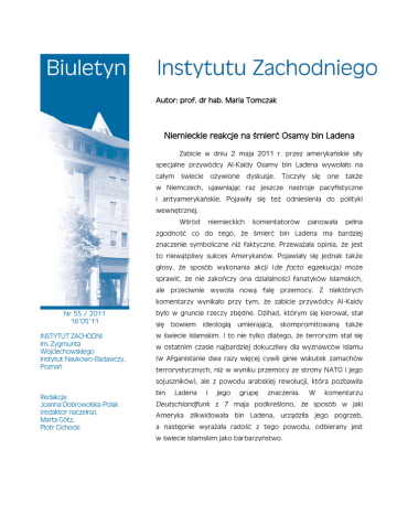 Autor: prof. dr hab. Maria Tomczak Niemieckie reakcje na śmierć Osamy bin Ladena Zabicie w dniu 2 maja 2011 r. przez amerykańskie siły specjalne przywódcy Al-Kaidy Osamy bin Ladena wywołało na całym świecie ożywione dyskusje. Toczyły się one także w Niemczech, ujawniając raz jeszcze nastroje pacyfistyczne i antyamerykańskie. Pojawiły się też odniesienia do polityki wewnętrznej. Wśród niemieckich komentatorów panowała pełna zgodność co do tego, że śmierć bin Ladena ma bardziej znaczenie symboliczne niż faktyczne. Przeważała opinia, że jest to niewątpliwy sukces Amerykanów. Pojawiały się jednak także głosy, że sposób wykonania akcji (de facto egzekucja) może sprawić, że nie zakończy ona działalności fanatyków islamskich, ale przeciwnie wywoła nową falę przemocy. Z niektórych komentarzy wynikało przy tym, że zabicie przywódcy Al-Kaidy Nr 55 / 2011 16„05„11 było w gruncie rzeczy zbędne. Dżihad, którym się kierował, stał INSTYTUT ZACHODNI im. Zygmunta Wojciechowskiego Instytut Naukowo-Badawczy, Poznań w świecie islamskim. I to nie tylko dlatego, że terroryzm stał się się bowiem ideologią umierającą, skompromitowaną także w ostatnim czasie najbardziej dokuczliwy dla wyznawców islamu (w Afganistanie dwa razy więcej cywili ginie wskutek zamachów terrorystycznych, niż w wyniku przemocy ze strony NATO i jego sojuszników), ale z powodu arabskiej rewolucji, która pozbawiła Redakcja: Joanna Dobrowolska-Polak (redaktor naczelna), Marta Götz, Piotr Cichocki bin Ladena i jego grupę znaczenia. W komentarzu Deutschlandfunk z 7 maja podkreślono, że sposób w jaki Ameryka zlikwidowała bin Ladena, urządziła jego pogrzeb, a następnie wyrażała radość z tego powodu, odbierany jest w świecie islamskim jako barbarzyństwo. Pojawiły się ostrzeżenia przed zemstą Al-Kaidy, której ofiarą mogą paść także Niemcy, choć za bardziej prawdopodobne uważano ataki terrorystyczne w Pakistanie czy krajach Maghrebu. Szef Federalnej Służby Informacyjnej BND Ernst Uhrlau, w wywiadzie dla „Hamburger Abendblatt” (7 maja), zwracał uwagę na fakt, że nieżyjący Osama bin Laden może być bardziej niebezpieczny niż żywy. Wskazał też, że największe zagrożenie mogą w tej sytuacji stanowić pojedynczy sprawcy, niezwiązani ściśle ze strukturami terrorystycznymi, działający niejako na własną rękę. Przed zamachami ostrzegł także szef Federalnego Urzędu Kryminalnego (BKA) Jörg Ziercke. Powiedział on, że po śmierci bin Ladena może dojść do realizacji od dawna planowanych akcji. Al-Kaida spróbuje je zrealizować, by udowodnić, że nadal zdolna jest funkcjonować jako organizacja sieciowa. W wywiadzie dla „Süddeutsche Zeitung” (8 maja) zapewnił, że niemieckie służby bezpieczeństwa podwyższyły poziom zabezpieczeń w miejscach najbardziej wrażliwych oraz wzmocniły ochronę osób najbardziej zagrożonych. Szef BKA podkreślił też, że zamach wymierzony w Niemcy jest prawdopodobny. Zwłaszcza że ‟ zgodnie z informacjami uzyskanymi przez tajne służby ‟ wzrasta liczba osób związanych w jakiś sposób z Niemcami, które otrzymały przeszkolenie terrorystyczne w obozach na granicy afgańsko-pakistańskiej. Ich liczba wynosi obecnie równo 250. Uprawdopodobnieniu ewentualnego zamachu służyć mogą także doświadczenia ostatnich tygodni. Już w kwietniu niemieckie służby wpadły na ślad grupy planującej zamachy na publiczny transport podmiejski w jednym z dużych miast (najprawdopodobniej w Düsseldorfie). Aresztowani przyznali, że zostali zwerbowani przez Al-Kaidę. O zagrożeniu, ale także o czujności, czy może nawet pewnym przewrażliwieniu odpowiednich służb, świadczy również zatrzymanie w dniu 6 maja we Freiburgu pociągu ICE z Berlina do Interlaken w Szwajcarii. Powodem było odnalezienie Biuletyn Instytutu Zachodniego • www.iz.poznan.pl 2 w pokładowym bistro płyty CD z napisem „Allah wird uns alle töten” (Allah zabije nas wszystkich). Wielu Niemców wykazuje zdecydowaną niechęć do wszelkiej przemocy, a także potrzebę dystansowania się od USA, co potwierdza dyskusja, jaką wywołała wypowiedź kanclerz Angeli Merkel, wyrażająca radość z zabicia przywódcy Al-Kaidy. Jednym z pierwszych, który zabrał głos w tej sprawie, był kolega partyjny kanclerz, przewodniczący komisji prawnej Bundestagu, Siegried Kauder. W wywiadzie dla „Passauer Neue Presse” podkreślił on, że sam by się tak nie wyraził. Uznał sformułowanie kanclerz za przejaw średniowiecznej ustosunkowała się zemsty. także Do wypowiedzi wiceprzewodnicząca Merkel Bundestagu z ramienia partii Zielonych Katrin Göring-Eckart. Powiedziała ona „Berliner Zeitung”, że jako chrześcijanka może tylko stwierdzić, że celowe zabicie kogoś nie daje powodu do świętowania. Podkreśliła też, że niezależnie od popełnionych przez kogoś czynów, pierwszą intencją nie powinno być zabijanie. Słuszne byłoby raczej ujęcie bin Ladena i postawienie go przed sądem. Byłoby to postępowanie właściwe dla państwa prawa. Także wiceprzewodnicząca frakcji parlamentarnej CDU/CSU Ingrid Fischbach uznała za konieczne zdystansowanie się wobec Merkel. Powiedziała mianowicie, że z chrześcijańskiego punktu widzenia niewłaściwe jest wyrażanie radości z powodu celowego zabicia człowieka (FAZ.NET 7 maja). W podobnym duchu wypowiadali się także niektórzy biskupi. W ramach dyskusji pojawiły się wątpliwości prawne, dotyczące legalności akcji wymierzonej w bin Ladena. Wspomniany już S. Kauder podkreślał, że takie samowolne zabijanie nie jest dozwolone przez prawo międzynarodowe, a także sprzeczne z wolnościami obywatelskimi i politycznymi. A jeśli uwzględnić, że bin Laden od dawna już nie był aktywny, to jego zabicie można uznać za samowolne. Przewodniczący komisji prawne Bundestagu podkreślił również, że zasada cel uświęca środki nie może sta