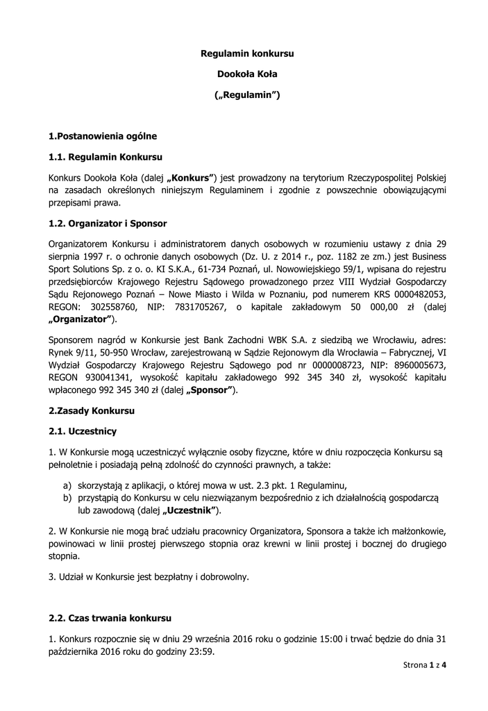 Regulamin konkursu Dookoła Koła („Regulamin”) 1.Postanowienia ogólne 1.1. Regulamin Konkursu Konkurs Dookoła Koła (dalej „Konkurs”) jest prowadzony na terytorium Rzeczypospolitej Polskiej na zasadach określonych niniejszym Regulaminem i zgodnie z powszechnie obowiązującymi przepisami prawa. 1.2. Organizator i Sponsor Organizatorem Konkursu i administratorem danych osobowych w rozumieniu ustawy z dnia 29 sierpnia 1997 r. o ochronie danych osobowych (Dz. U. z 2014 r., poz. 1182 ze zm.) jest Business Sport Solutions Sp. z o. o. KI S.K.A., 61-734 Poznań, ul. Nowowiejskiego 59/1, wpisana do rejestru przedsiębiorców Krajowego Rejestru Sądowego prowadzonego przez VIII Wydział Gospodarczy Sądu Rejonowego Poznań – Nowe Miasto i Wilda w Poznaniu, pod numerem KRS 0000482053, REGON: 302558760, NIP: 7831705267, o kapitale zakładowym 50 000,00 zł (dalej „Organizator”). Sponsorem nagród w Konkursie jest Bank Zachodni WBK S.A. z siedzibą we Wrocławiu, adres: Rynek 9/11, 50-950 Wrocław, zarejestrowaną w Sądzie Rejonowym dla Wrocławia – Fabrycznej, VI Wydział Gospodarczy Krajowego Rejestru Sądowego pod nr 0000008723, NIP: 8960005673, REGON 930041341, wysokość kapitału zakładowego 992 345 340 zł, wysokość kapitału wpłaconego 992 345 340 zł (dalej „Sponsor”). 2.Zasady Konkursu 2.1. Uczestnicy 1. W Konkursie mogą uczestniczyć wyłącznie osoby fizyczne, które w dniu rozpoczęcia Konkursu są pełnoletnie i posiadają pełną zdolność do czynności prawnych, a także: a) skorzystają z aplikacji, o której mowa w ust. 2.3 pkt. 1 Regulaminu, b) przystąpią do Konkursu w celu niezwiązanym bezpośrednio z ich działalnością gospodarczą lub zawodową (dalej „Uczestnik”). 2. W Konkursie nie mogą brać udziału pracownicy Organizatora, Sponsora a także ich małżonkowie, powinowaci w linii prostej pierwszego stopnia oraz krewni w linii prostej i bocznej do drugiego stopnia. 3. Udział w Konkursie jest bezpłatny i dobrowolny. 2.2. Czas trwania konkursu 1. Konkurs rozpocznie się w dniu 29 września 2016 roku o godzinie 15:00 i trwać będzie do dnia 31 października 2016 roku do godziny 23:59. Strona 1 z 4 2. Po zakończeniu Konkursu – w terminie 7 (słownie: siedmiu) dni roboczych od daty zakończenia Konkursu – Komisja wyłoni 20 (dwudziestu) zwycięzców. 2.3. Zasady Konkursu 1. Konkurs jest organizowany za pośrednictwem Internetu, na terytorium Rzeczypospolitej Polskiej, wyłącznie w aplikacji „Dookoła koła” (dalej „Aplikacja”) zamieszczonej na stronie internetowej dostępnej pod adresem http://www.jakjezdzisz.pl/dookolakola/gra. 2. Zadaniem konkursowym Uczestnika jest bezbłędne pokonanie pięciu skrzyżowań typu rondo za pomocą funkcji dostępnych w Aplikacji, a następnie udzielenie odpowiedzi na pytanie otwarte: Która z zasada obowiązujących na rondach jest według Ciebie najważniejsza i dlaczego? 3. Uczestnik może wziąć udział w Konkursie dowolną ilość razy. 4. Uczestnik może wygrać maksymalnie jedną Nagrodę w Konkursie, niezależnie od tego ile razy wziął udział. 5. Uczestnik, który przystąpił do Konkursu i zaakceptował Regulamin jest związany jego postanowieniami oraz zobowiązany do ich przestrzegania. 6. Organizatorowi przysługuje prawo do wykluczenia z udziału w Konkursie Uczestników, którzy naruszają postanowienia niniejszego Regulaminu, a w szczególności: a) zachowują się w sposób sprzeczny z prawem lub dobrymi obyczajami, a zwłaszcza godzą swym zachowaniem w prawa osób trzecich, b) prowadzą działania, co do których zachodzi obiektywnie uzasadnione przypuszczenie, że mogą prowadzić do wpływania na wyłonienie zwycięzcy Konkursu w sposób niedozwolony, prób obejścia Regulaminu lub zabezpieczeń i zasad funkcjonowania Konkursu, c) prowadzą działania naruszające uzasadnione, prawnie chronione interesy Organizatora lub Sponsora lub godzące w ich wizerunek. 2.4. Deklaracja Uczestnika Uczestnik oświadcza, że: 1. Zapoznał się i akceptuje warunki niniejszego Regulaminu, 2. Wyraża zgodę na przetwarzanie swoich danych osobowych, o których mowa w Regulaminie, zgodnie z ustawą z dnia 29 sierpnia 1997 r. o ochronie danych osobowych (Dz. U. z 2014 r., poz. 1182 ze zm.) w celach organizacji i przeprowadzenia Konkursu, poprzez odznaczenie odpowiedniego checkboxu w Aplikacji. 2.5. Dane osobowe 1. Dane osobowe, o których mowa w Regulaminie, przetwarzane są w związku z organizacją i przeprowadzeniem Konkursu przez Organizatora na zasadach określonych w Regulaminie. 2. Podanie danych osobowych przez Uczestnika jest dobrowolne, jednak ich niepodanie uniemożliwia udział w Konkursie, w tym otrzymanie Nagrody. Uczestnik ma prawo wglądu do swoich danych osobowych oraz do ich poprawiania, jak również odwołania zgody na ich przetwarzanie w każdym czasie. Strona 2 z 4 3. Dane osobowe Uczestnika przechowywane są w związku z przeprowadzeniem Konkursu tylko przez okres, jaki wymagają tego obowiązujące przepisy prawa, a po jego zakończeniu zostaną niezwłocznie usunięte. 2.6. Rozstrzygnięcie Konkursu 1. Nagroda zostanie przyznana Uczestnikowi, który bezbłędnie pokona wszystkich pięć skrzyżowań typu rondo za pomocą funkcji dostępnych w Aplikacji, a następnie udzieli najciekawszej, w ocenie Komisji, odpowiedzi na pytanie otwarte. 2. Łącznie w Konkursie wyłonionych zostanie 20 (słownie: dwudziestu) zwycięzców. 3. Nad prawidłowością przeprowadzenia Konkursu będzie czuwała Komisja Konkursowa (dalej i powyżej jako „Komisja”). Komisja składać się będzie z trzech osób wskazanych przez Organizatora. Zadaniem Komisji, poza kwestiami wskazanymi wprost w Regulaminie, będzie również czuwanie nad prawidłowym przebiegiem Konkursu. 3. Nagroda 1. Nagrodą główną w konkursie dla osoby, która w ocenie Komisji Konkursowej udzieli najciekawszej odpowiedzi, jest kamera sportowa GoPro Hero Session 4 o wartości 740 zł. Pozostałych 19 (dziewiętna