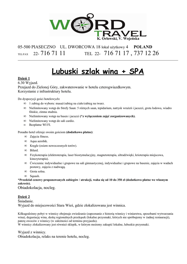 K. Orłowski, V. Wojeńska 05-500 PIASECZNO UL. DWORCOWA 18 lokal użytkowy 4 TEL/FAX 22- 716 71 11 TEL 22- POLAND 716 71 17 , 737 12 26 Lubuski szlak wina + SPA Dzień 1 6.30 Wyjazd. Przejazd do Zielonej Góry, zakwaterowanie w hotelu czterogwiazdkowym. Korzystanie z infrastruktury hotelu. Do dyspozycji gości hotelowych: • 1 zabieg do wyboru: masaż/zabieg na ciało/zabieg na twarz. • Nielimitowany wstęp do Strefy Saun: 5 różnych saun, tepidarium, natrysk wrażeń i jacuzzi, grota lodowa, wiadro fińskie, zimna studnia. • Nielimitowany wstęp na basen i jacuzzi (*z wyłączeniem zajęć zorganizowanych). • Nielimitowany wstęp do sali cardio. • Bezpłatne WI FI. Ponadto hotel oferuje swoim gościom (dodatkowo płatne): • Zajęcia fitness. • Aqua aerobik. • Kręgle (osiem nowoczesnych torów). • Bilard. • Fizykoterapia (elektroterapia, laser biostymulacyjny, magnetoterapia, ultradźwięki, krioterapia miejscowa, kinezyterapia). • Ćwiczenia: indywidualne i grupowe na sali gimnastycznej, indywidualne i grupowe na basenie, zajęcia w wadach postawy, zajęcia z nadwagą. • Grota solna. • Squash. *Przedział cenowy proponowanych zabiegów / atrakcji, waha się od 10 do 350 zł (dodatkowo płatne we własnym zakresie). Obiadokolacja, nocleg. Dzień 2 Śniadanie. Wyjazd do miejscowości Stara Wieś, gdzie zlokalizowana jest winnica. Kilkugodzinny pobyt w winnicy obejmuje zwiedzanie (zapoznanie z historią winnicy i winiarstwa, sposobami wytwarzania wina), degustację wina, deskę regionalnych przekąsek (lokalne przysmaki, których nie spróbujemy w żadnej restauracji), paterę owoców z winnicy (w zależności od terminu przyjazdu). W winnicy zlokalizowany jest również sklepik, w którym możemy zakupić lokalne, lubuskie przysmaki. Wyjazd z winnicy. Obiadokolacja, relaks na terenie hotelu, nocleg. * (zamiast wizyty w winnicy możemy spędzić cały dzień w hotelu, korzystając z jego infrastruktury). Dzień 3 Śniadanie. Korzystanie z infrastruktury hotelu. LUB Spacer po starówce zielonogórskiej z wizytą w palmiarni. Zielonogórska Palmiarnia cenna jest nie tylko dzięki unikatowej prezentacji egzotycznych roślin. Palmiarnia to przede wszystkim część historii miasta i zielonogórskiej tradycji. Park Winny, na którym jest zlokalizowana, sąsiaduje od strony południowej z zabytkowym zespołem przemysłowym dawnego zakładu włókienniczego „Polska Wełna” (obecnie jest duże Centrum Handlowe.) Od strony południowo - wschodniej znajduje się zabytkowa zabudowa jednorodzinna z początku XX wieku. Od północnego wschodu otacza go teren usługowo-administracyjny oraz duży parking. Północne otoczenie to tereny usługowo-mieszkaniowe wraz ze starówką. Jednak to nie przypadek, że Palmiarnia powstała na Winnym Wzgórzu…… Obiad w Zielonej Górze (we własnym zakresie). *Istnieje możliwość zamówienia obiadu dla całej grupy – dodatkowy koszt 40zł od osoby. Wyjazd z hotelu. 21.00 – 22.00 Powrót do miejsca wyjazdu. JEŻELI SĄ PAŃSTWO ZAINTERESOWANI BOGATSZYM PROGRAMEM INTEGRACYJNYM MOŻEMY ZAPROPONOWAĆ DODATKOWO WIECZOREK Z UROCZYSTĄ KOLACJĄ I MUZYKĄ DJ’a, LUB TURNIEJ KRĘGLOWY Z KOLACJĄ. KOSZTORYS PRZEDSTAWIMY PO UWZGLĘDNIENIU PAŃSTWA PREFERENCJI. Świadczenia: -przejazd lux autokarem marki np. Volvo, Mercedes, Bova, Eos, Man z wc, barkiem, klimatyzacją -ubezpieczenie NW i KL -opieka pilota -zakwaterowanie w hotelu **** www.DanaSPA.pl pokoje 2 os (pok. 1 os za dopłatą + 150 zł) Pakiet obejmuje: 2 noclegi w pokoju dwuosobowym 2 obiadokolację Pakiet rozpoczyna się obiadokolacją w dniu przyjazdu i kończy śniadaniem w dniu wyjazdu. -Wyżywienie – śniadania, obiadokolacje wg programu -VAT Cena: 850 zł /min 40 os + dodatkowo bilety wstępu, w przypadku wybrania opcji z winnicą od 160 zł do 200zł W celu podpisania umowy i rezerwacji terminu prosimy o telefon do biura 022 716 71 11 lub 022 716 71 17 lub mail [email protected] Zaliczka konieczna do podpisania umowy