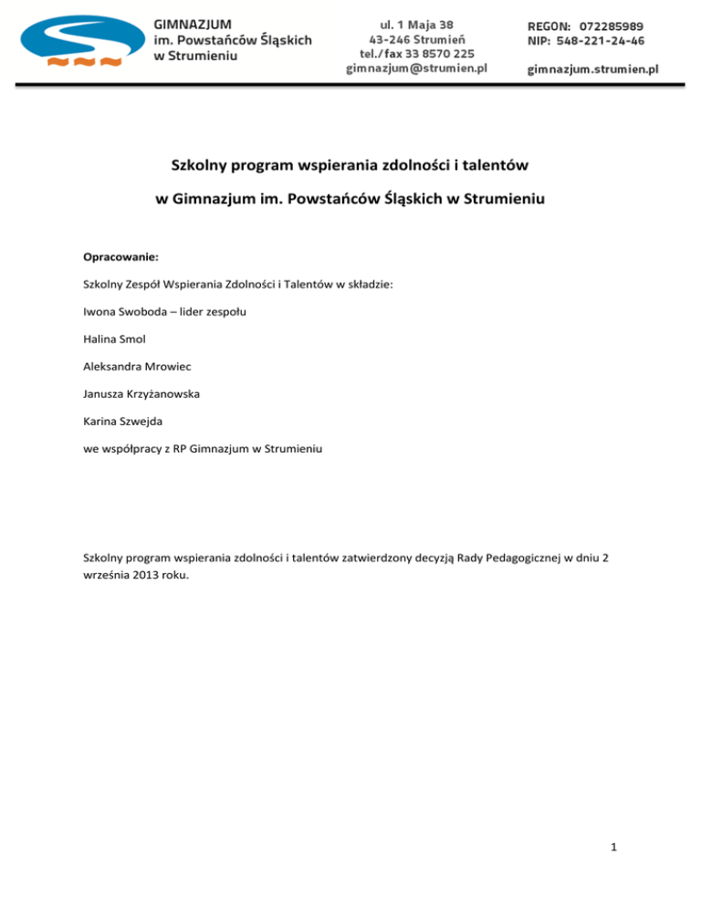 Szkolny program wspierania zdolności i talentów w Gimnazjum im. Powstańców Śląskich w Strumieniu Opracowanie: Szkolny Zespół Wspierania Zdolności i Talentów w składzie: Iwona Swoboda – lider zespołu Halina Smol Aleksandra Mrowiec Janusza Krzyżanowska Karina Szwejda we współpracy z RP Gimnazjum w Strumieniu Szkolny program wspierania zdolności i talentów zatwierdzony decyzją Rady Pedagogicznej w dniu 2 września 2013 roku. 1 Gimnazjum w Strumieniu od wielu lat rozwija zdolności i talenty uczniów. Nasi wychowankowie biorą udział i odnoszą sukcesy w konkursach szkolnych i międzyszkolnych, w turniejach i zawodach sportowych. Wielu z nich uczestniczy w konkursach artystycznych: plastycznych i muzycznych. Oferta zajęć pozalekcyjnych kierowana jest dla całej społeczności szkolnej. Staramy się jak najwcześniej diagnozować predyspozycje i uzdolnienia naszych uczniów odpowiadając na ich potrzeby rozwoju intelektualnego, artystycznego, sportowego czy też społecznego. Prężnie działa szkolne koło wolontariatu, pracujące przy szkolnym zespole socjoterapeutycznym. W szkole w ramach wspierania sportu funkcjonują klasy sportowe, które pomagają w rozwijaniu talentów i osiąganiu wysokich wyników w rywalizacji sportowej. Uczniowie mają do dyspozycji nowoczesną multimedialną pracownię fizyczno chemiczną, dzięki której wzbogacona została oferta edukacyjna i metody pracy w zakresie nauk ścisłych. Działa szkolny chór „Canzonetta”, który jest naszą wielką dumą, jego chórzyści występują na największych salach koncertowych, rozsławiają nasze gimnazjum nie tylko w kraju, ale i poza jego granicami. Szkoła promuje osiągnięcia uczniów, na naszej stronie internetowej zamieszczamy wszystkie sukcesy indywidualne i zespołowe. Podczas szkolnych apeli podsumowujących pracę w danym semestrze dyrekcja wyróżnia najzdolniejszych, promuje osiągnięcia klasowe. Tradycją naszej szkoły jest przyznawanie statuetek najlepszego absolwenta i sportowca. Przykłady systemowych działań na rzecz uczniów zdolnych podejmowanych w roku szkolnym 2012/2013 Zaoferowanie uczniom bogatej oferty zajęć pozalekcyjnych (kółka przedmiotowe, artystyczne, sportowe- SKS, piłkarska Liga Gimnazjalna, turniej piłki plażowej, chór „Canzonetta”; różnorakie projekty edukacyjne w ramach Europejskiego Tygodnia Sportu oraz projekt transgraniczny „Śląsk - nasza wspólna ojczyzna”). Organizacja Powiatowego Konkursu Ortograficznego „ Strumieńska Żaba”, wyjść do kina i teatru, wydawanie prac uczniów w formie kalendarza, broszur, upowszechnianie dokonań na stronie internetowej. Sposoby pracy z uczniem zdolnym, w tym ciekawe metody i formy pracy Organizacja warsztatów teatralnych w Szczyrku z udziałem instruktorów tańca i aktorów Teatru Polskiego z Bielska-Białej. Prowadzenie zajęć w formie warsztatów w ramach „Projektu Krokus”, który pozwala na zapoznanie uczniów z tematyką Holokaustu i rozbudza świadomość niebezpieczeństw wiążących się z dyskryminacją i nietolerancją. Klasy II i III brały udział w wycieczkach edukacyjnych do Centrum Nauki Kopernik w Warszawie. 2 Przykłady indywidualizacji i różnicowania treści, metod, form pracy z uczniem zdolnym Uczniowie zdolni w ramach lekcji i zajęć pozalekcyjnych mogą liczyć na indywidualne traktowanie, otrzymują rozszerzone treści kształcenia, motywowani są do samodzielnej pracy; ich osiągnięcia nagradzane są zgodnie z WSO, ponadto umożliwia się im prezentacje osiągnięć, efektów pracy i wyników konkursowej rywalizacji, zajęcia dostosowane są do potrzeb uczniów, współpraca obejmuje również ich rodziców. Duży nacisk kładzie się na metody aktywizujące, techniki ułatwiające porządkowanie i zapamiętywanie wiedzy oraz jej praktyczne wykorzystanie, np. w formie doświadczeń. W szkole uczniowie mają wiele okazji do publicznych występów, gdyż nasza szkoła jest ważnym ogniwem oferty kulturalnej miasteczka, np. tradycyjnie większość wywiadówek wzbogacona jest o występy artystyczne młodzieży. W ciągu minionego roku szkolnego powołaliśmy Szkolny Zespół Wspierania Zdolności i Talentów w skład, którego wchodzą przewodniczący szkolnych zespołów przedmiotowych. Wybraliśmy lidera naszego zespołu. Wspólnie opracowaliśmy szkolny program wspierania zdolności i talentów uczniów. Korzystając z naszych dobrych i sprawdzonych doświadczeń, napisaliśmy program, który został przedstawiony na Radzie Pedagogicznej w dniu 2 września 2013r. 3 SZKOLNY PROGRAM WSPIERANIA ZDOLNOŚCI I TALENTÓW Wersja na rok szkolny 2013/2014 1. KONCEPCJA PROGRAMU I SPOSÓB REALIZACJI Szkolny Program Wspierania Zdolności i Talentów realizowany będzie w trzyletnim okresie z możliwością modyfikacji w kolejnych latach szkolnych. Jego wdrożenie następuje w roku szkolnym 2013/2014. Program zawiera sposób osiągania celów kształcenia i zadań, które wynikają z realizacji podstawy programowej poszczególnych przedmiotów na etapie gimnazjum oraz zapewnia poznanie treści ponadprogramowych, które umożliwią szybszy rozwój uczniów i wyposażą ich w większy zakres wiedzy i umiejętności. Program zawiera informacje o sposobach identyfikacji zdolności, zasadach obowiązujących w realizacji programu, podstawowych zadaniach dyrektora i poszczególnych członków Rady Pedagogicznej, sposobach promowania ucznia osiągającego sukcesy. Realizacja programu odbywać się będzie w trakcie lekcji, w ramach kół przedmiotowych, zajęciach sportowych, próbach chóru, w ramach realizacji godzin z art. 42 ust. 2 pkt 2 Karty Nauczyciela i dodatkowych z inicjatywy nauczycieli. 2. CELE PROGRAMU: Wszechstronny rozwój ucznia poprzez wspieranie i rozwijanie uzdolnień przedmiotowych uczniów: - matematyczno – przyrodniczych, - humanistycznych, - artystycznych, - sportowych. Diagnozowanie szczególnych uzdolnień uczniów. Utrzymanie wysokiego poziomu kształc