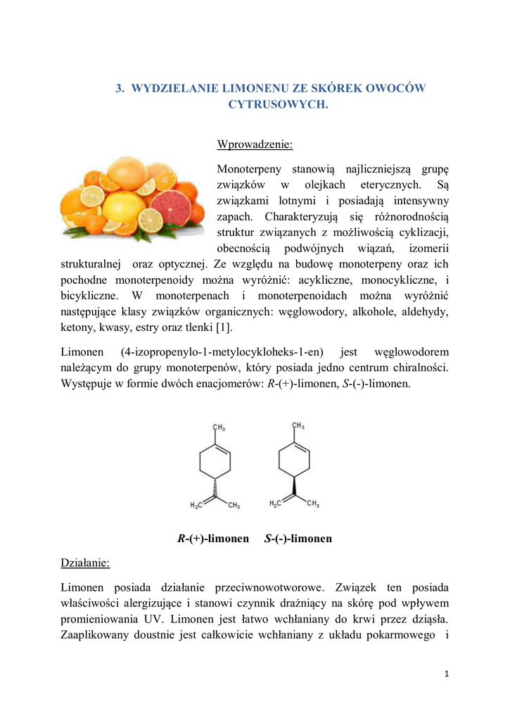 3. WYDZIELANIE LIMONENU ZE SKÓREK OWOCÓW CYTRUSOWYCH. Wprowadzenie: Monoterpeny stanowią najliczniejszą grupę związków w olejkach eterycznych. Są związkami lotnymi i posiadają intensywny zapach. Charakteryzują się różnorodnością struktur związanych z możliwością cyklizacji, obecnością podwójnych wiązań, izomerii strukturalnej oraz optycznej. Ze względu na budowę monoterpeny oraz ich pochodne monoterpenoidy można wyróżnić: acykliczne, monocykliczne, i bicykliczne. W monoterpenach i monoterpenoidach można wyróżnić następujące klasy związków organicznych: węglowodory, alkohole, aldehydy, ketony, kwasy, estry oraz tlenki [1]. Limonen (4-izopropenylo-1-metylocykloheks-1-en) jest węglowodorem należącym do grupy monoterpenów, który posiada jedno centrum chiralności. Występuje w formie dwóch enacjomerów: R-(+)-limonen, S-(-)-limonen. R-(+)-limonen S-(-)-limonen Działanie: Limonen posiada działanie przeciwnowotworowe. Związek ten posiada właściwości alergizujące i stanowi czynnik drażniący na skórę pod wpływem promieniowania UV. Limonen jest łatwo wchłaniany do krwi przez dziąsła. Zaaplikowany doustnie jest całkowicie wchłaniany z układu pokarmowego i 1 gwałtownie dystrybuowany do różnych tkanek organizmu ciała. Limonen jest łatwo metabolizowany [2, 3]. Zastosowanie: Limonen stosowany jest w przemyśle chemicznym do produkcji środków: odtłuszczających powierzchnie metalowe, czyszczących w przemyśle elektronicznym, do produkcji oraz komponentów zapachowych w produktach chemii gospodarczej. Wykorzystywany jest również w przemyśle spożywczym (dodatek smakowy, aromat), przemyśle kosmetycznym i perfumeryjnym [4]. Przeciwskazania: Alergia na owoce cytrusowe. Aparatura, szkło kolba okrągłodenna wyparka rotacyjna Odczynniki dichlorometan woda bezwod. siarczan magnezu drobno pokrojone skórki owoców cytrusowych Drobno pokrojone skórki (bez białej części) z dwóch pomarańczy lub z jednego grejpfruta albo trzech cytryn umieszcza się w kolbie 500 ml, dodaje się około 150 ml wody i destyluje z parą wodną. Po uzyskaniu 50-60 ml destylatu ekstrahuje się go trzykrotnie 15 ml porcjami dichlorometanu. Połączone ekstrakty przemywa się wodą i suszy nad bezwodnym siarczanem magnezu. Środek suszący odsącza się. Usunięcie rozpuszczalnika na wyparce rotacyjnej daje prawie czysty limonen, który się waży i oblicza wydajność oraz wykonuje się pomiar współczynnik załamania światła nD20. BIBLIOGRAFIA [1] M. Tryk, R. Paduch, J. Fiedurek. Monoterpeny – stare związki, nowe zastosowanie i biotechnologiczne metody ich otrzymywania. Biotechnologia, 2007, 1(76), 135-155. 2 [2] M. Matura, M. Sköld, A. Börje, K. E. A. M. Bruze , P. Frosch, A. Goossens. Not only oxidized R-(+)- but also S-(-)-limonene is a common cause of contact allergy in dermatitis patients in Europe. Contact Dermatitis, 2006, 55(5), 274-279. [3] A. W. Weitkamp. The Action of Sulfur on Terpenes. The Limonene Sulfides. J Am Chem Soc, 1959, 81 (13), 3430–3434 [4] http://www.biochemiaurody.com/slownik/orangeoil.html [dostęp: 04-10-2015] [5] P. Kafarski, P. Wieczorek. Ćwiczenia laboratoryjne z chemii bioorganicznej. 1997, str. 68. 3