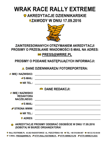 WRAK RACE RALLY EXTREME AKREDYTACJE DZIENNIKARSKIE ZAWODY W DNIU 17.09.2016 ZAINTERESOWANYCH OTRZYMANIEM AKREDYTACJI PROSIMY O PRZESŁANIE WIADOMOŚCI E-MAIL NA ADRES: [email protected] PROSIMY O PODANIE NASTĘPUJĄCYCH INFORMACJI: DANE DZIENNIKARZA/ FOTOREPORTERA: IMIĘ I NAZWISKO: E-MAIL: NR TEL.: _______________________________________ _______________________________________ _______________________________________ DANE REDAKCJI: IMIĘ I NAZWISKO REDAKTORA NACZELNEGO: E-MAIL: STRONA WWW: NR TEL.: ADRES: _______________________________________ _______________________________________ _______________________________________ _______________________________________ _______________________________________ AKREDYTACJE PROSIMY ODEBRAĆ OSOBIŚCIE W DNIU 17.09.2016 (SOBOTA) W BIURZE ORGANIZATORA! RALLYEXTREME.PL 43-262 RADOSTOWICE UL. PSZCZYŃSKA 198 E-MAIL: [email protected] HTTP://RALLYEXTREME.PL TEL. +48 516-004-007 HTTP://WRRE.PL/FB +48 32 212-54-00 HTTP://WRRE.PL/DOC