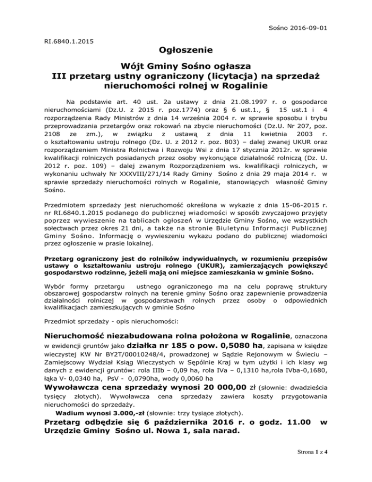 Sośno 2016-09-01 RI.6840.1.2015 Ogłoszenie Wójt Gminy Sośno ogłasza III przetarg ustny ograniczony (licytacja) na sprzedaż nieruchomości rolnej w Rogalinie Na podstawie art. 40 ust. 2a ustawy z dnia 21.08.1997 r. o gospodarce nieruchomościami (Dz.U. z 2015 r. poz.1774) oraz § 6 ust.1., § 15 ust.1 i 4 rozporządzenia Rady Ministrów z dnia 14 września 2004 r. w sprawie sposobu i trybu przeprowadzania przetargów oraz rokowań na zbycie nieruchomości (Dz.U. Nr 207, poz. 2108 ze zm.), w związku z ustawą z dnia 11 kwietnia 2003 r. o kształtowaniu ustroju rolnego (Dz. U. z 2012 r. poz. 803) – dalej zwanej UKUR oraz rozporządzeniem Ministra Rolnictwa i Rozwoju Wsi z dnia 17 stycznia 2012r. w sprawie kwalifikacji rolniczych posiadanych przez osoby wykonujące działalność rolniczą (Dz. U. 2012 r. poz. 109) – dalej zwanym Rozporządzeniem ws. kwalifikacji rolniczych, w wykonaniu uchwały Nr XXXVIII/271/14 Rady Gminy Sośno z dnia 29 maja 2014 r. w sprawie sprzedaży nieruchomości rolnych w Rogalinie, stanowiących własność Gminy Sośno. Przedmiotem sprzedaży jest nieruchomość określona w wykazie z dnia 15-06-2015 r. nr RI.6840.1.2015 podanego do publicznej wiadomości w sposób zwyczajowo przyjęty poprzez wywieszenie na tablicach ogłoszeń w Urzędzie Gminy Sośno, we wszystkich sołectwach przez okres 21 dni, a także na stronie Biuletynu Informacji Publicznej Gminy Sośno. Informację o wywieszeniu wykazu podano do publicznej wiadomości przez ogłoszenie w prasie lokalnej. Przetarg ograniczony jest do rolników indywidualnych, w rozumieniu przepisów ustawy o kształtowaniu ustroju rolnego (UKUR), zamierzających powiększyć gospodarstwo rodzinne, jeżeli mają oni miejsce zamieszkania w gminie Sośno. Wybór formy przetargu ustnego ograniczonego ma na celu poprawę struktury obszarowej gospodarstw rolnych na terenie gminy Sośno oraz zapewnienie prowadzenia działalności rolniczej w gospodarstwach rolnych przez osoby o odpowiednich kwalifikacjach zamieszkujących w gminie Sośno Przedmiot sprzedaży - opis nieruchomości: Nieruchomość niezabudowana rolna położona w Rogalinie, oznaczona w ewidencji gruntów jako działka nr 185 o pow. 0,5080 ha, zapisana w księdze wieczystej KW Nr BY2T/00010248/4, prowadzonej w Sądzie Rejonowym w Świeciu – Zamiejscowy Wydział Ksiąg Wieczystych w Sępólnie Kraj w tym użytki i ich klasy wg danych z ewidencji gruntów: rola IIIb – 0,09 ha, rola IVa – 0,1310 ha,rola IVba-0,1680, łąka V- 0,0340 ha, PsV - 0,0790ha, wody 0,0060 ha Wywoławcza cena sprzedaży wynosi 20 000,00 zł (słownie: dwadzieścia tysięcy złotych). Wywoławcza cena sprzedaży zawiera nieruchomości do sprzedaży. Wadium wynosi 3.000,-zł (słownie: trzy tysiące złotych). koszty przygotowania Przetarg odbędzie się 6 października 2016 r. o godz. 11.00 Urzędzie Gminy Sośno ul. Nowa 1, sala narad. w Strona 1 z 4 Dla ww. nieruchomości nie obowiązuje miejscowy plan zagospodarowania przestrzennego. Zgodnie ze Studium Uwarunkowań i Kierunków Zagospodarowania Przestrzennego Gminy Sośno, nieruchomość znajduje się w strefie funkcjonalnoprzestrzennej III oznaczonej jako rolniczo-leśna. W odniesieniu do przedmiotowej nieruchomości nie wpłynęły wnioski roszczeniowe byłych właścicieli i nie toczy się postępowanie roszczeniowe w stosunku do w/w nieruchomości. Nieruchomości nie obciążają długi i ograniczenia w rozporządzaniu własnością. W przetargu mogą uczestniczyć wyłącznie rolnicy indywidualni, w rozumieniu przepisów UKUR, zamierzający powiększyć gospodarstwo rodzinne, jeżeli mają miejsce zamieszkania w gminie Sośno, spełniający warunki, o których mowa poniżej: 1. Rolnicy indywidualni spełniający warunki określone w UKUR: W przetargu mogą wziąć udział osoby fizyczne, które są rolnikami indywidualnymi w rozumieniu art. 6 UKUR tj. osoby, które spełniają łącznie następujące warunki: - są właścicielami, użytkownikami wieczystymi, samoistnymi posiadaczami lub dzierżawcami nieruchomości rolnych, których łączna powierzchnia użytków rolnych - z uwzględnieniem powierzchni użytków rolnych wchodzących w skład nieruchomości będącej przedmiotem przetargu - nie przekracza 300 ha, - posiadają kwalifikacje rolnicze określone w art. 6 ust. 2 pkt 2 UKUR oraz w rozporządzeniu ws. kwalifikacji rolniczych, - co najmniej od 5 lat zamieszkują w gminie, na obszarze której jest położona jedna z nieruchomości rolnych wchodzących w skład prowadzonego przez nie gospodarstwa rolnego oraz prowadzą przez ten okres osobiście to gospodarstwo (pracują w tym gospodarstwie oraz podejmują wszelkie decyzje dotyczące prowadzenia działalności rolniczej w tym gospodarstwie), - mają miejsce zamieszkania w gminie Sośno. Rolnicy indywidualni spełniający warunki określone w UKUR ubiegający się o zakwalifikowanie do uczestnictwa w przetargu zobowiązani są do przedłożenia następujących dokumentów: oświadczenie, poświadczone przez wójta (burmistrza, prezydenta miasta), o osobistym prowadzeniu gospodarstwa rolnego oraz o łącznej powierzchni użytków rolnych wchodzących w skład gospodarstwa rodzinnego (wzór 1); jeżeli gospodarstwo położone jest na terenie więcej niż jednej gminy, należy złożyć zaświadczenie o wielkości użytków ze wszystkich gmin, na terenie których leżą użytki rolne wchodzące w skład gospodarstwa, oświadczenie o łącznej powierzchni użytków rolnych stanowiących własność, użytkowanych wieczyście oraz będących w samoistnym posiadaniu, a także dzierżawionych przez rolnika indywidualnego (wzór 1a), oświadczenie poświadczające uzyskane kwalifikacje rolnicze wraz z uwierzytelnionymi kopiami dowodów potwierdzających ich spełnienie (wzór 2); dowodem potwierdzającym posiadanie kwalifikacji rolniczych mogą być również odpowiednie dokumenty wydane przez właściwe organy lub instytucje państw członkowskich europejskiego obszar