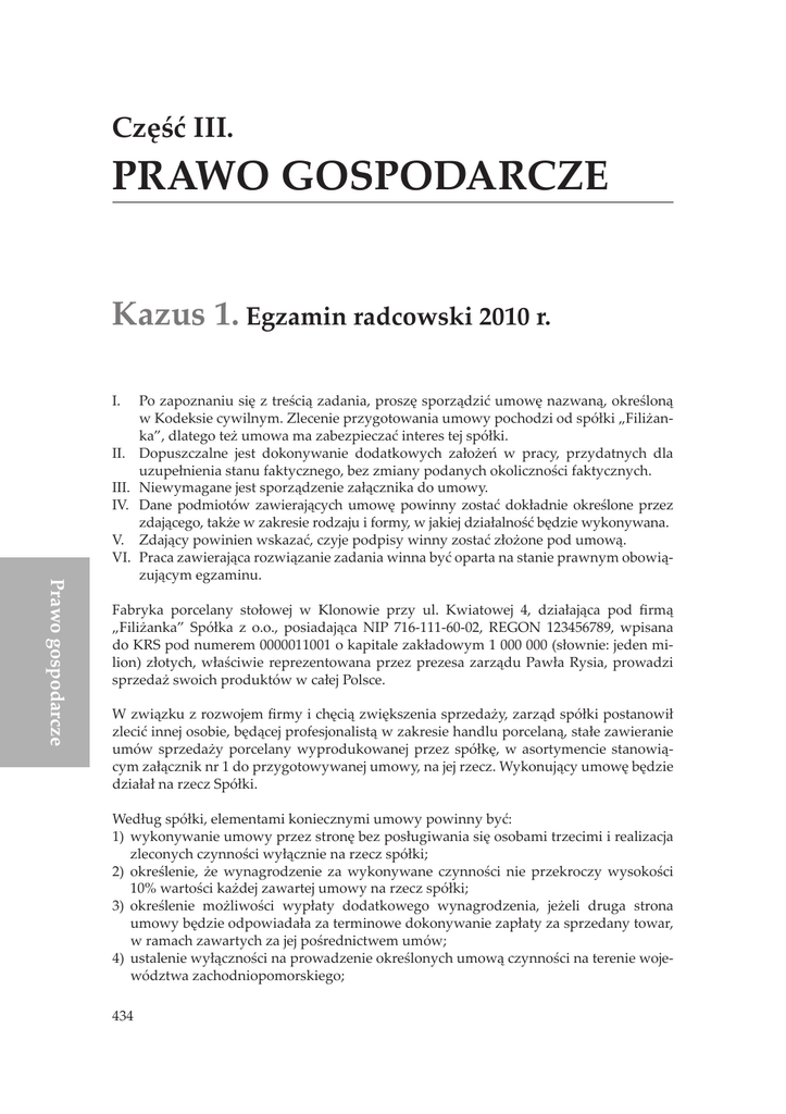 Część III. PRAWO GOSPODARCZE Kazus 1. Egzamin radcowski 2010 r. I. II. III. IV. V. VI. Prawo gospodarcze o zapoznaniu się z treścią zadania, proszę sporządzić umowę nazwaną, określoną P w Kodeksie cywilnym. Zlecenie przygotowania umowy pochodzi od spółki „Filiżanka”, dlatego też umowa ma zabezpieczać interes tej spółki. Dopuszczalne jest dokonywanie dodatkowych założeń w pracy, przydatnych dla uzupełnienia stanu faktycznego, bez zmiany podanych okoliczności faktycznych. Niewymagane jest sporządzenie załącznika do umowy. Dane podmiotów zawierających umowę powinny zostać dokładnie określone przez zdającego, także w zakresie rodzaju i formy, w jakiej działalność będzie wykonywana. Zdający powinien wskazać, czyje podpisy winny zostać złożone pod umową. Praca zawierająca rozwiązanie zadania winna być oparta na stanie prawnym obowiązującym egzaminu. Fabryka porcelany stołowej w Klonowie przy ul. Kwiatowej 4, działająca pod firmą „Filiżanka” Spółka z o.o., posiadająca NIP 716-111-60-02, REGON 123456789, wpisana do KRS pod numerem 0000011001 o kapitale zakładowym 1 000 000 (słownie: jeden milion) złotych, właściwie reprezentowana przez prezesa zarządu Pawła Rysia, prowadzi sprzedaż swoich produktów w całej Polsce. W związku z rozwojem firmy i chęcią zwiększenia sprzedaży, zarząd spółki postanowił zlecić innej osobie, będącej profesjonalistą w zakresie handlu porcelaną, stałe zawieranie umów sprzedaży porcelany wyprodukowanej przez spółkę, w asortymencie stanowiącym załącznik nr 1 do przygotowywanej umowy, na jej rzecz. Wykonujący umowę będzie działał na rzecz Spółki. Według spółki, elementami koniecznymi umowy powinny być: 1) wykonywanie umowy przez stronę bez posługiwania się osobami trzecimi i realizacja zleconych czynności wyłącznie na rzecz spółki; 2) określenie, że wynagrodzenie za wykonywane czynności nie przekroczy wysokości 10% wartości każdej zawartej umowy na rzecz spółki; 3) określenie możliwości wypłaty dodatkowego wynagrodzenia, jeżeli druga strona umowy będzie odpowiadała za terminowe dokonywanie zapłaty za sprzedany towar, w ramach zawartych za jej pośrednictwem umów; 4) ustalenie wyłączności na prowadzenie określonych umową czynności na terenie województwa zachodniopomorskiego; 434 Kazus 1. Egzamin radcowski 2010 r. Prawo gospodarcze 5) zobowiązanie wykonującego umowę, poza zawieraniem umów na rzecz spółki, do wyszukiwania klientów, z którymi można zawrzeć umowy, prowadzenia działalności marketingowej, przekazywania próbek, prospektów i innych materiałów reklamowych, doręczania ofert i ich zbierania, przekazywania wszelkich informacji mających znaczenie dla zwiększenia sprzedaży; 6) umieszczenie zastrzeżenia przewidującego ograniczenie działalności, polegające na zakazie sprzedaży porcelany przez osobę wykonującą umowę, po jej rozwiązaniu przez okres 2 lat; 7) wskazanie czasu obowiązywania umowy i kwestii związanych z jej wypowiedzeniem. 435 Część III. Prawo gospodarcze Propozycja rozwiązania Umowa agencyjna zawarta w Warszawie 29.11.2010 r. („Umowa”), pomiędzy: 1. Spółką pod firmą „Filiżanka” Spółka z ograniczoną odpowiedzialnością z siedzibą w Klonowie przy ulicy Kwiatowej 4, zarejestrowaną w rejestrze przedsiębiorców Krajowego Rejestrze Sądowym pod numerem KRS 0000011001, NIP 716-111-60-02, REGON 123456789, o kapitale zakładowym 1 000 000 (jeden milion) złotych, reprezentowana przez prezesa zarządu Pawła Rysia – upoważnionego, zgodnie z aktualnym odpisem z KRS stanowiącym Załącznik nr 2 do Umowy, do jednoosobowej reprezentacji spółki, zwaną dalej „Spółką” a Prawo gospodarcze 2. Anną S., zamieszkałą w Warszawie (00–180) przy ul. Miłej 1, prowadzącą działalność gospodarczą pod nazwą Przedsiębiorstwo Handlowo–Usługowe Anna S., w Warszawie (00–013) przy ul. Jasnej 1, wpisaną do ewidencji działalności gospodarczej prowadzonej przez Prezydenta m.st. Warszawy pod numerem 111111, NIP 333–333–33–33, zaświadczenie z ewidencji działalności gospodarczej stanowi Załącznik nr 3 do Umowy, zwaną dalej „Agentem” zwanych dalej łącznie „Stronami” a osobno „Stroną”. Zważywszy, że: 1) Spółka prowadzi działalność w zakresie produkcji i sprzedaży porcelany użytkowej; 2) Spółka postanowiła zlecić innej osobie, będącej profesjonalistą w zakresie handlu porcelaną, stałe zawieranie umów sprzedaży porcelany wyprodukowanej przez Spółkę; 3) Agent posiada wiedzę i umiejętności pozyskania nowych klientów dla Spółki; Strony postanowiły zawrzeć niniejszą Umowę o następującej treści: § 1. Przedmiot umowy 1. Spółka zleca, a Agent zobowiązuje się, w zakresie działalności swojego przedsiębiorstwa, za wynagrodzeniem, do stałego zawierania w imieniu i na rzecz Spółki umów sprzedaży porcelany użytkowej wyprodukowanej przez Spółkę, w asortymencie stanowiącym Załącznik nr 1 do Umowy. 2. Agent jest uprawniony do zawierania umów w imieniu Spółki oraz do odbierania oświadczeń dla Spółki. 436 Kazus 1. Egzamin radcowski 2010 r. 3.Agent jest upoważniony do przyjmowania dla dającego zlecenie zapłaty za świadczenie, które spełnia za dającego zlecenie, oraz do przyjmowania dla niego świadczeń, za które płaci, jak również do odbierania zawiadomień o wadach oraz oświadczeń dotyczących wykonania umowy, którą zawarł w imieniu dającego zlecenie. § 3. Zobowiązania stron 1.Agent jest zobowiązany wykonywać Umowę osobiście i nie jest uprawniony do wykonywania Umowy przy pomocy osób trzecich. 2.Agent, poza wykonywaniem czynności o których mowa w § 1 ust. 1 Umowy, zobowiązany jest do: 1)wyszukiwania klientów z którymi Spółka mogłaby zawrzeć umowy sprzedaży porcelany, 2) prowadzenia działalności marketingowej, 3)przekazywania próbek, prospektów i innych materiałów 